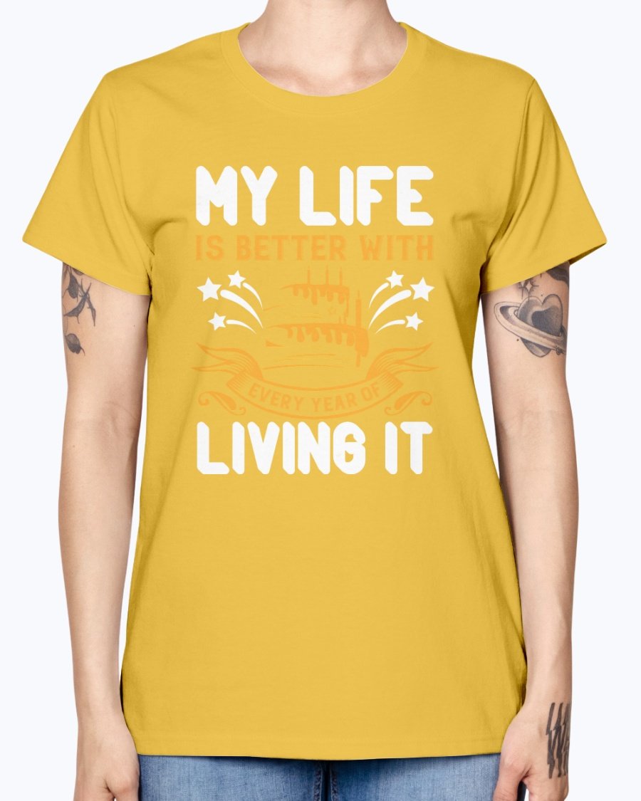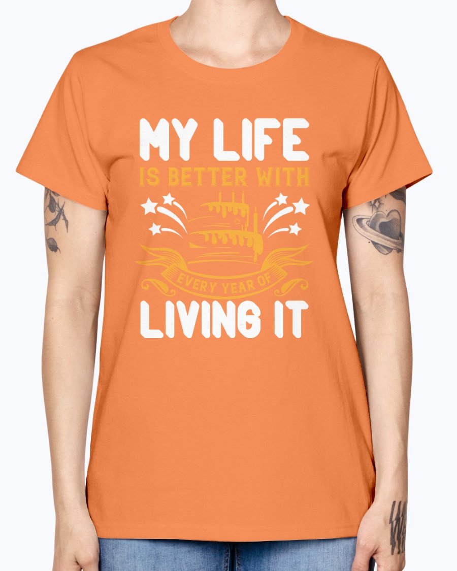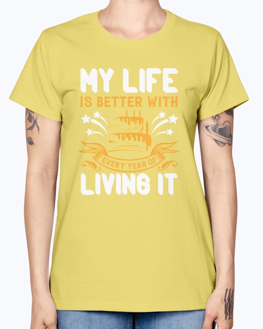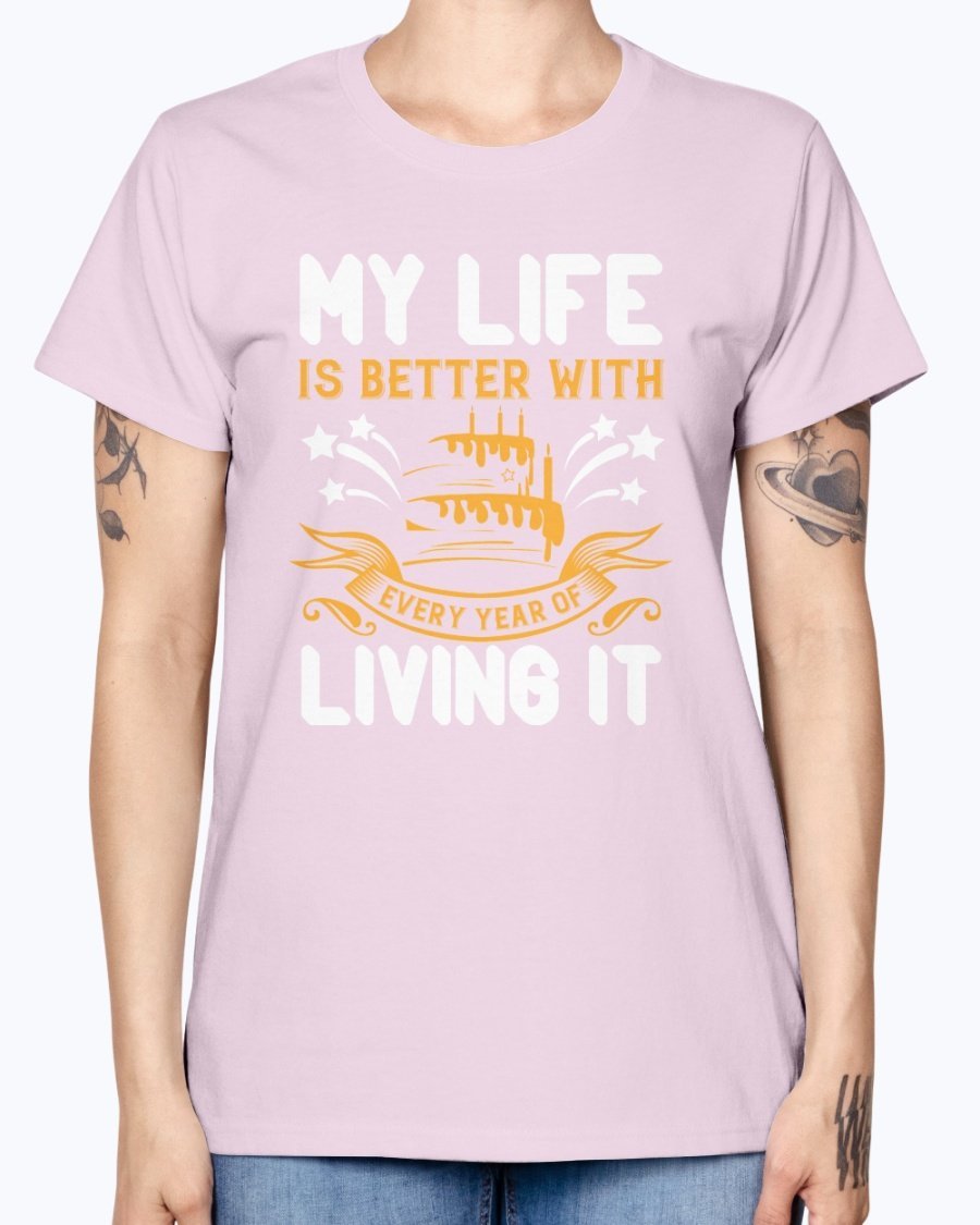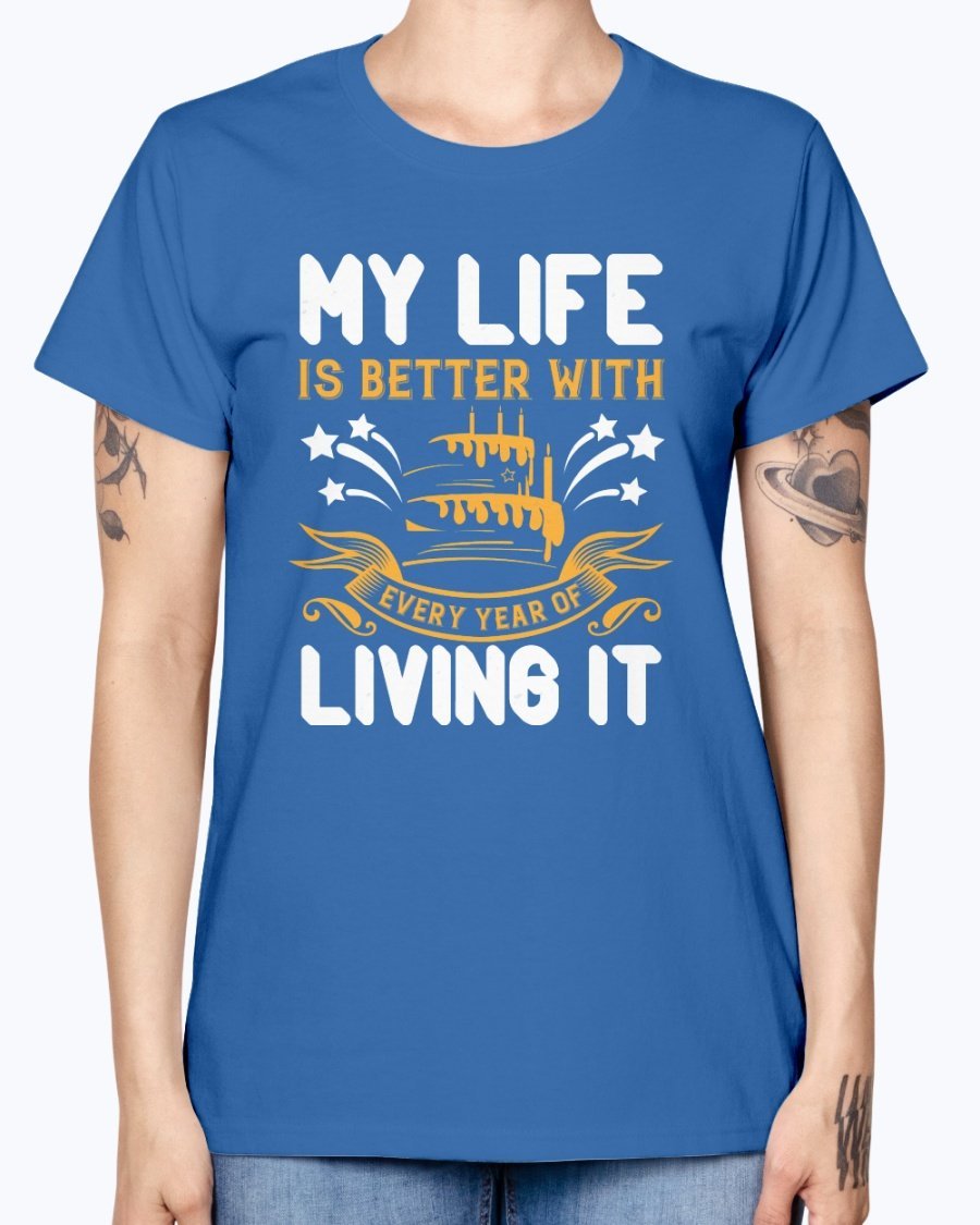 In summary, the 'My life is better with every year of living it' Birthday T-shirt is not just a piece of clothing; it's a celebration of life and all the wonderful moments that come with it. With its comfortable fit, stylish design, and quality material, this T-shirt is a must-have for anyone looking to celebrate their birthday in style.
