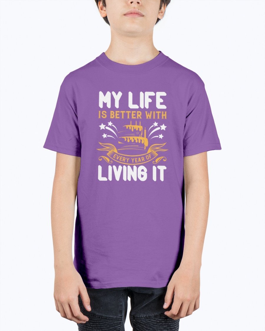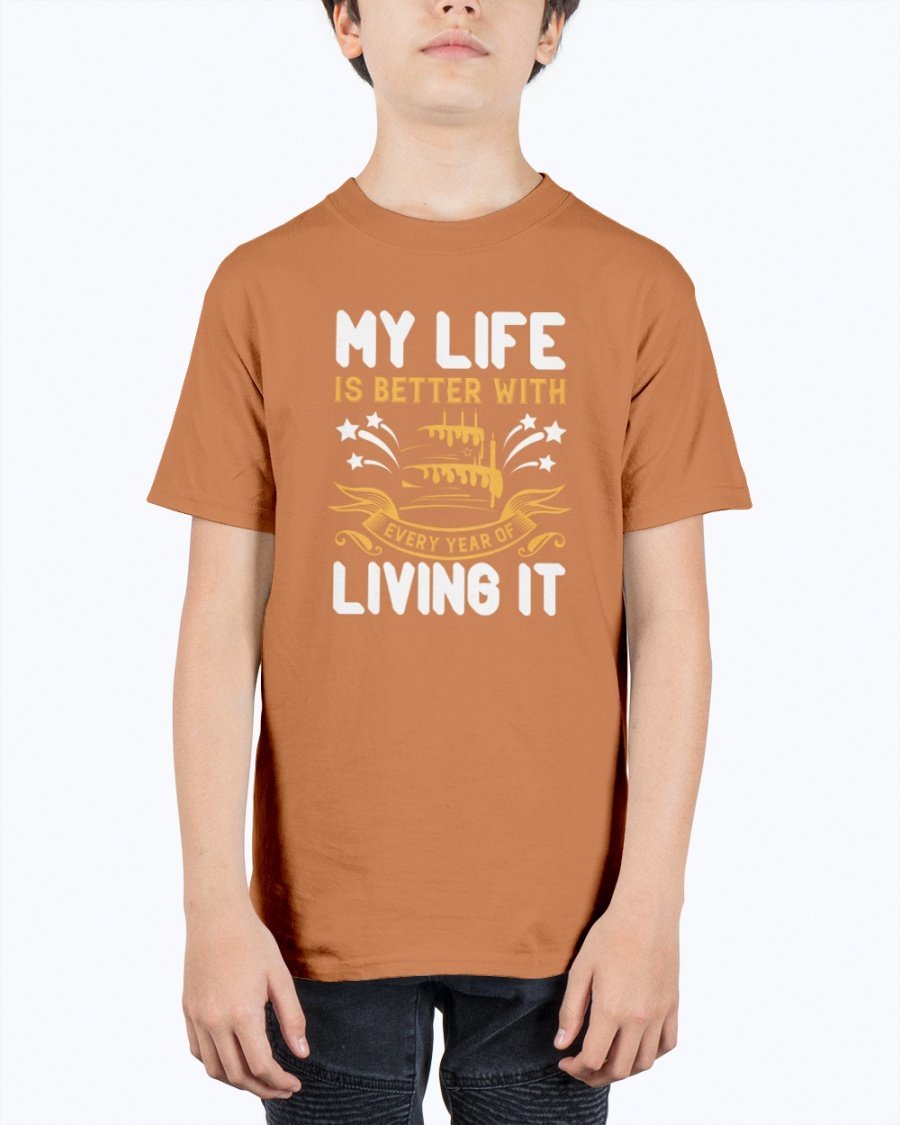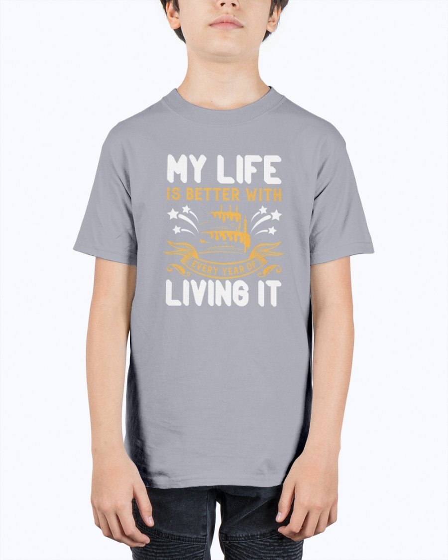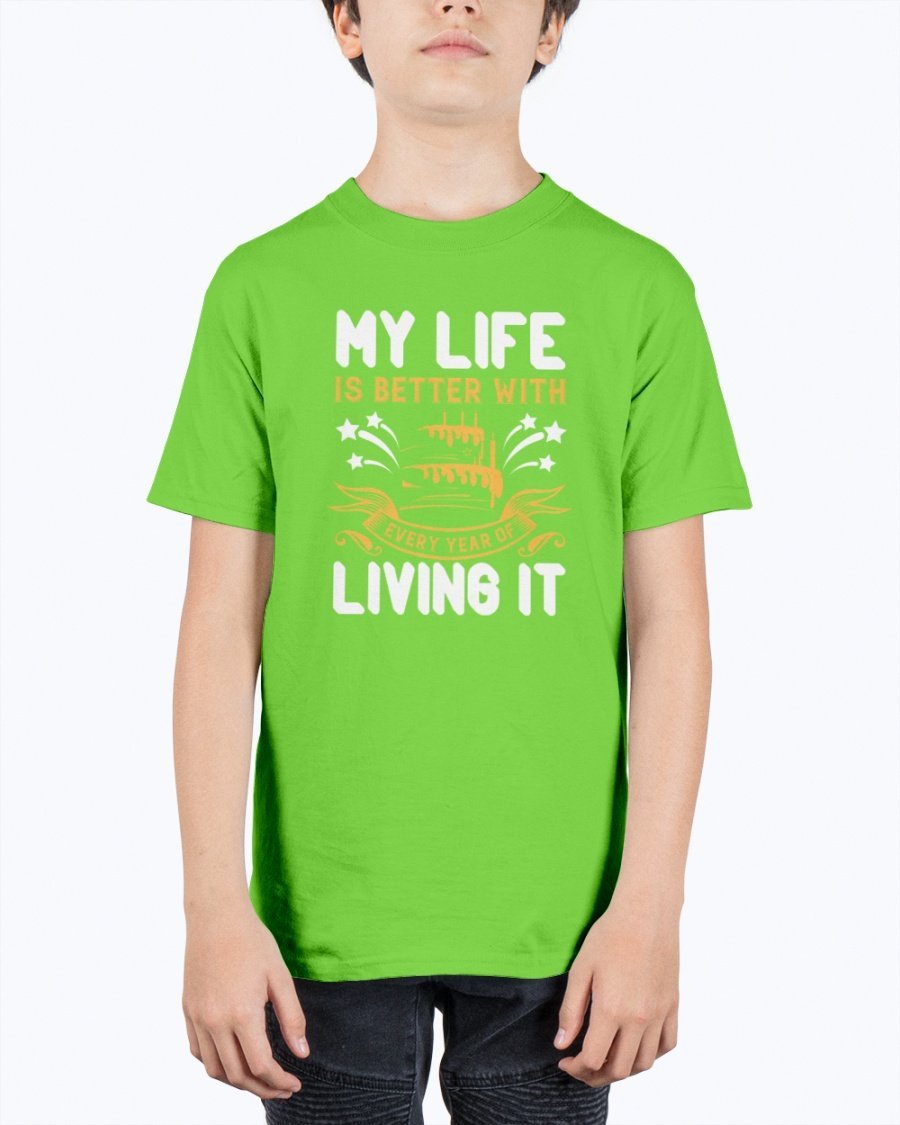 In summary, the 'My Life is Better with Every Year of Living It' Birthday Youth Tee is a fantastic addition to any child's wardrobe. With its inspirational message, quality materials, and thoughtful design, it's perfect for celebrating birthdays and everyday adventures alike. Order yours today and let your child wear their positivity proudly!