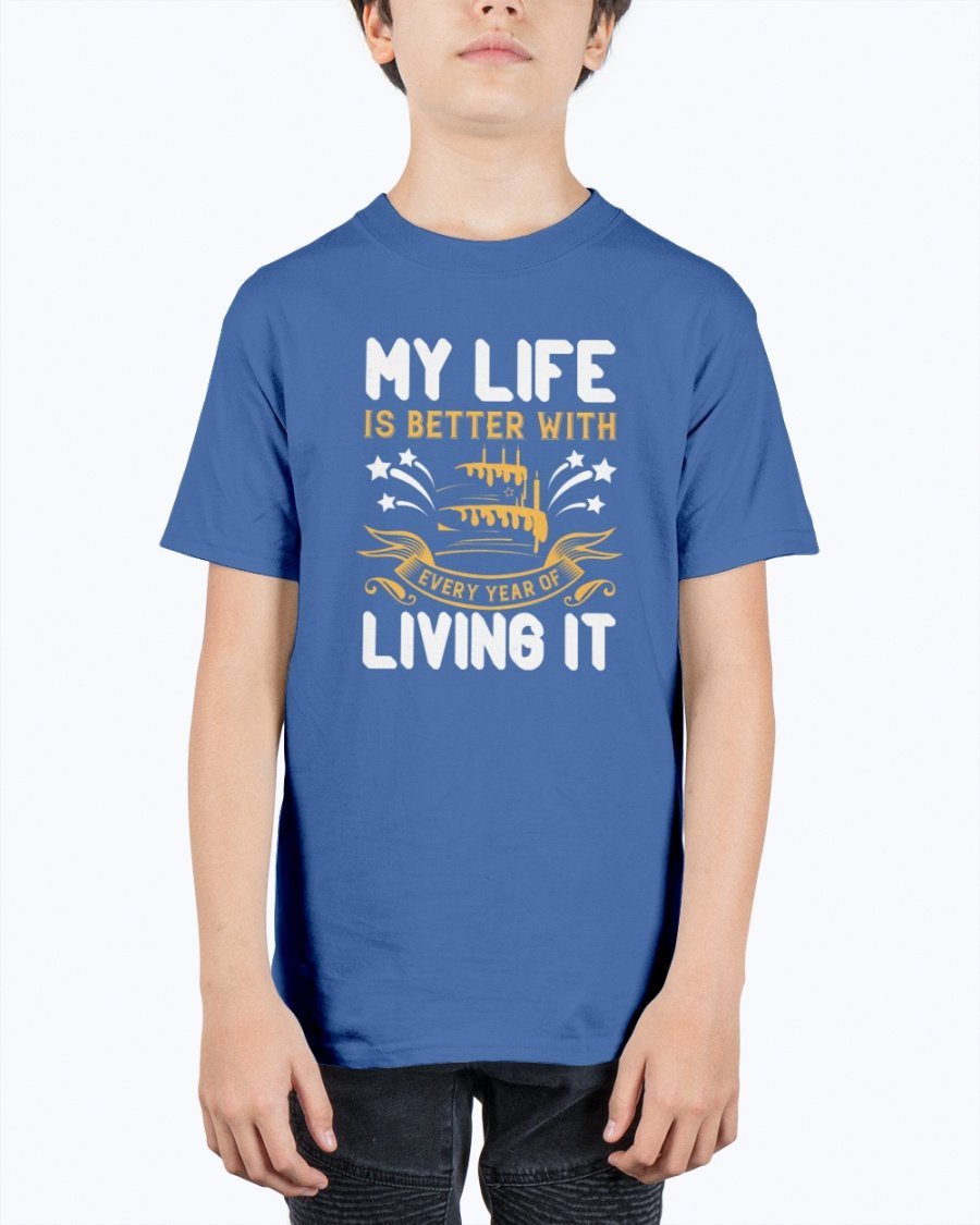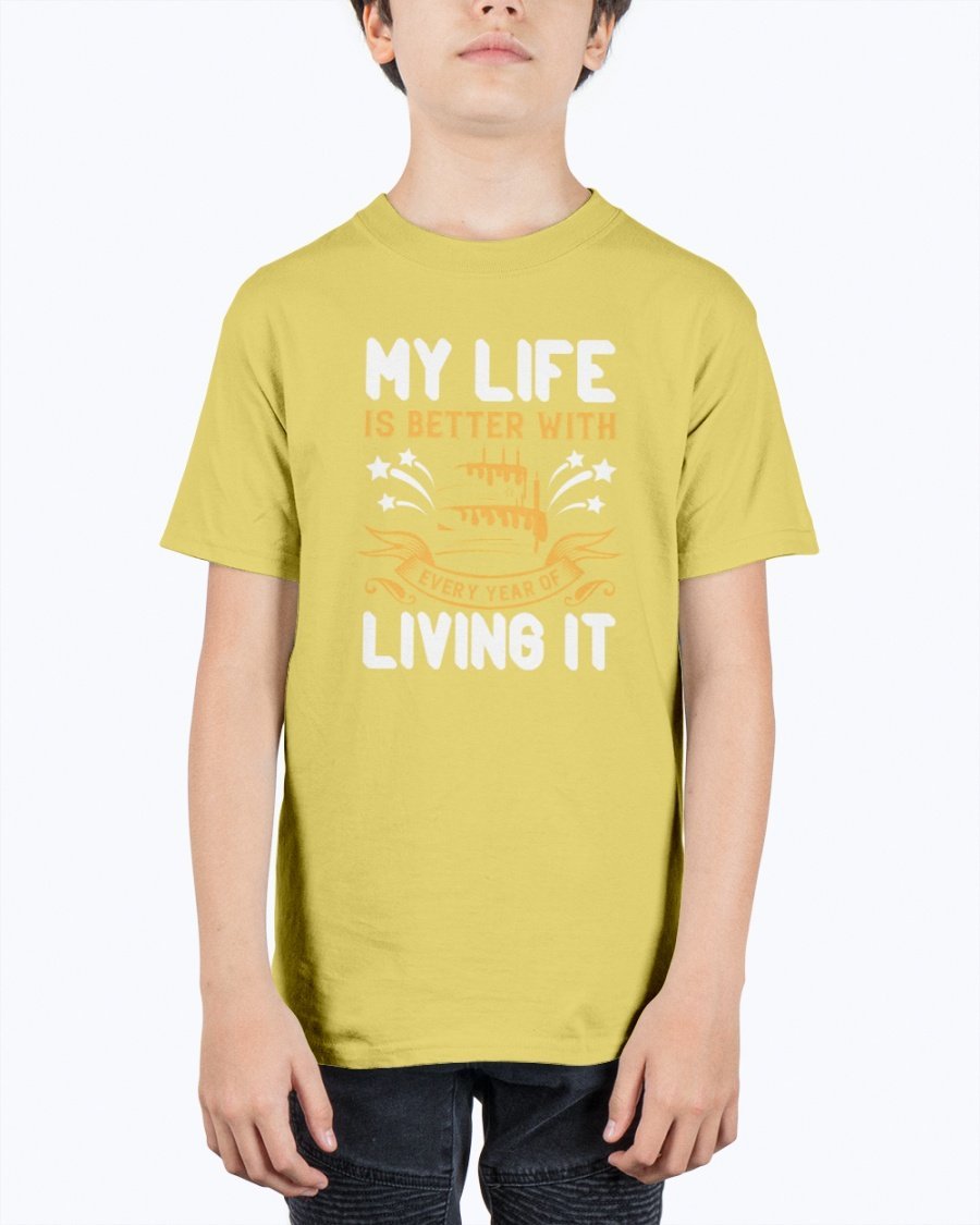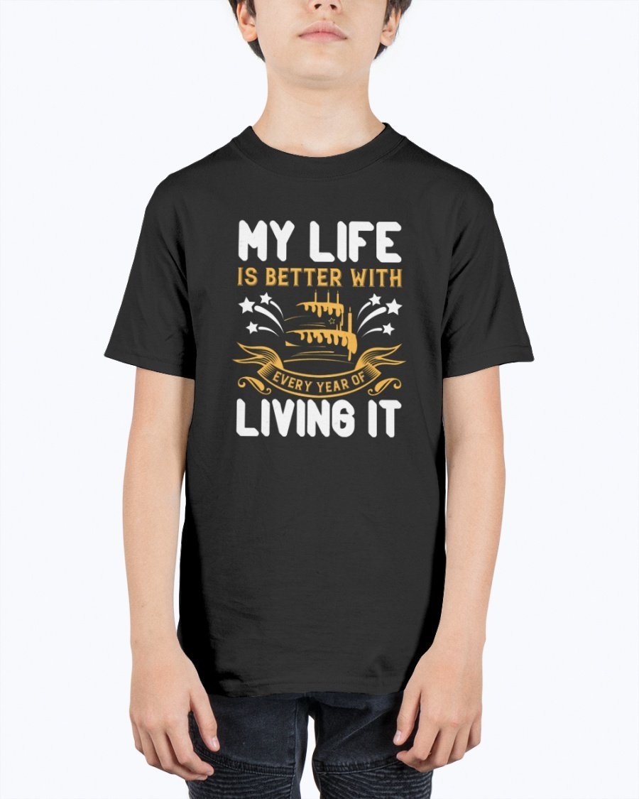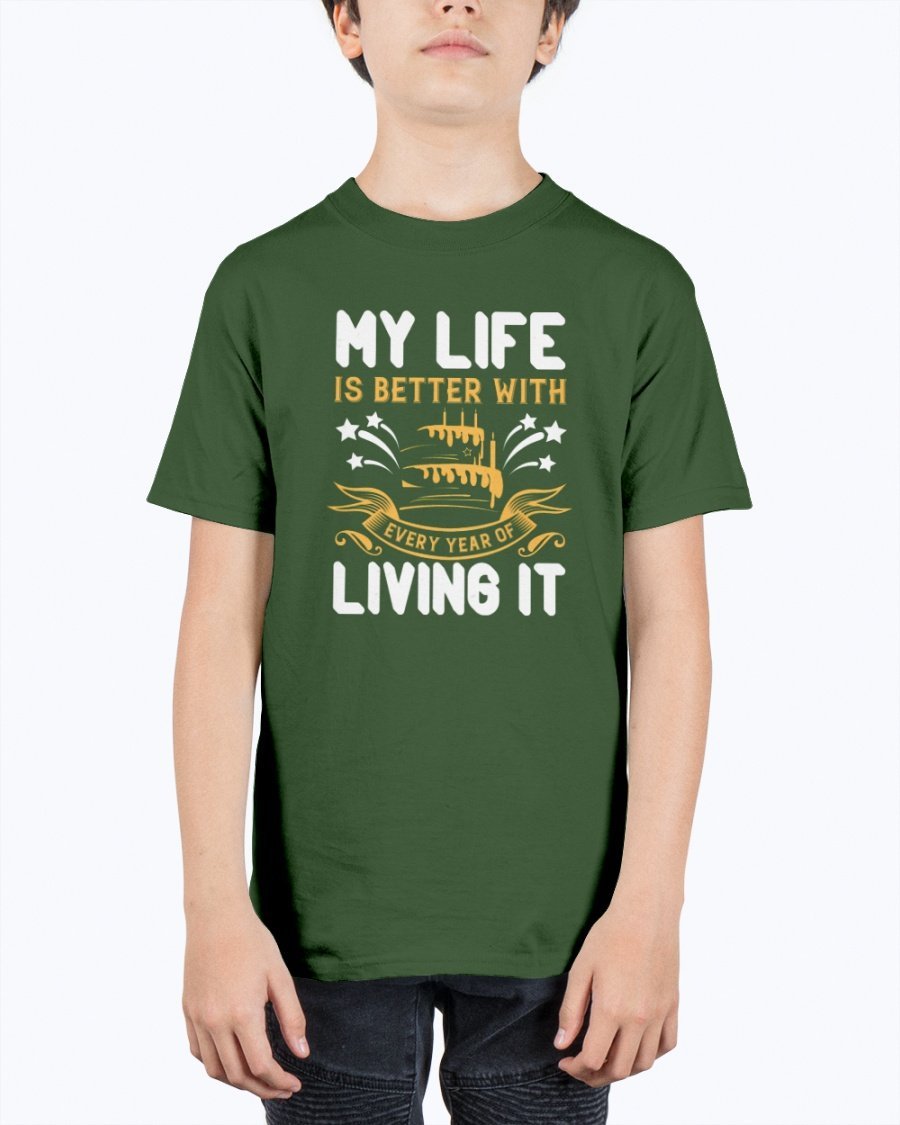 In summary, the 'My Life is Better with Every Year of Living It' Birthday Youth Tee is a fantastic addition to any child's wardrobe. With its inspirational message, quality materials, and thoughtful design, it's perfect for celebrating birthdays and everyday adventures alike. Order yours today and let your child wear their positivity proudly!