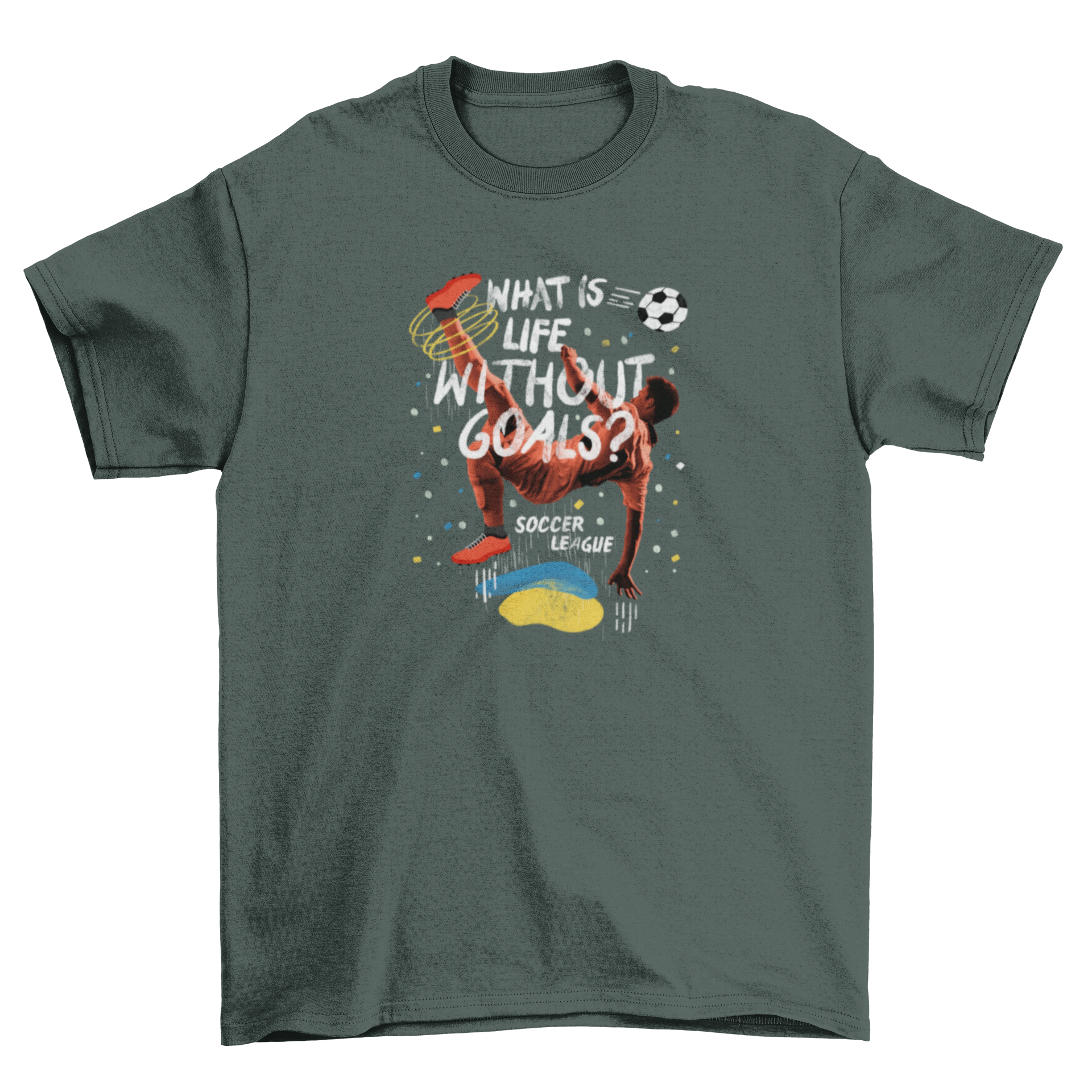 Introducing our Nice Photographic Sports t-shirt, a must-have for soccer lovers and anyone who appreciates the beautiful game. This unique t-shirt features a stunning photographic collage of a soccer player, capturing the essence of the sport in a visually striking way. The accompanying quote, 'What is life without goals?', adds an inspirational touch that resonates with athletes and dreamers alike.