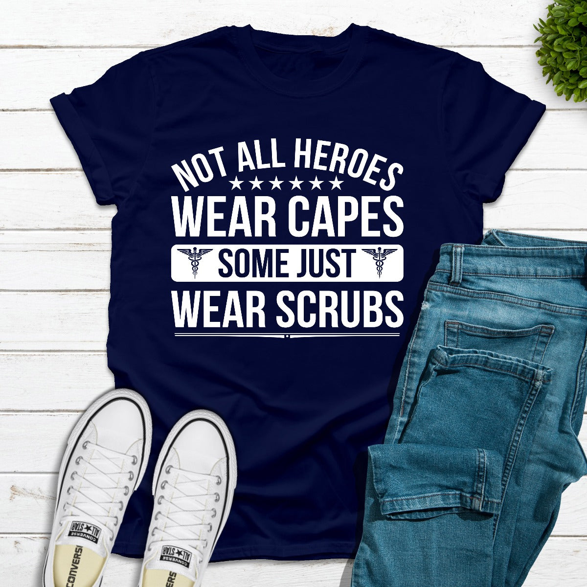 A soft cotton t-shirt featuring the phrase 'Not All Heroes Wear Capes Some Just Wear Scrubs', ideal for healthcare professionals.