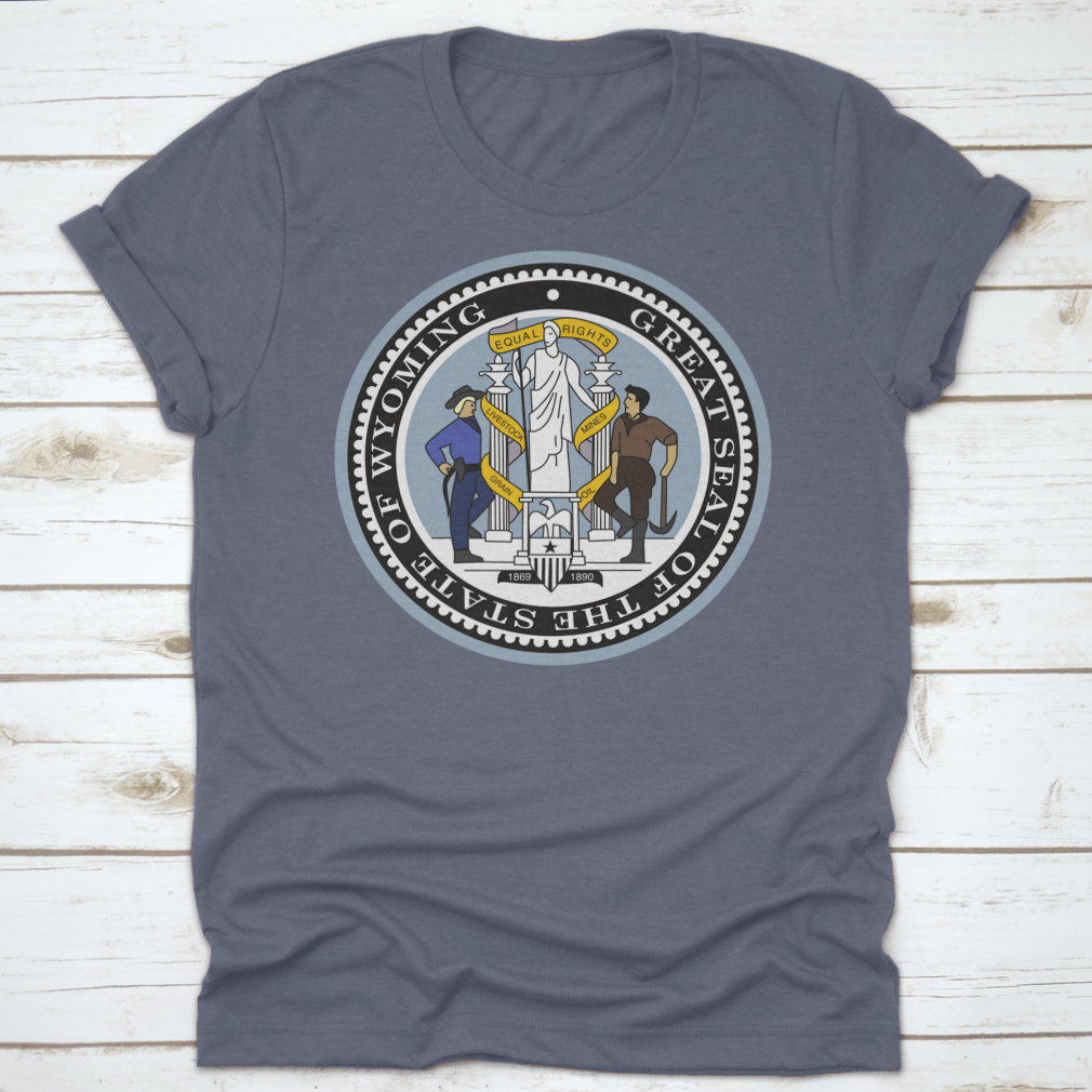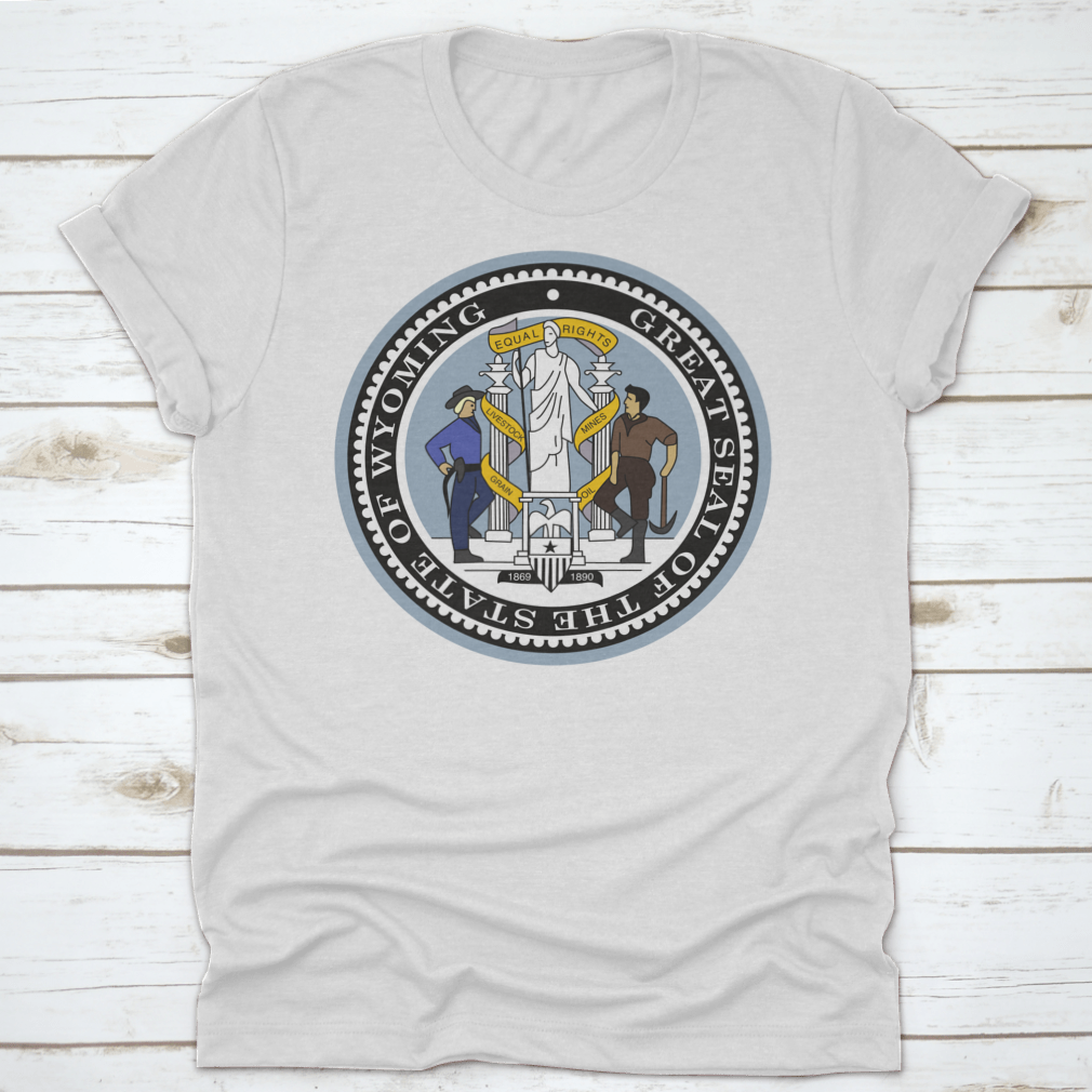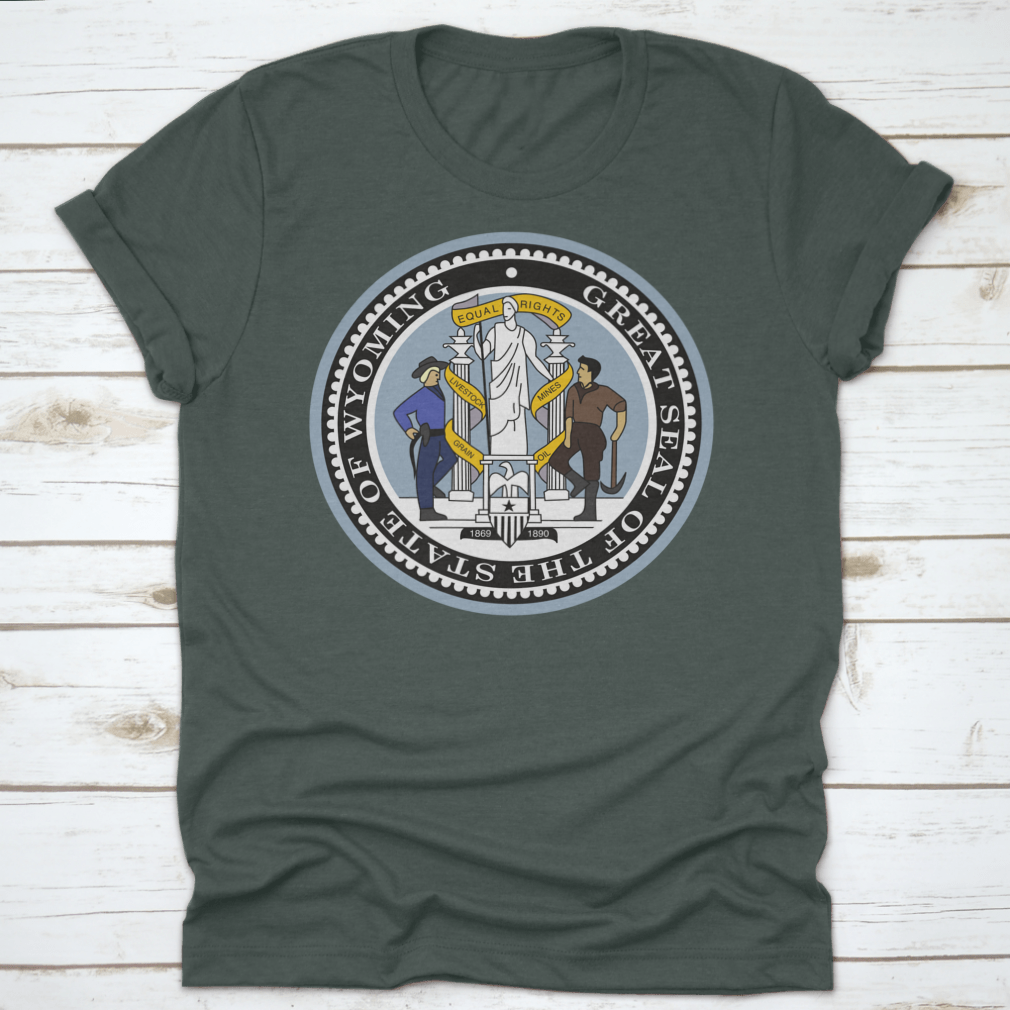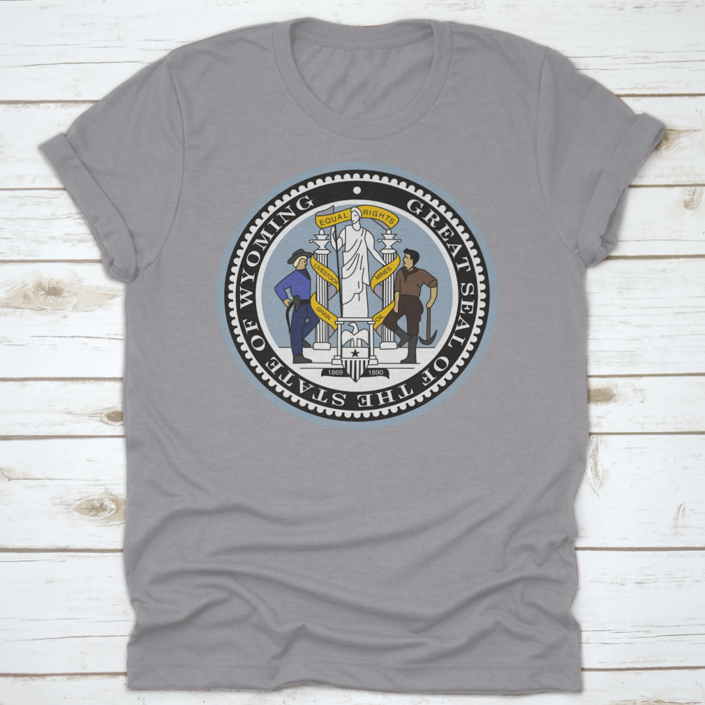 Official Current Vector Great Seal Of The Federal State Of Wyoming shirt, showcasing the state seal on a comfortable cotton fabric.