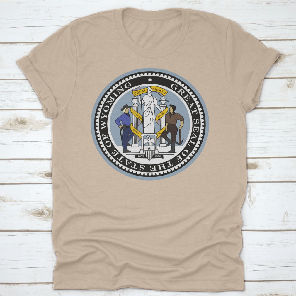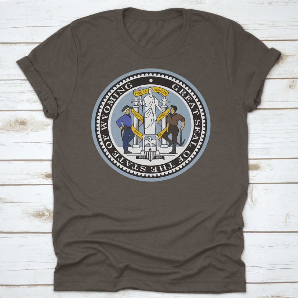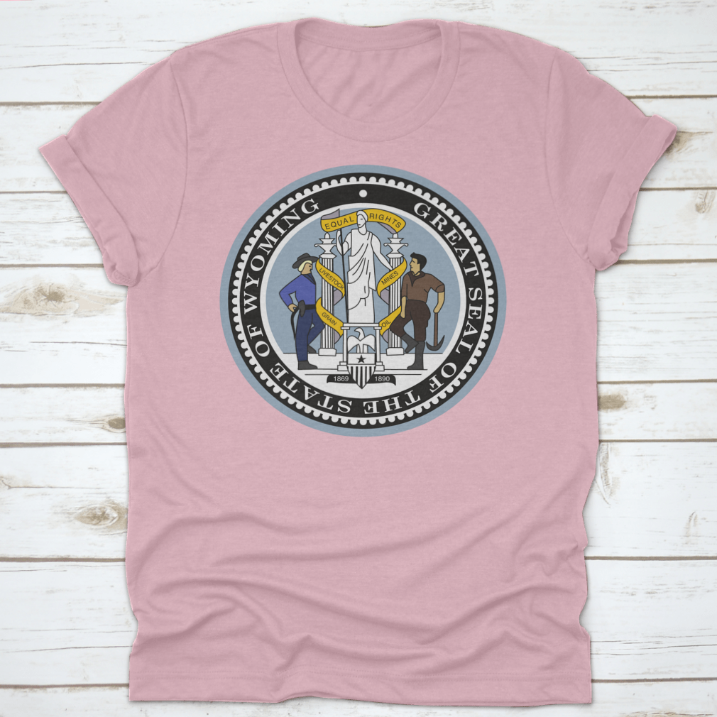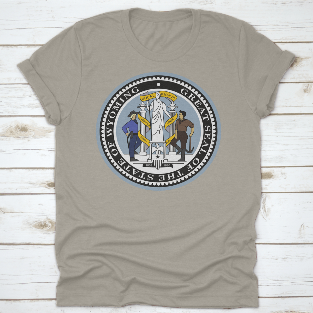 Official Current Vector Great Seal Of The Federal State Of Wyoming shirt, showcasing the state seal on a comfortable cotton fabric.