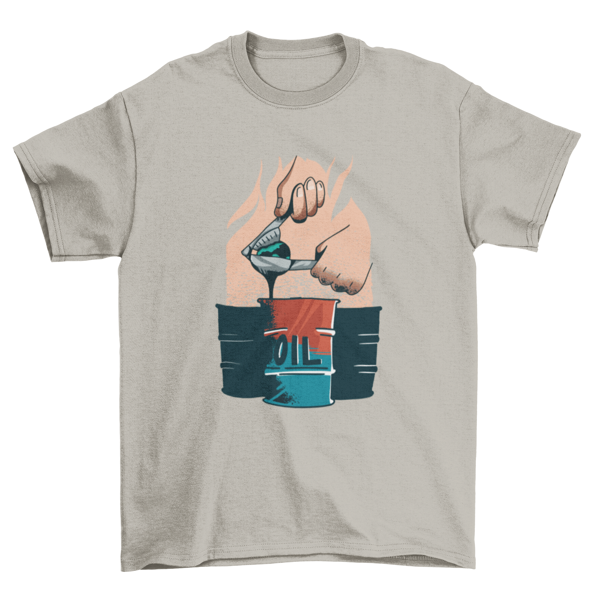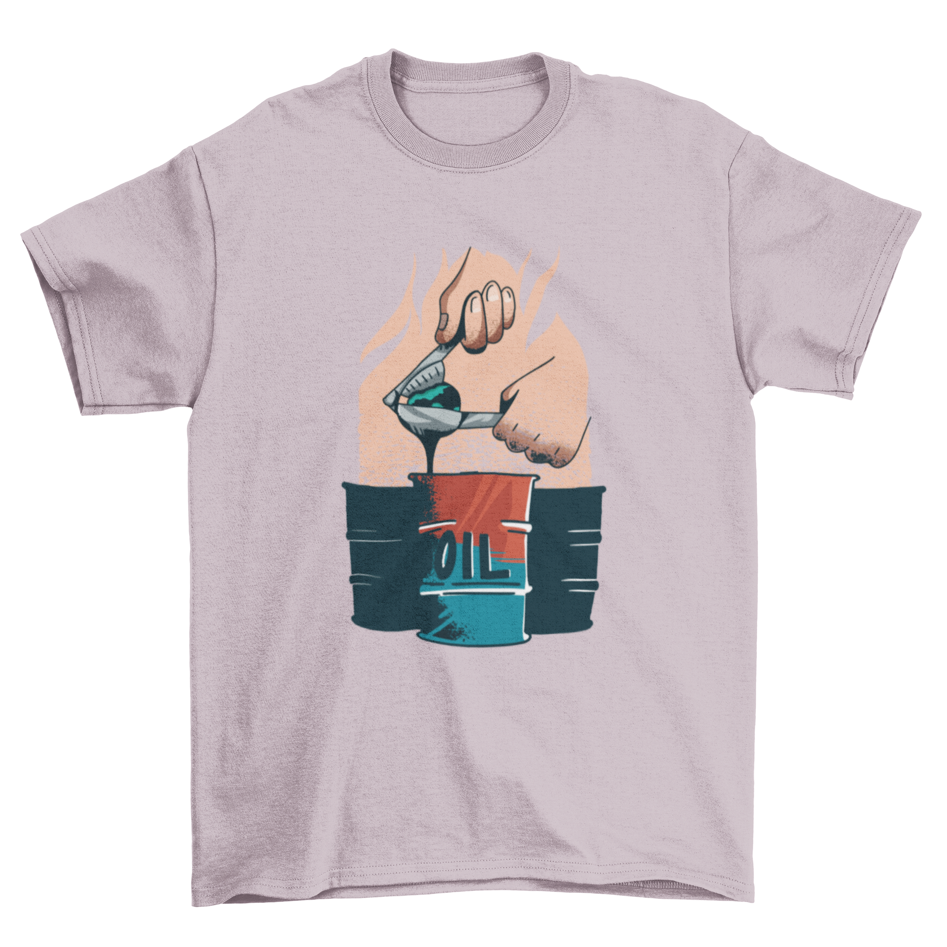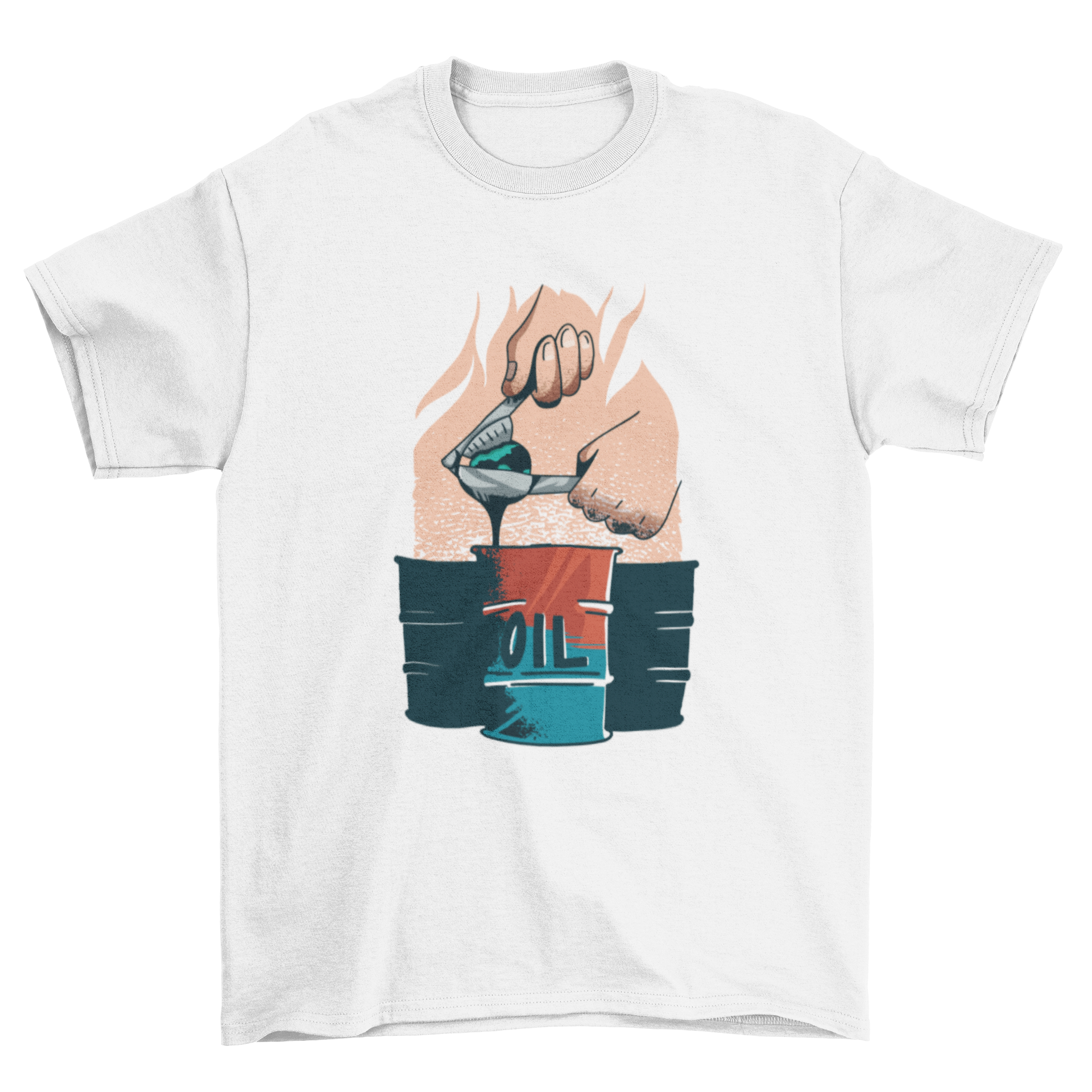 Introducing our unique Oil Exploitation T-shirt, a striking piece of apparel that combines art and environmental commentary. This T-shirt features a bold design of two hands squeezing oil out of Planet Earth into a barrel labeled 'OIL'. It's not just a shirt; it's a statement piece that sparks conversation about the impact of oil exploitation on our planet.
