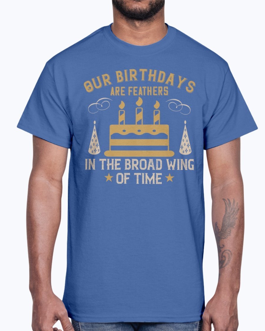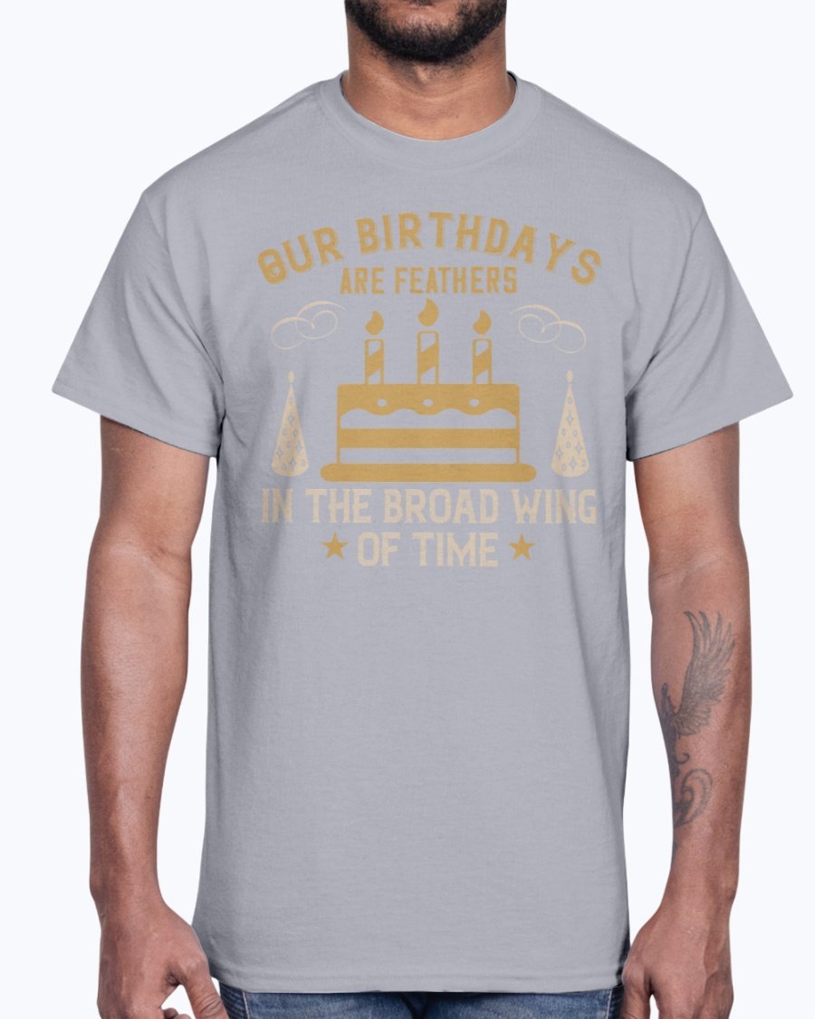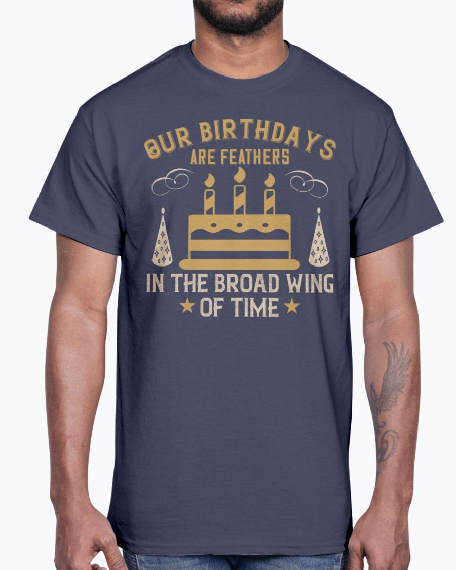 Introducing our unique cotton tee, featuring the inspiring phrase, 'Our birthdays are feathers in the broad wing of time.' This shirt is not just a piece of clothing; it's a celebration of life and the special moments that birthdays bring. Made from 100% preshrunk cotton, this tee ensures comfort and durability, making it an ideal choice for birthday parties, casual outings, or simply lounging at home.