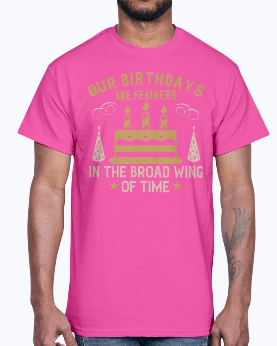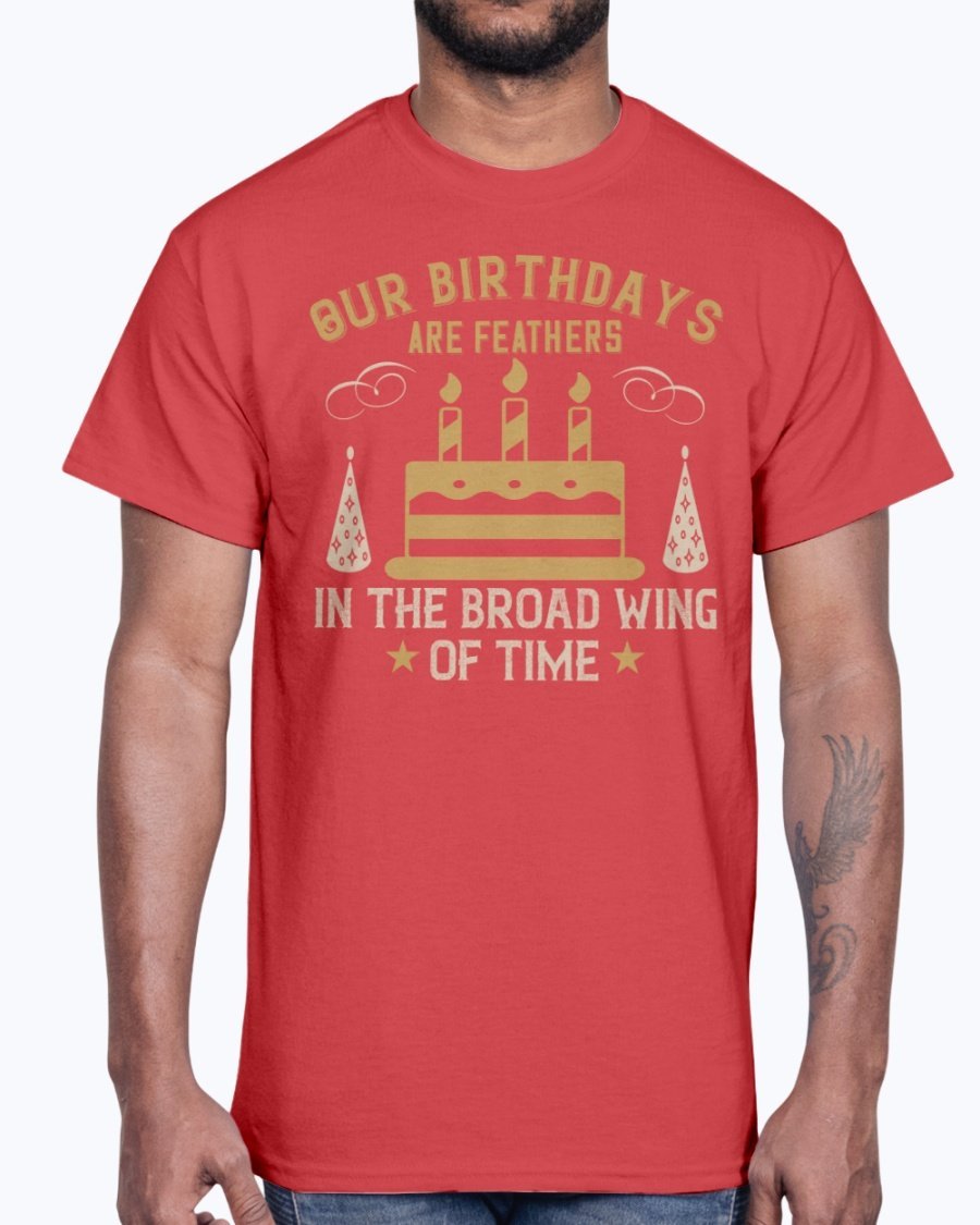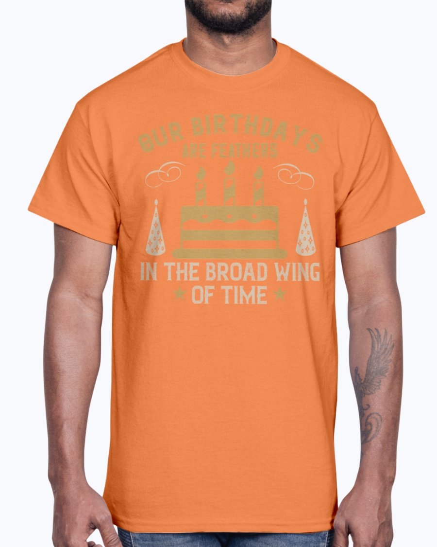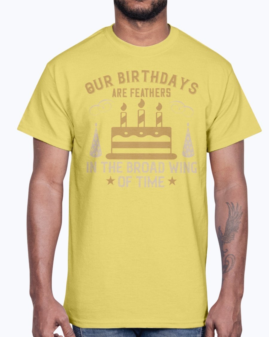 Introducing our unique cotton tee, featuring the inspiring phrase, 'Our birthdays are feathers in the broad wing of time.' This shirt is not just a piece of clothing; it's a celebration of life and the special moments that birthdays bring. Made from 100% preshrunk cotton, this tee ensures comfort and durability, making it an ideal choice for birthday parties, casual outings, or simply lounging at home.