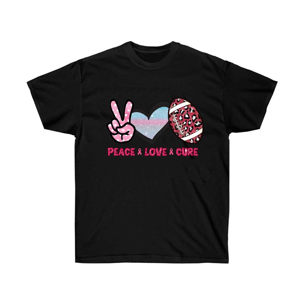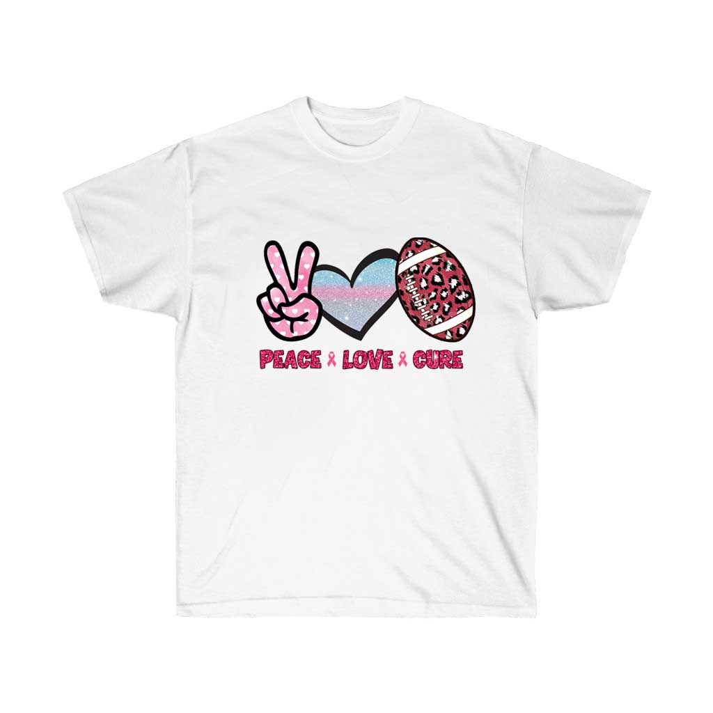 Peace Love Cure Football Breast Cancer Awareness T-Shirt featuring a pink ribbon design, made from 100% soft cotton, suitable for unisex wear.