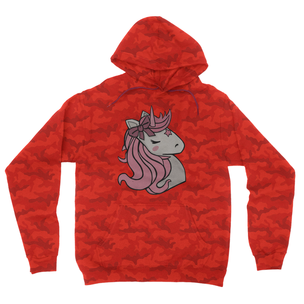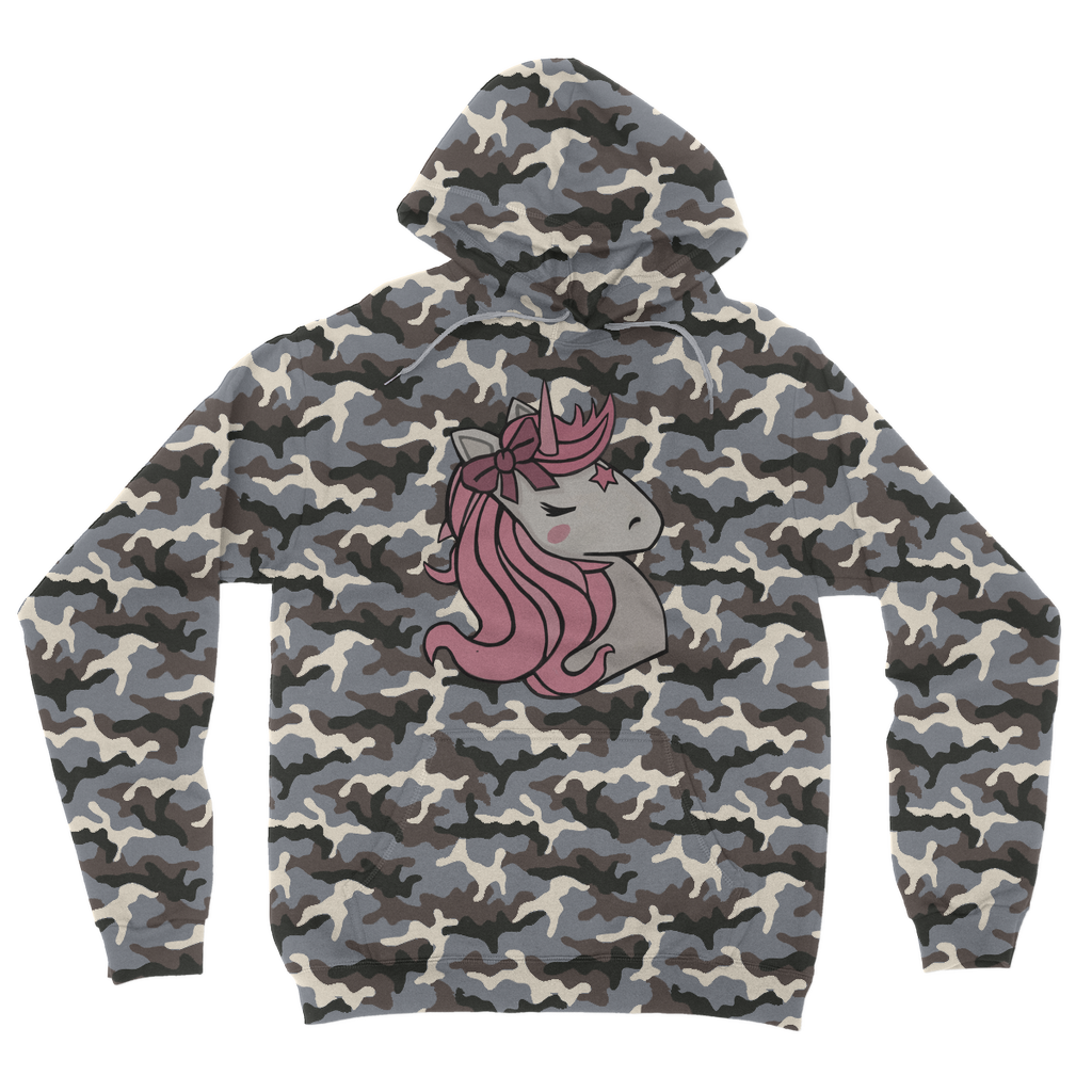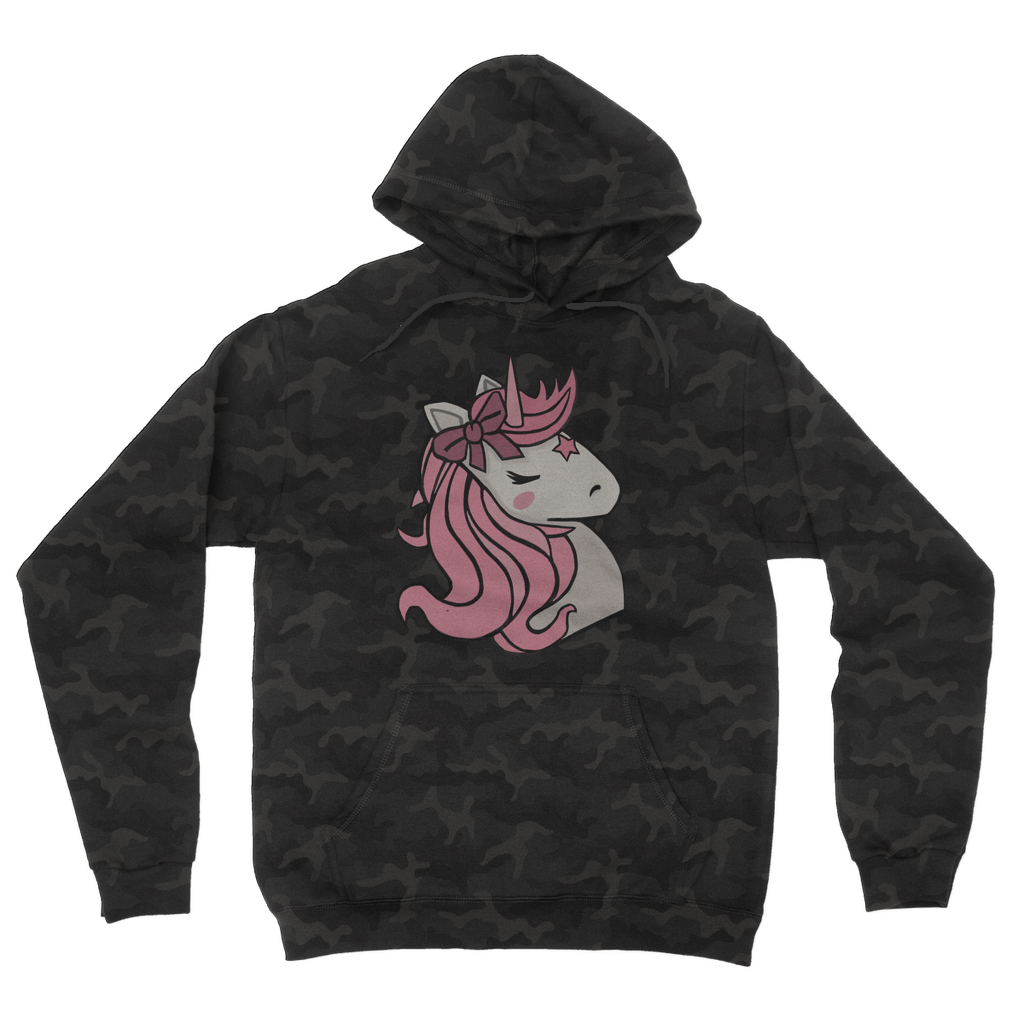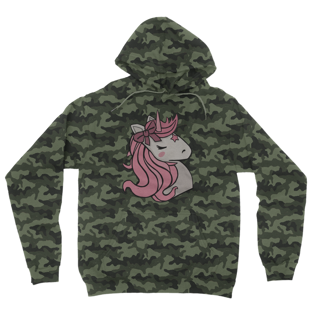 Introducing the Pink Unicorn Camouflage Adult Hoodie, a must-have addition to your wardrobe that combines style and comfort effortlessly. This hoodie features a unique all-over camouflage design infused with a playful pink unicorn motif, making it a standout piece for any casual outfit. Whether you're lounging at home or heading out with friends, this hoodie is designed to keep you looking fashionable while providing the comfort you need.