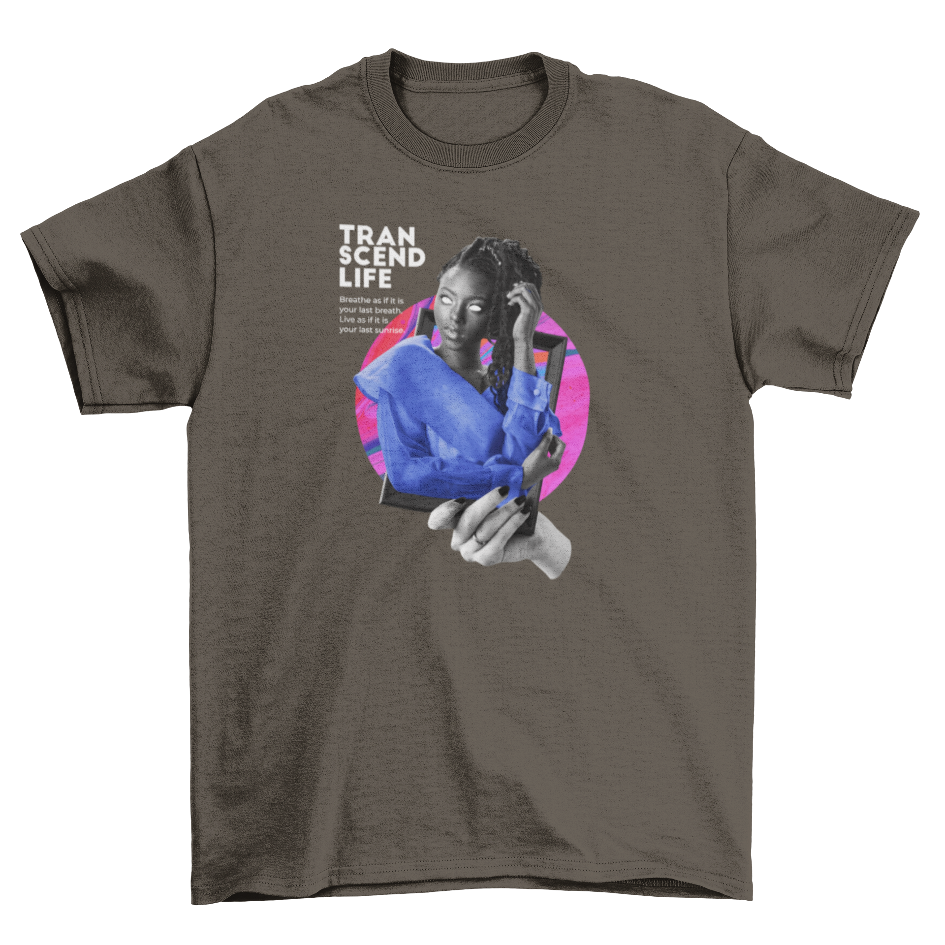 A striking portrait of a black woman wearing a blue t-shirt, emerging from a black and white painting.