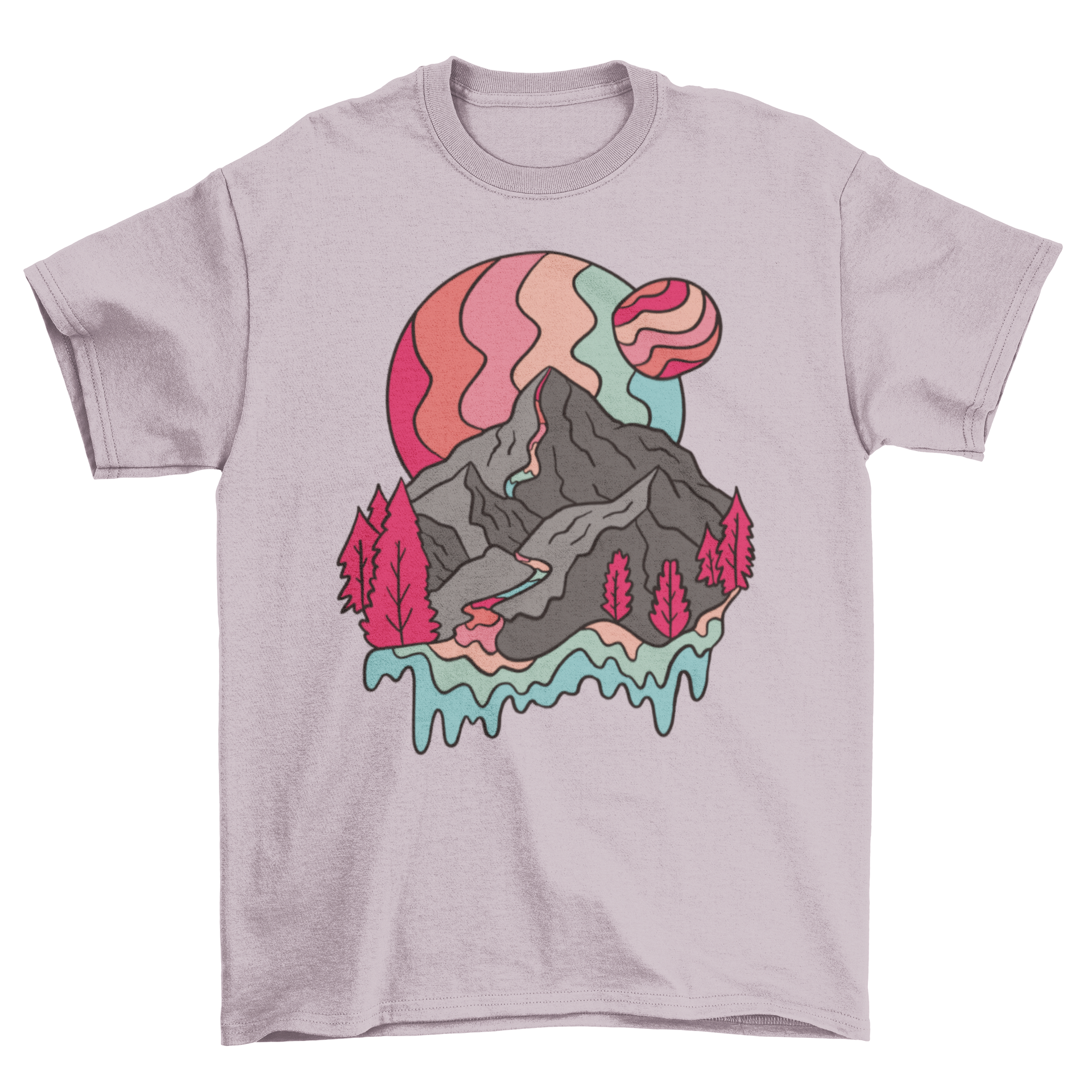 The Rainbow Mountains T-shirt is designed with creativity in mind. The trippy mountain illustration captures the essence of adventure and exploration, while the rainbow planets add a whimsical touch that is sure to turn heads. Whether you're hiking in the great outdoors or hanging out with friends, this t-shirt will make you stand out in any crowd.