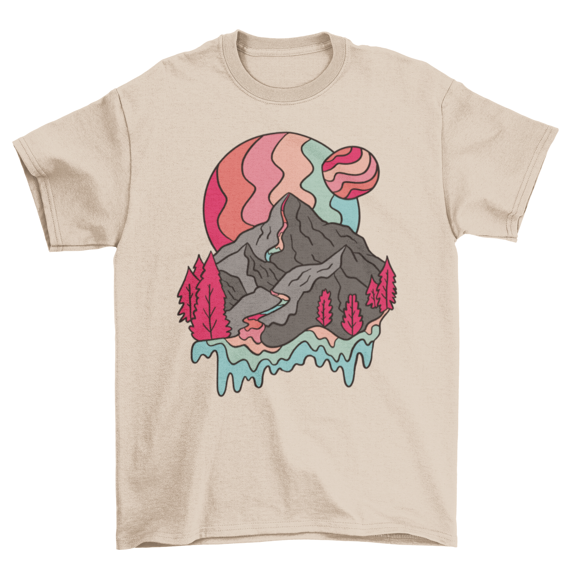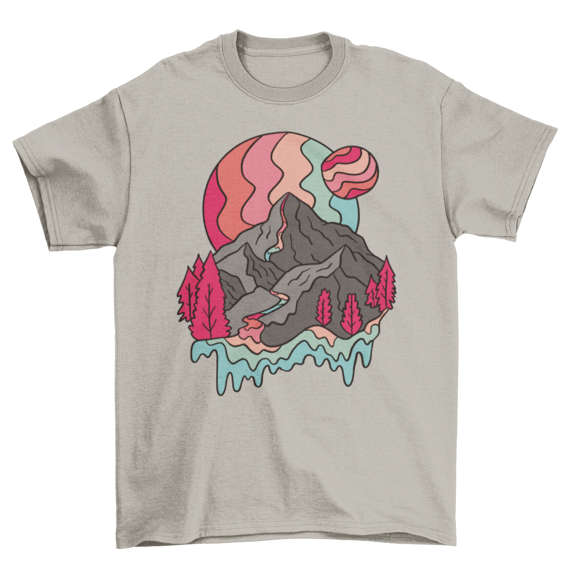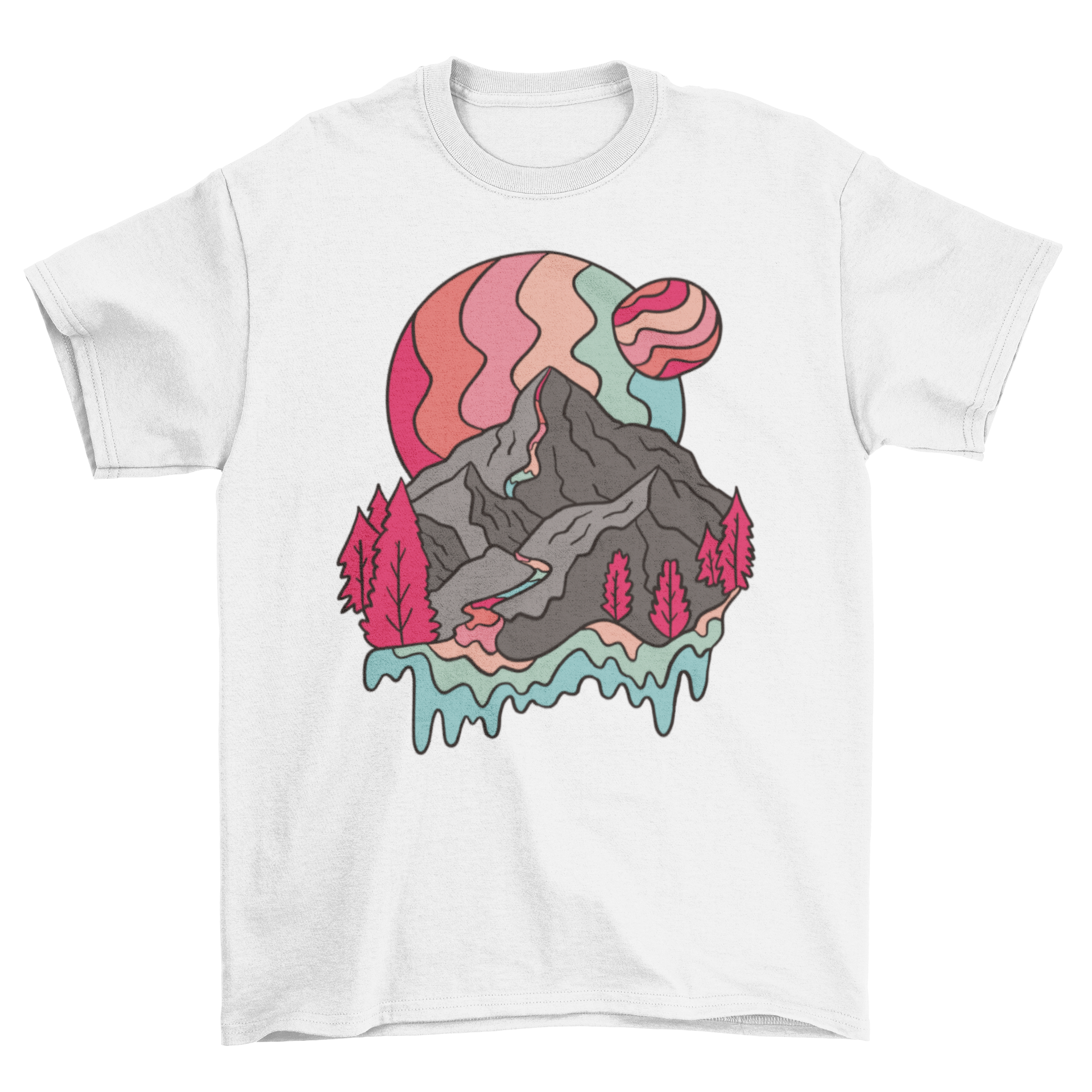 Introducing the stunning Rainbow Mountains T-shirt, a must-have for anyone who loves unique and eye-catching apparel. This t-shirt features a mesmerizing design that showcases a trippy mountain illustration adorned with vibrant rainbow planets. Perfect for those who appreciate art and nature, this shirt is not just a piece of clothing; it's a statement piece that reflects your personality and style.