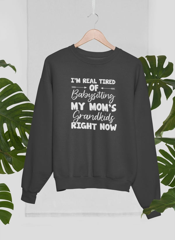 This sweatshirt is versatile enough to be worn on various occasions. Whether you’re spending a relaxed day at home, heading out for a casual lunch, or attending a family gathering, it fits seamlessly into your lifestyle. Pair it with jeans, leggings, or shorts for a laid-back look that doesn’t compromise on style. It’s also a great gift for friends or family members who can relate to the sentiment of being 'tired of babysitting' while still cherishing their loved ones.