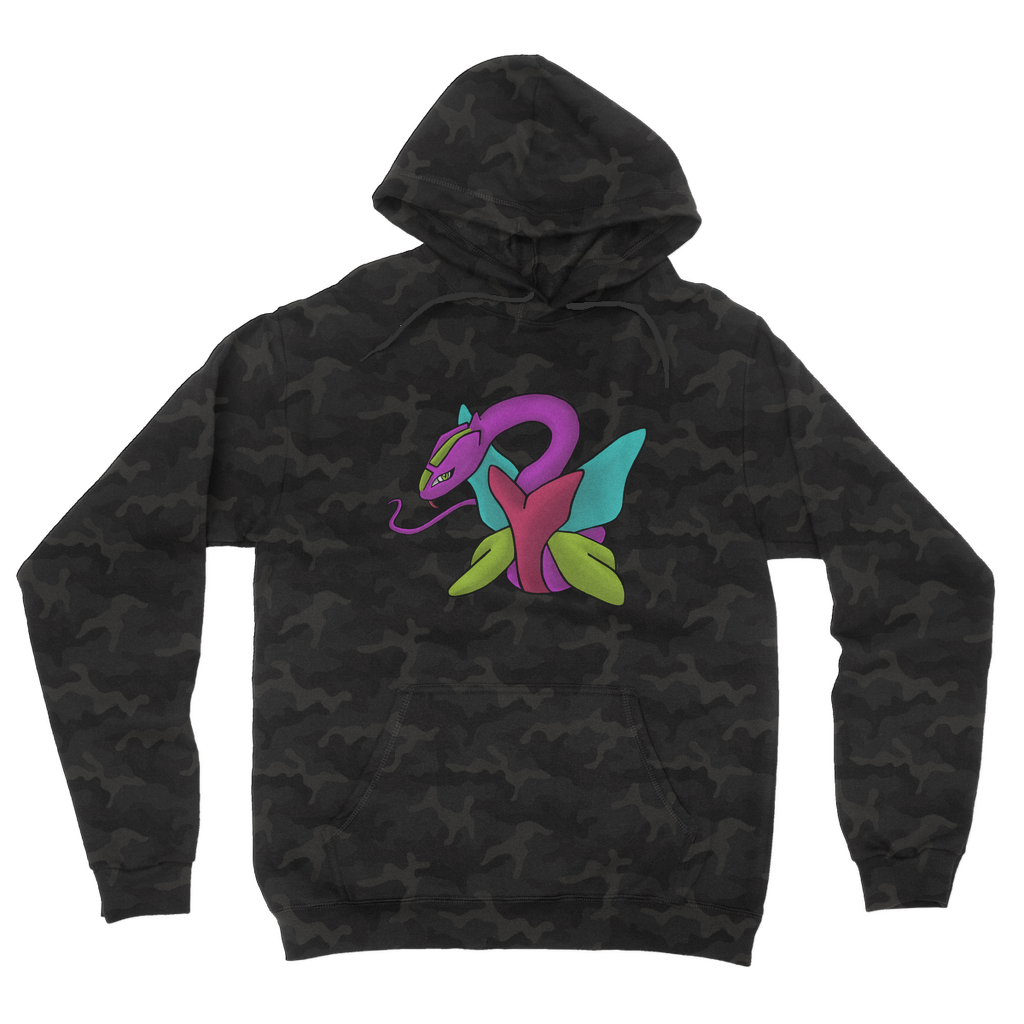Rengitsu Camouflage Adult Hoodie featuring an all-over camo design, double fabric hood, and kangaroo pouch pocket.