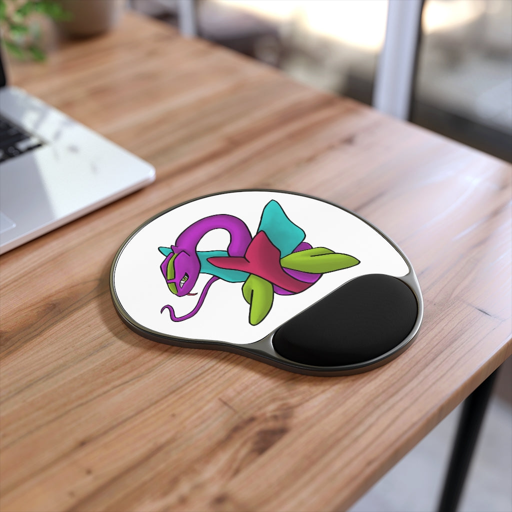 Rengitsu Mouse Pad with ergonomic Memory Foam wrist rest and custom-printed neoprene insert, foot-shaped base.