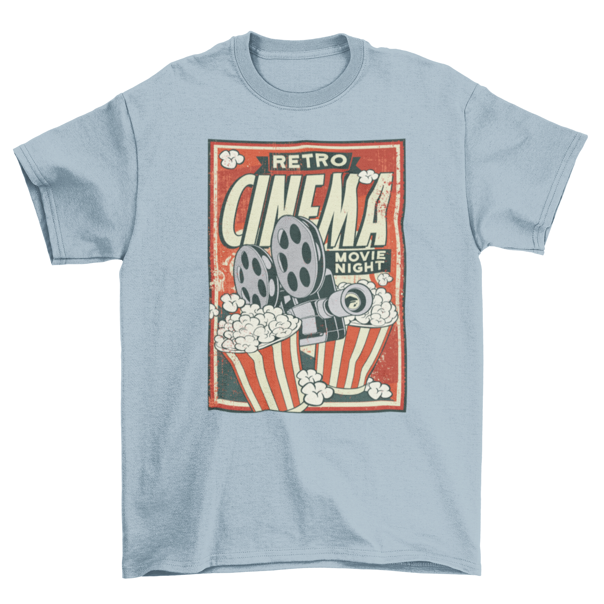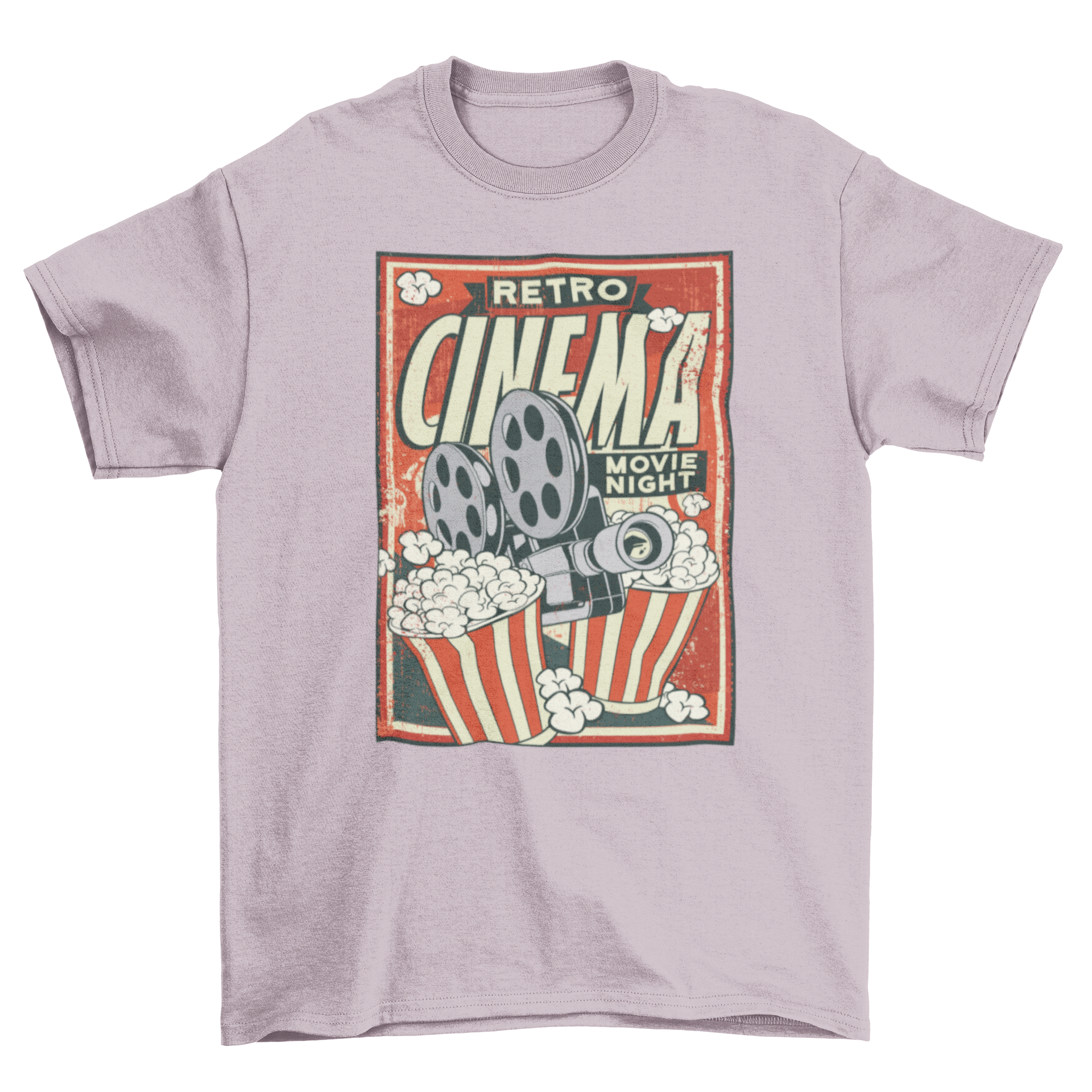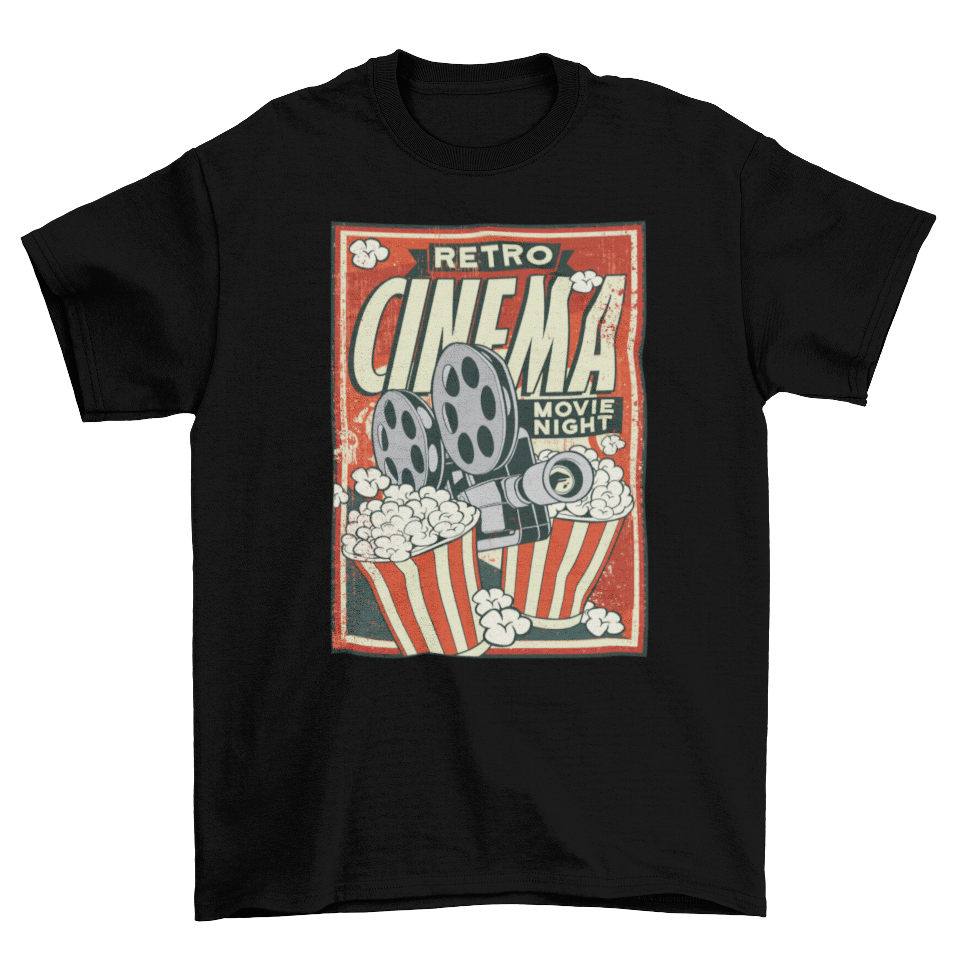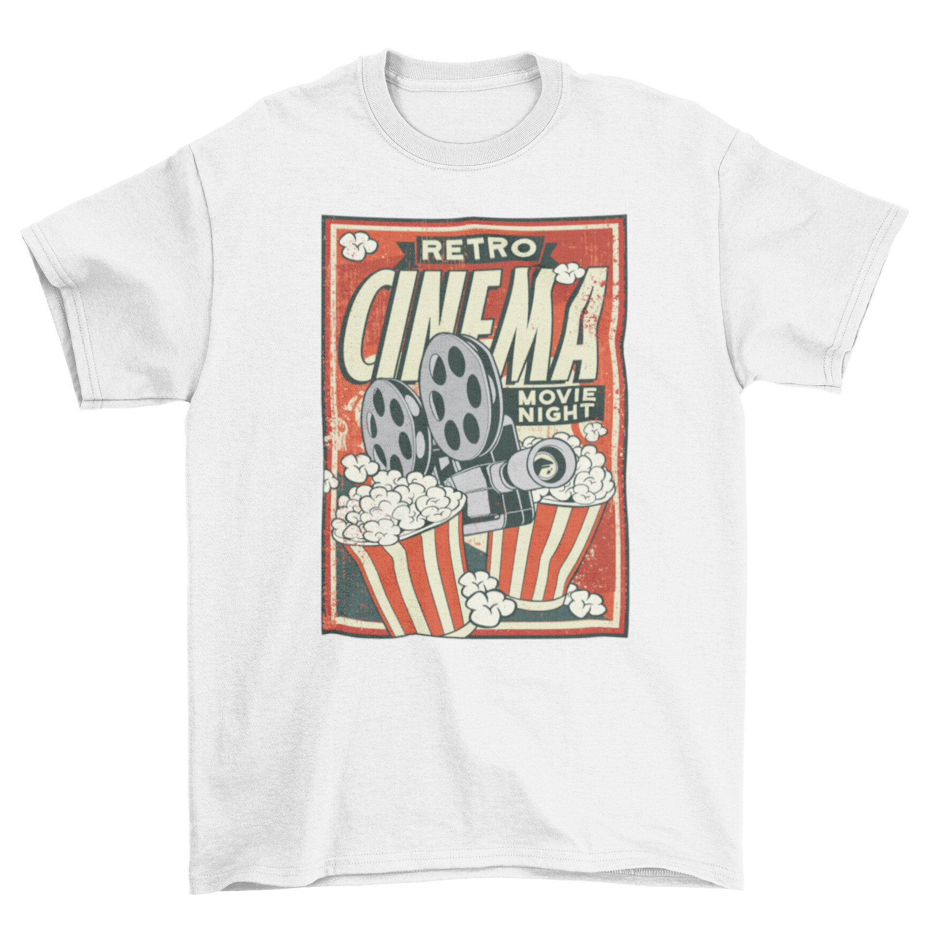 Step back in time with our Retro Cinema Poster T-Shirt, a perfect blend of style and nostalgia. This amazing t-shirt features a vibrant design showcasing a vintage camera and a bucket of popcorn, accompanied by the quote 'Retro cinema movie night'. Ideal for those who cherish the golden age of film, this shirt is not just a piece of clothing; it's a statement of your love for classic cinema.