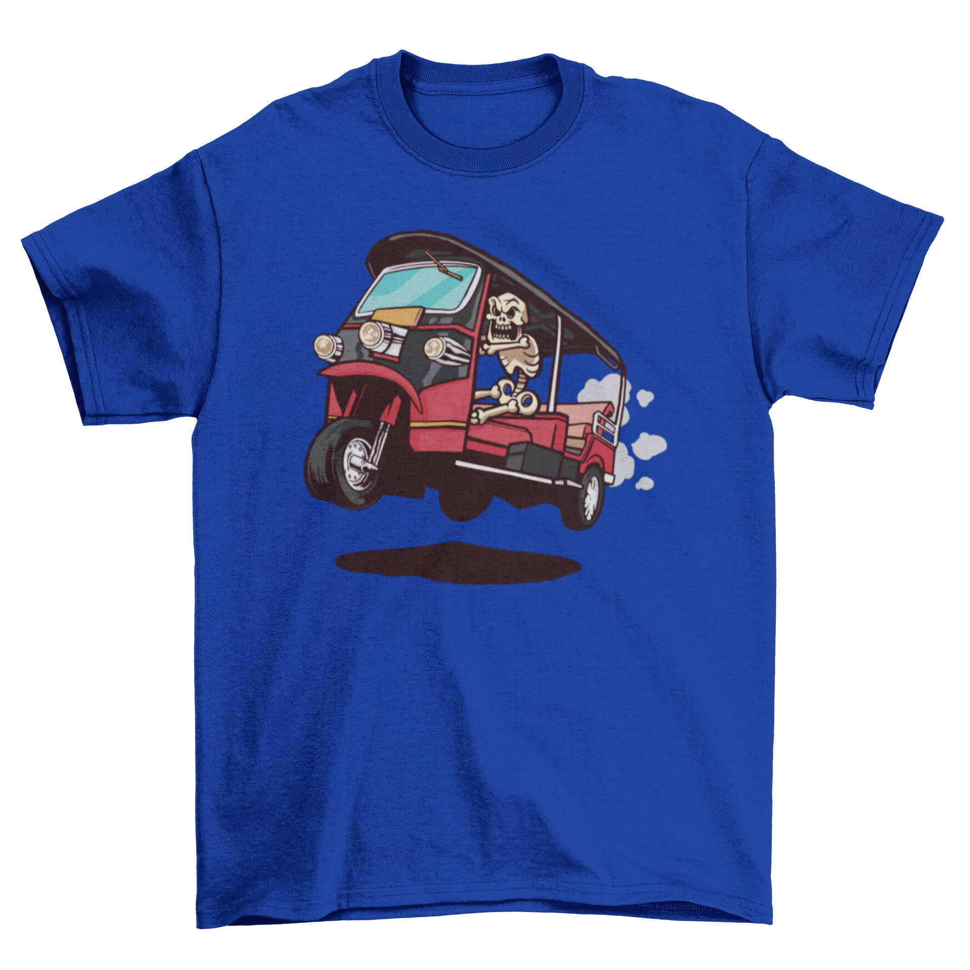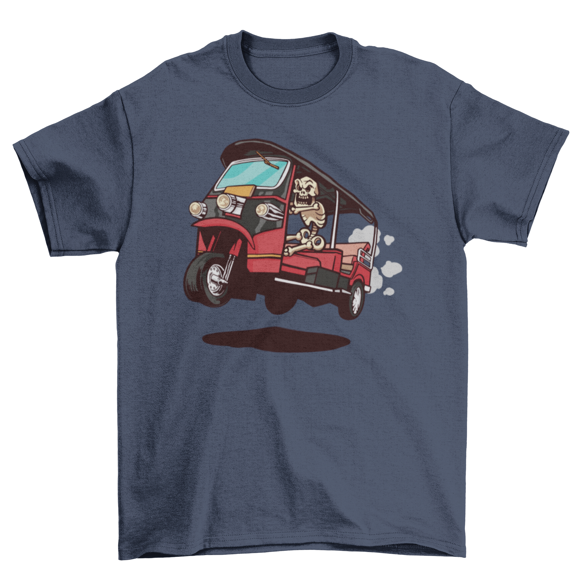 A vibrant t-shirt featuring a smiling skeleton driving a rickshaw with smoke coming out of the back, showcasing a fun and quirky design.