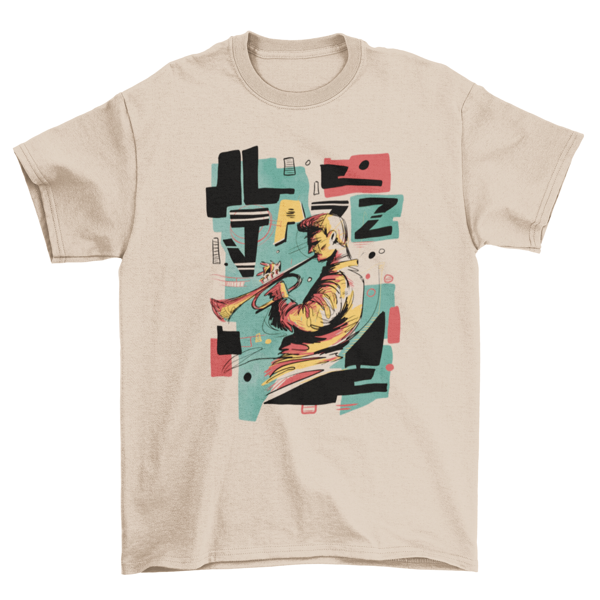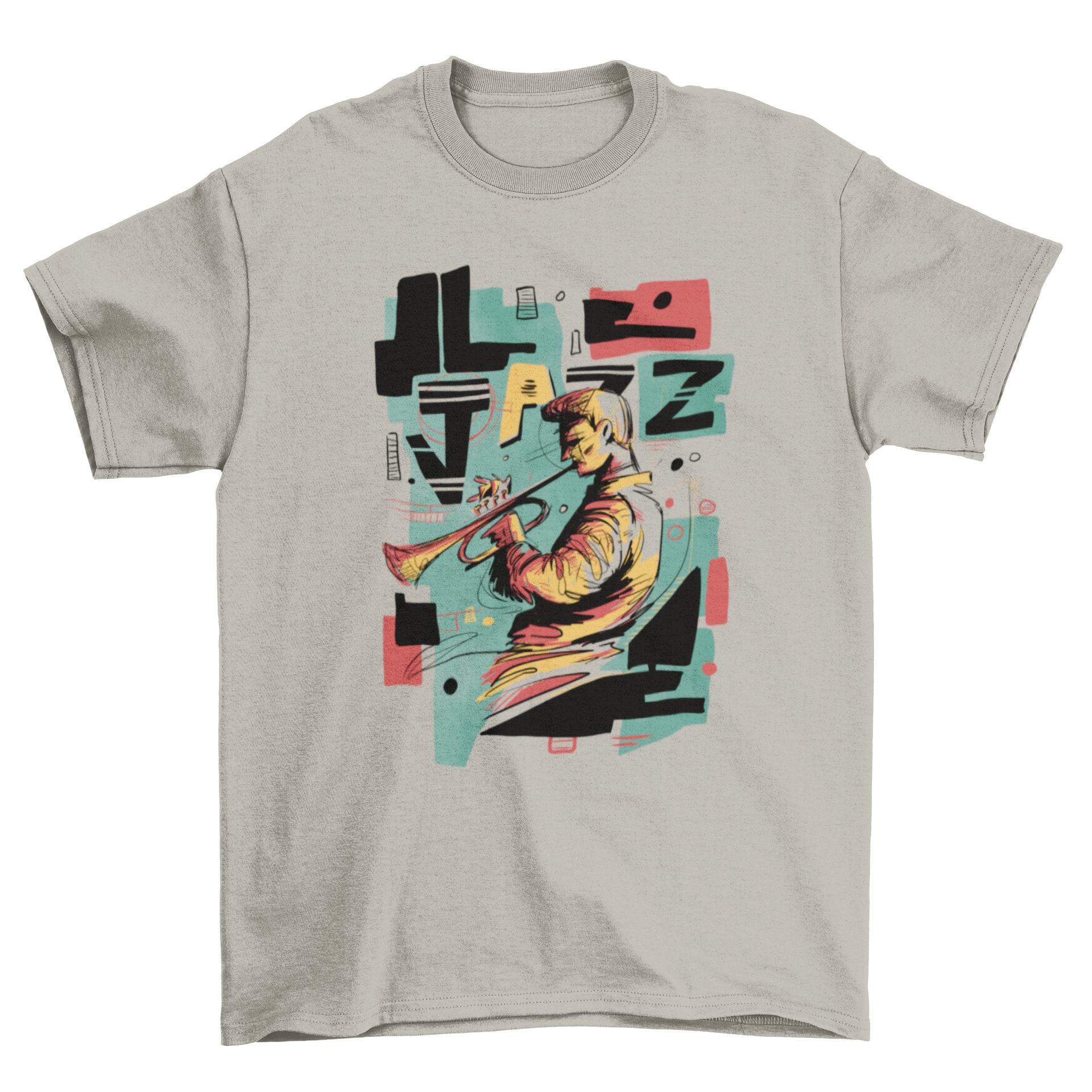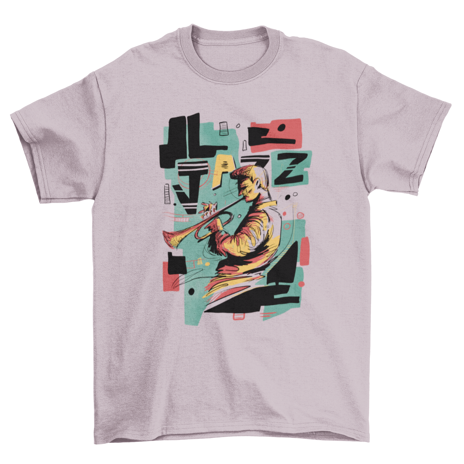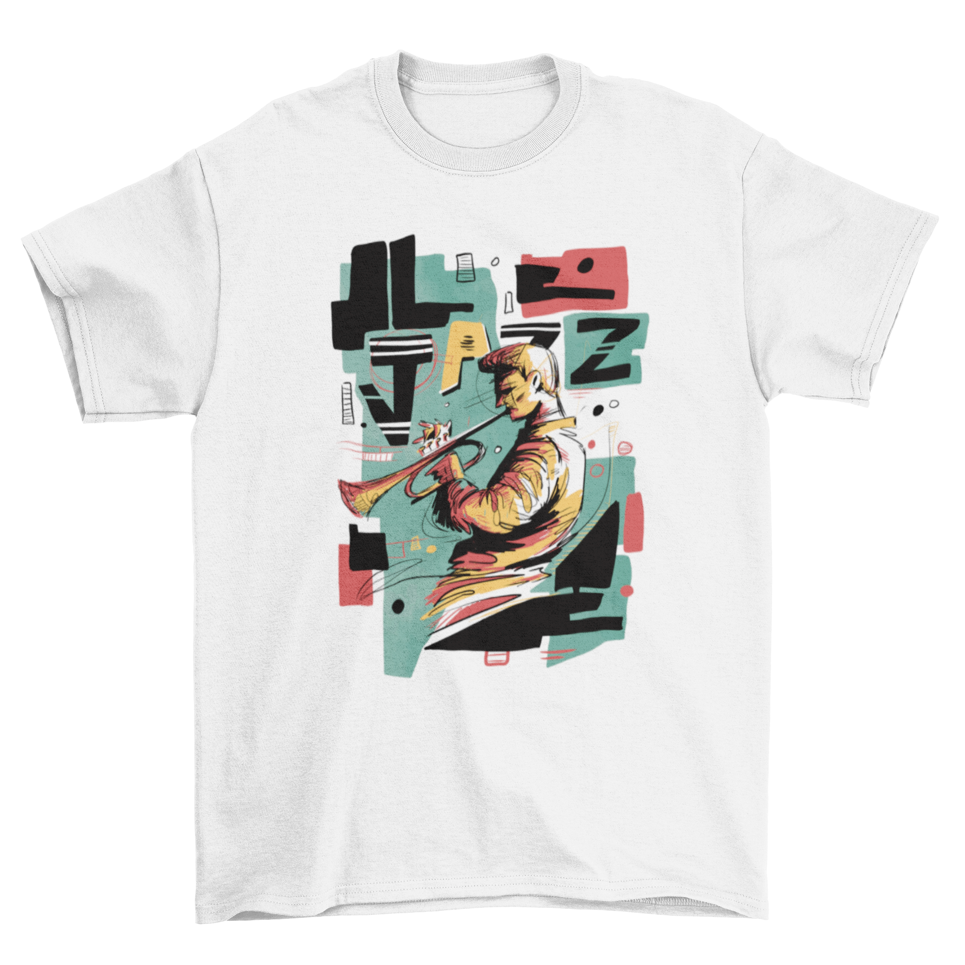 Abstract design t-shirt featuring a jazz musician, showcasing vibrant colors and artistic style.
