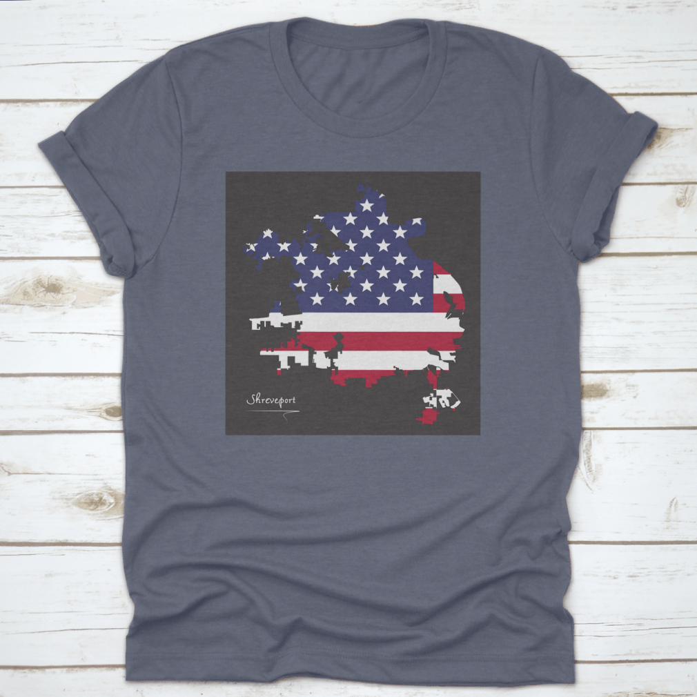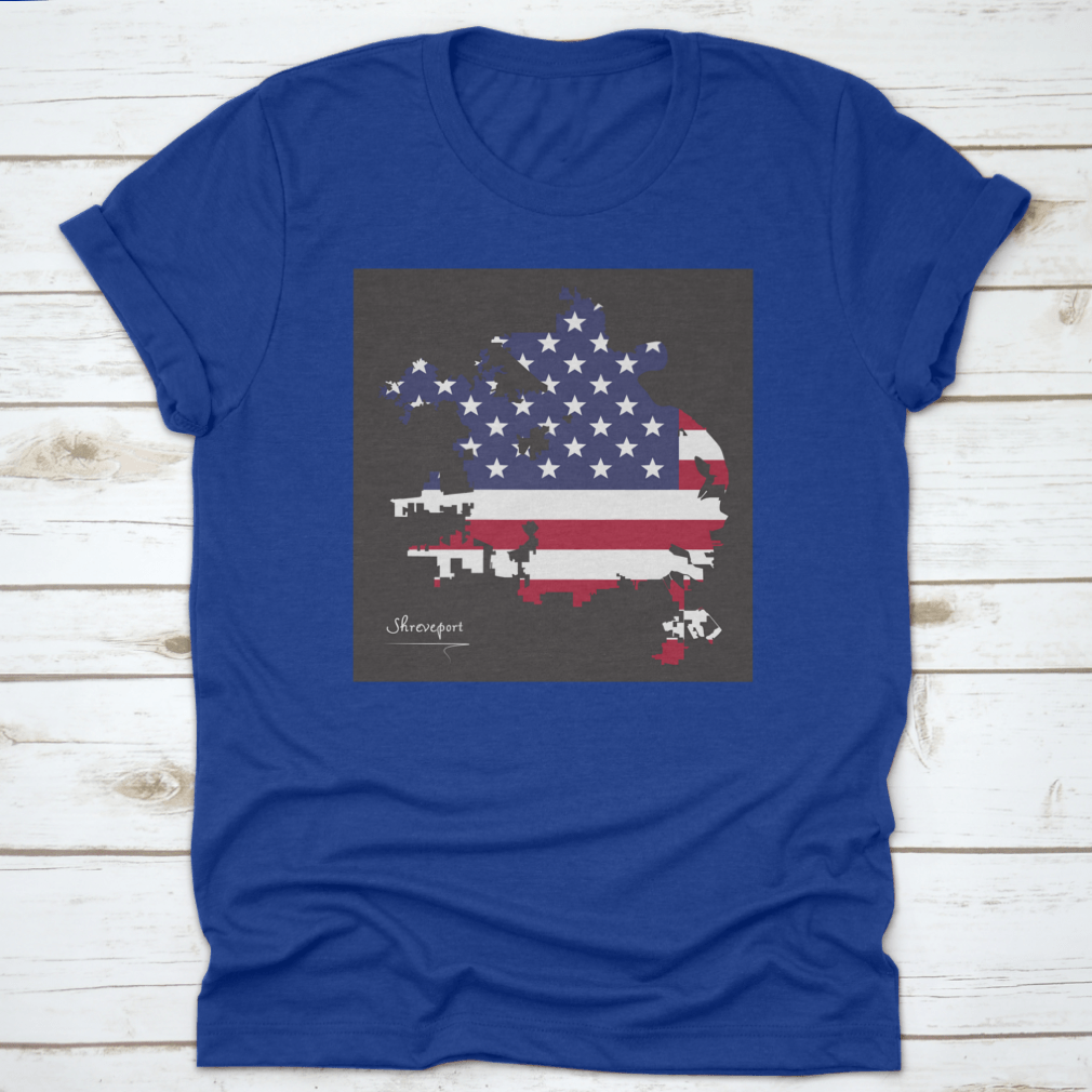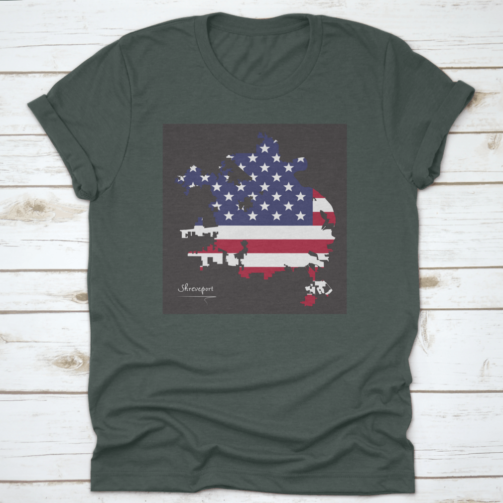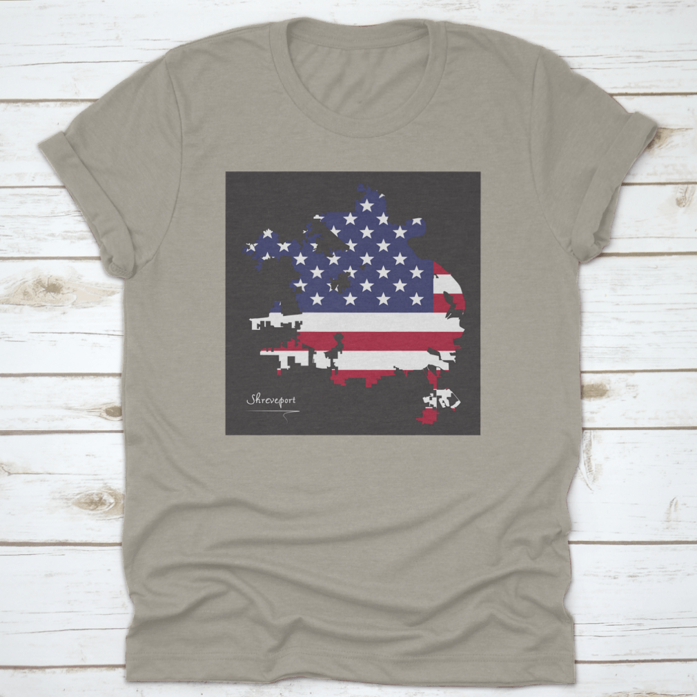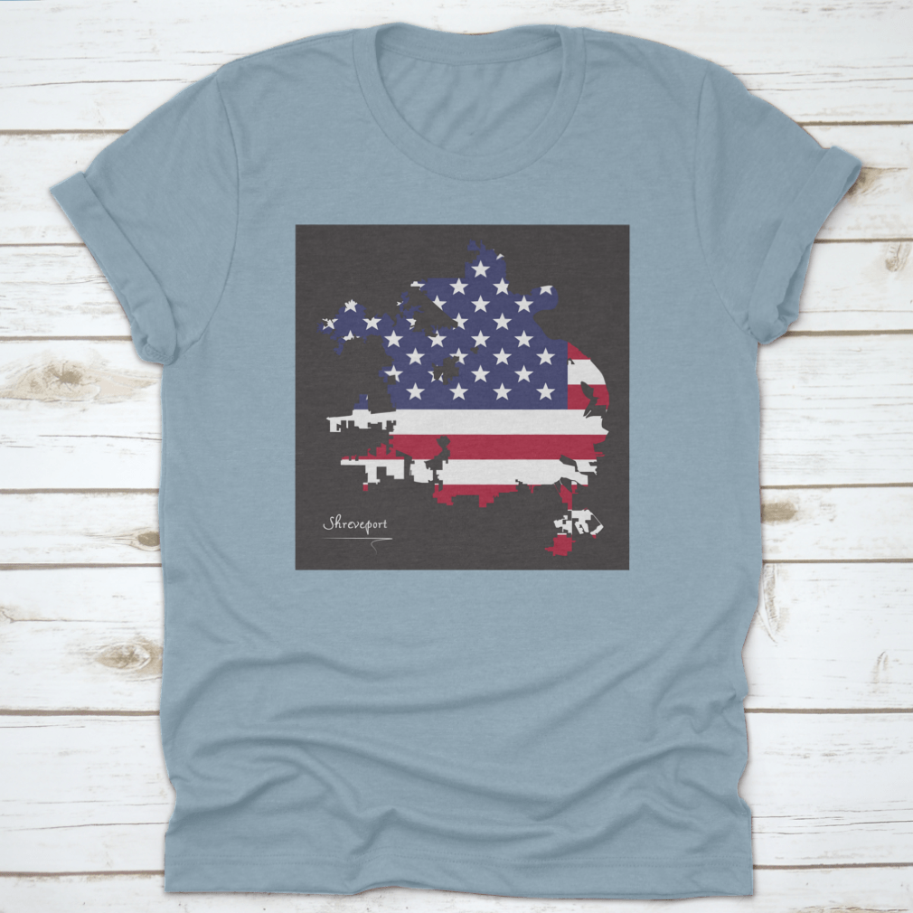 Shreveport Louisiana city map shirt featuring American flag illustration, showcasing vibrant colors and stylish design.