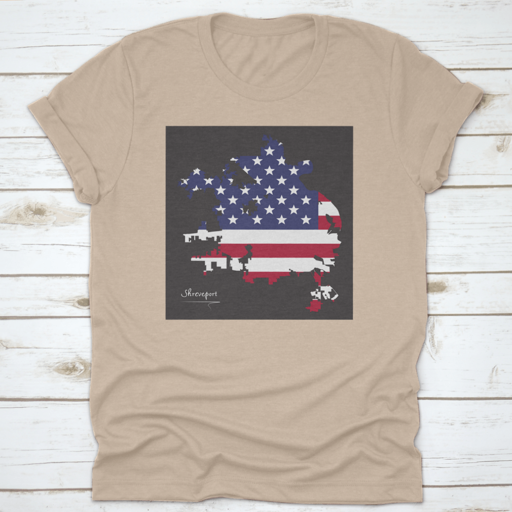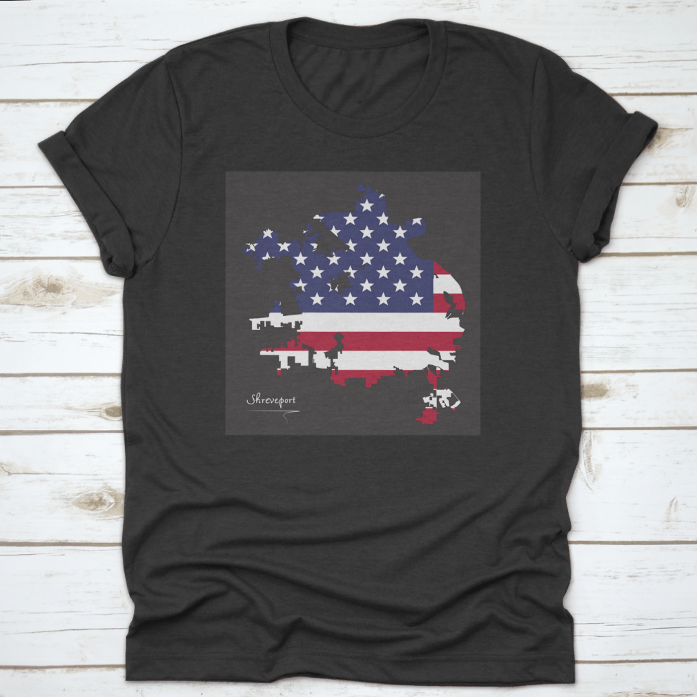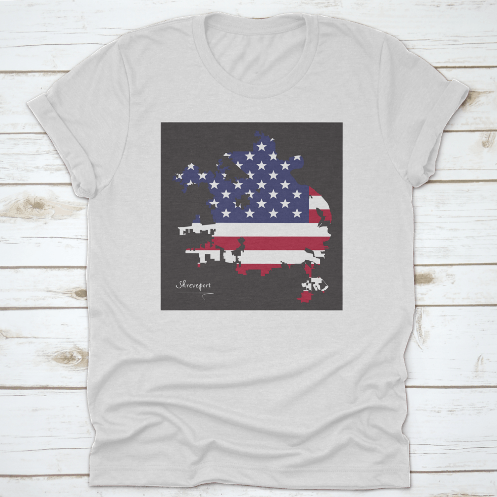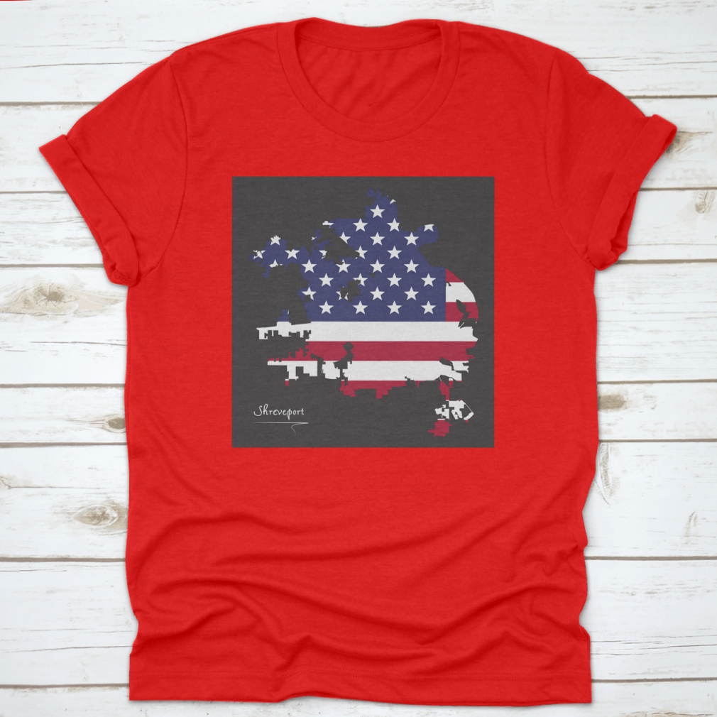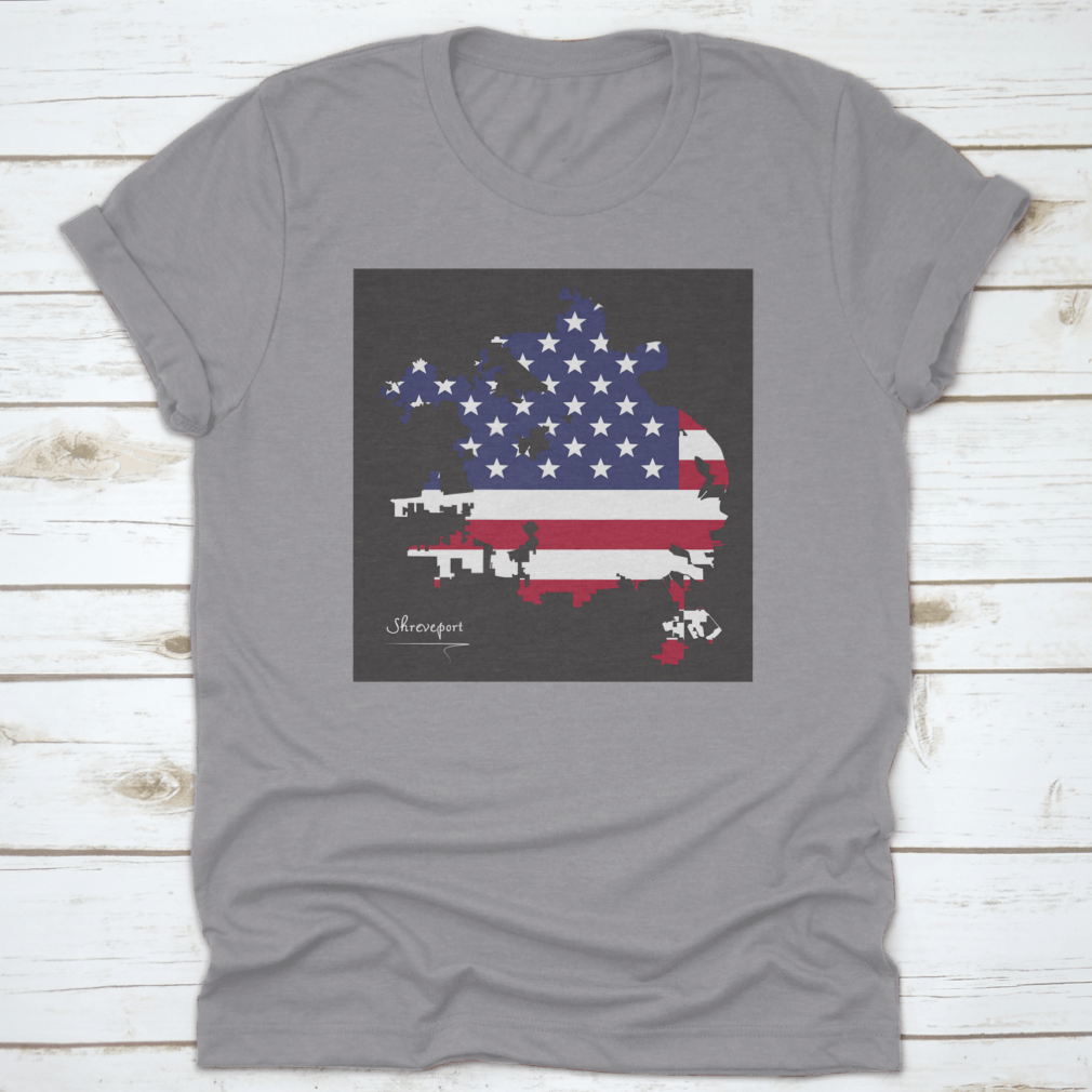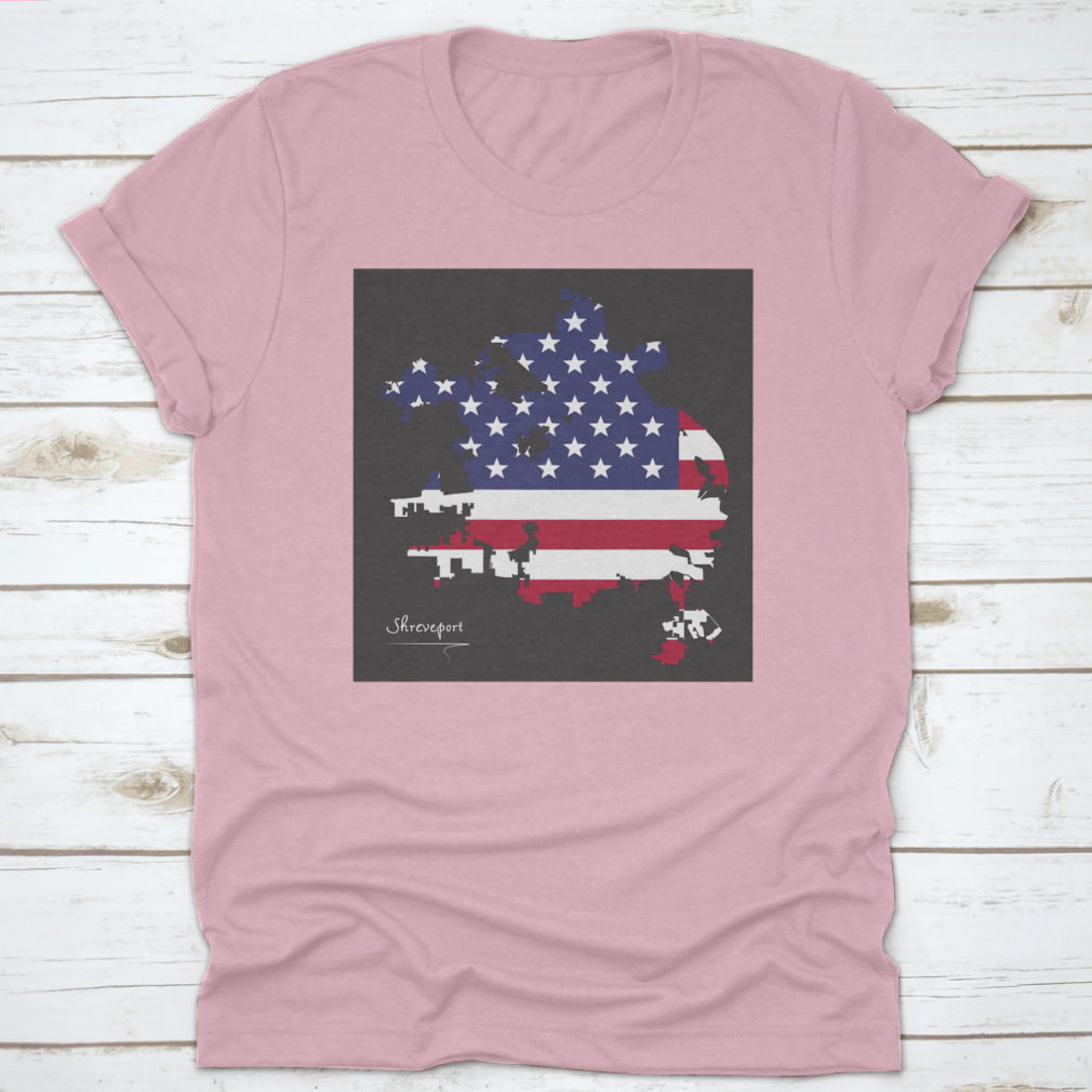 Shreveport Louisiana city map shirt featuring American flag illustration, showcasing vibrant colors and stylish design.