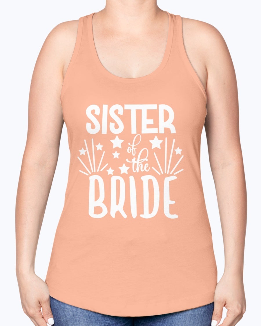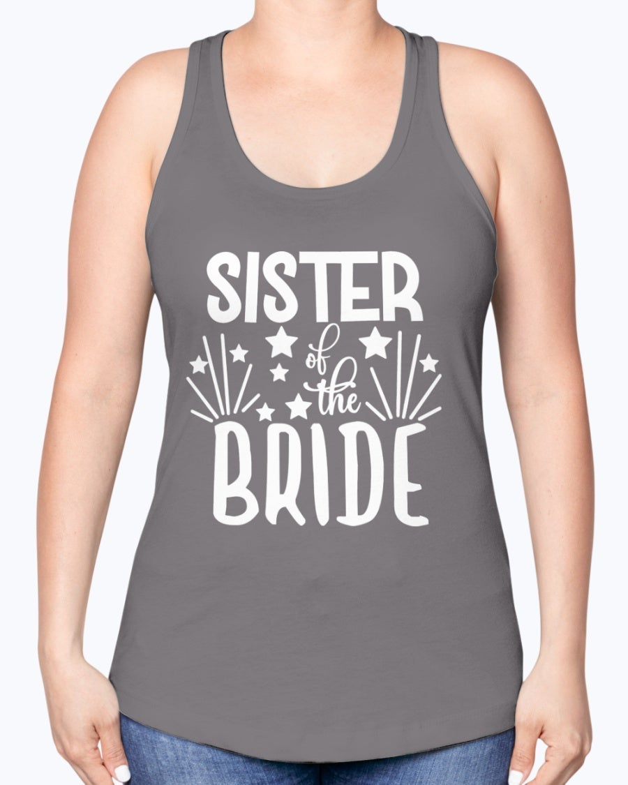 Sister of the Bride Racerback Tank top in white with stylish lettering, perfect for bridal parties and wedding celebrations.