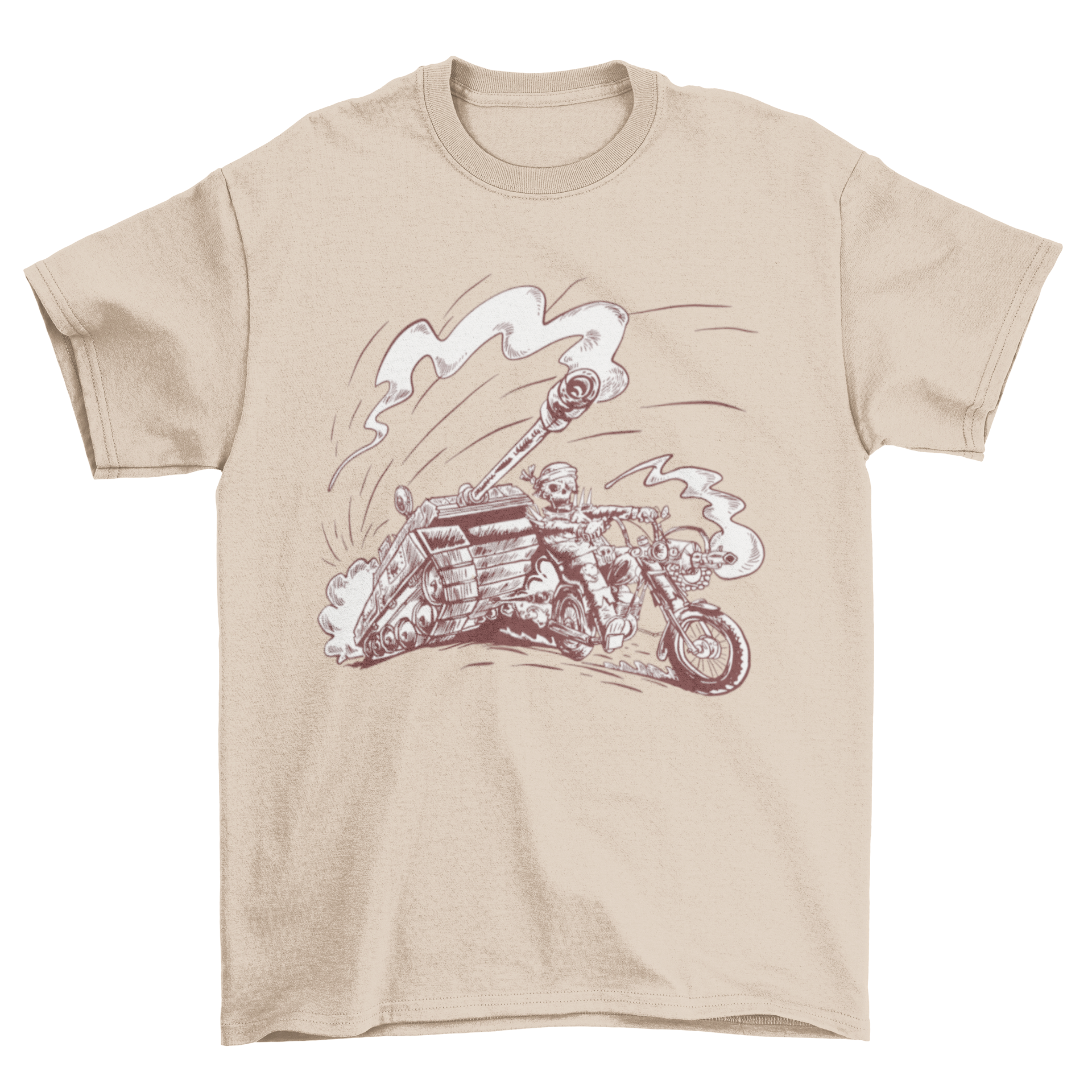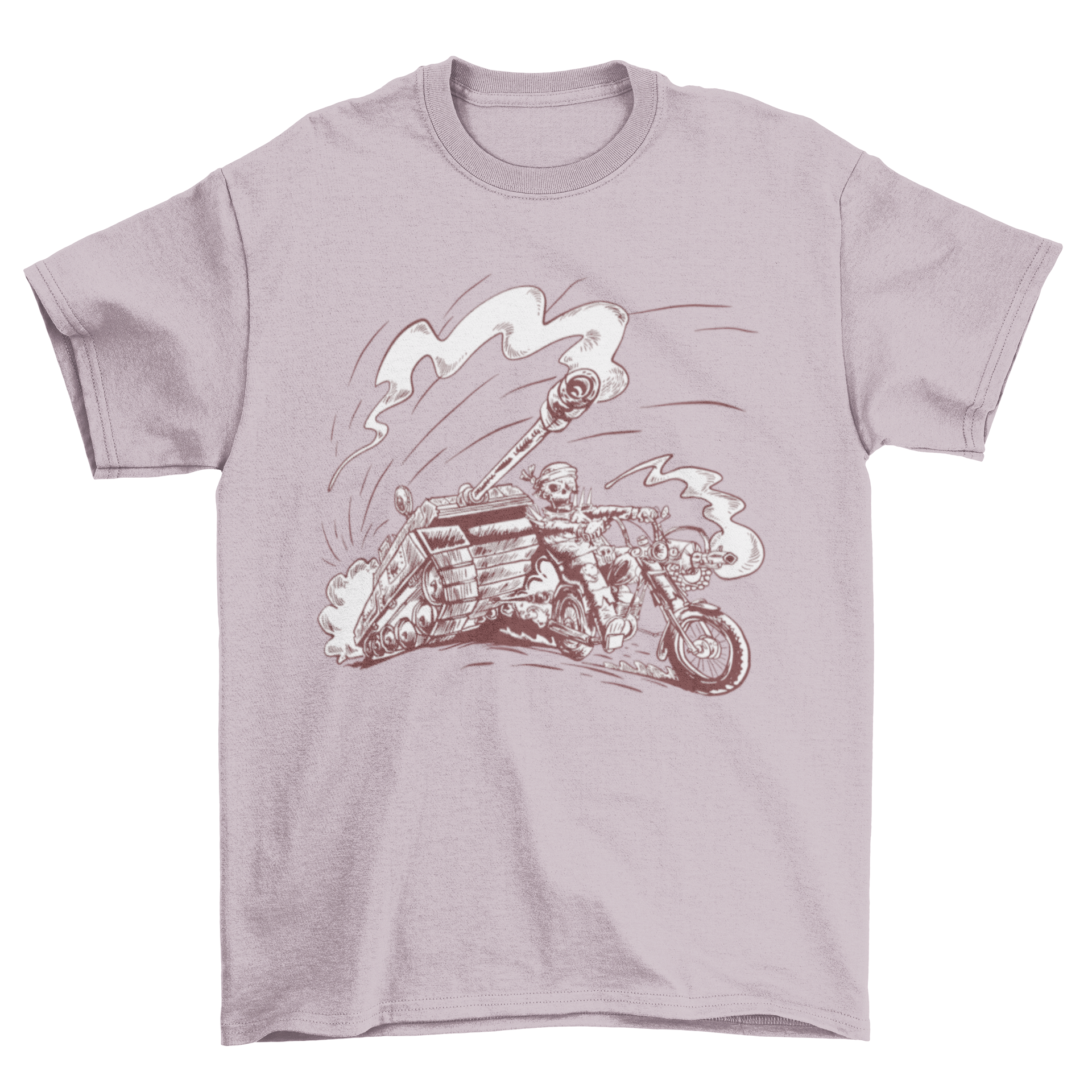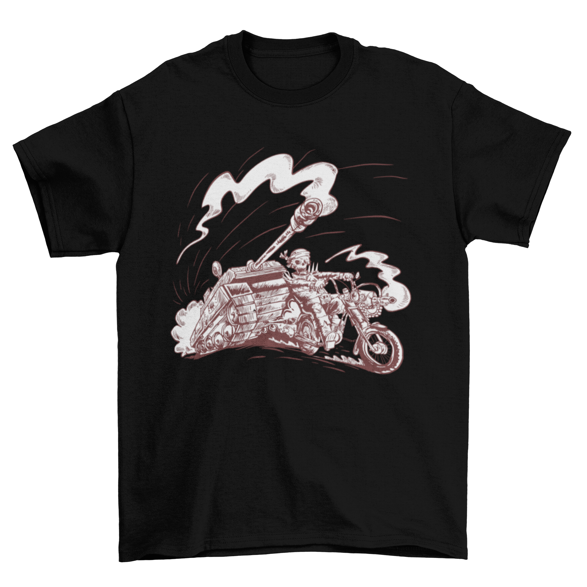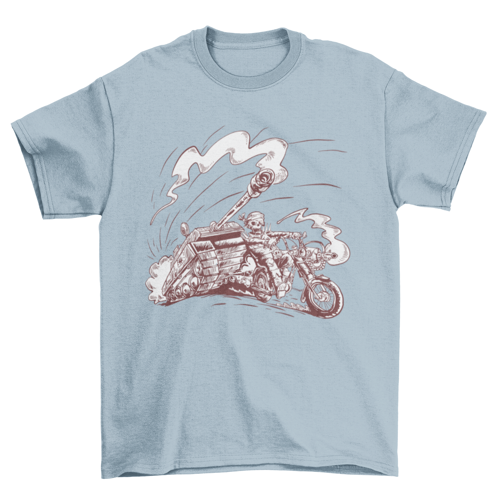 Introducing our Skeleton on Motorcycle T-shirt, a must-have for motorcycle enthusiasts and those who appreciate unique graphic designs. This t-shirt features an eye-catching illustration of a skeleton riding a motorcycle, complete with a tank, making it a perfect addition to your casual wardrobe. Whether you're hitting the road or just hanging out with friends, this t-shirt is sure to turn heads and spark conversations.