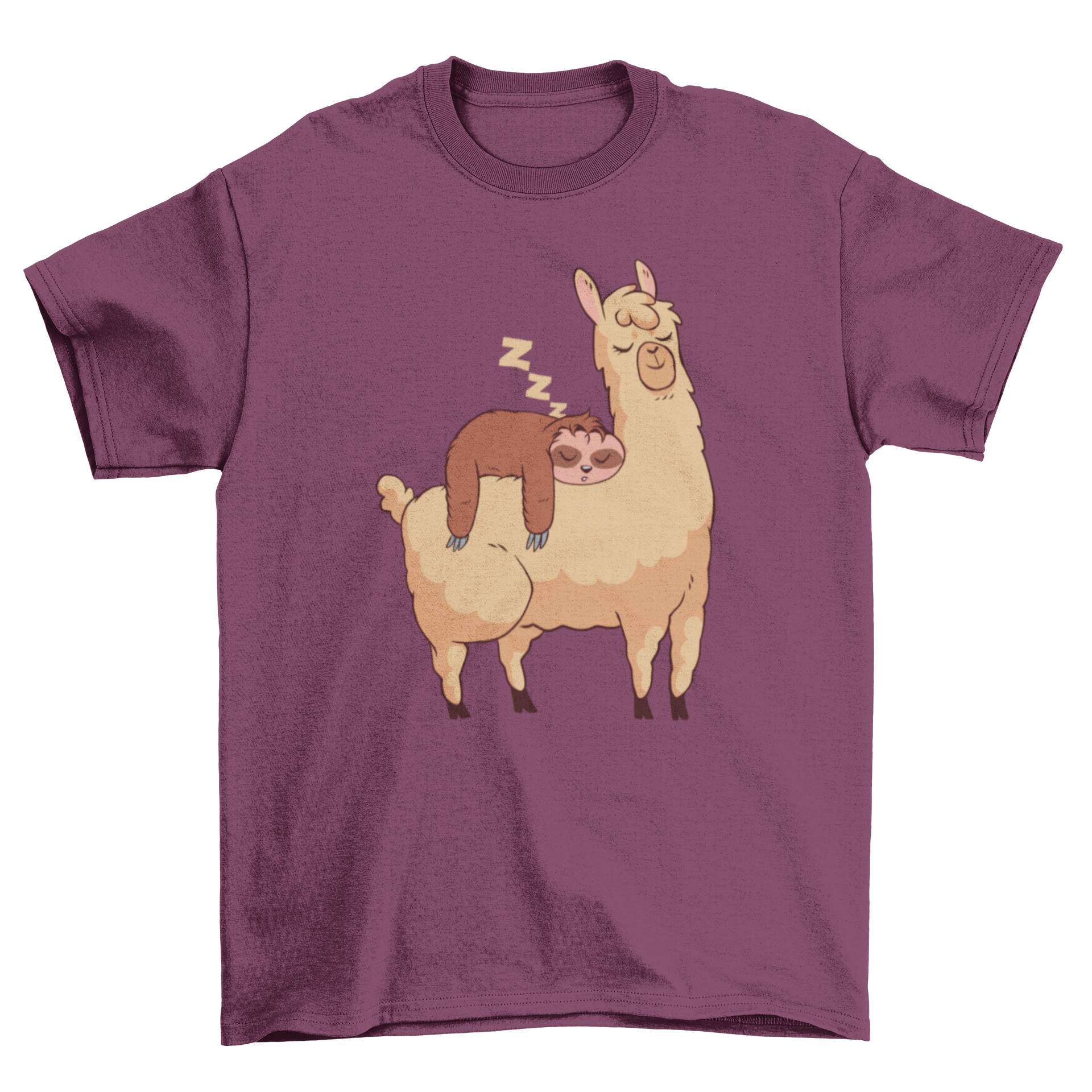 Illustration of a sloth sleeping on a llama, featured on a T-shirt.