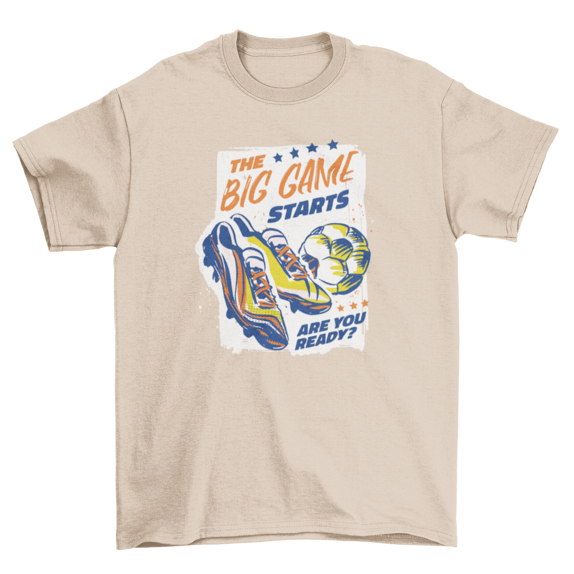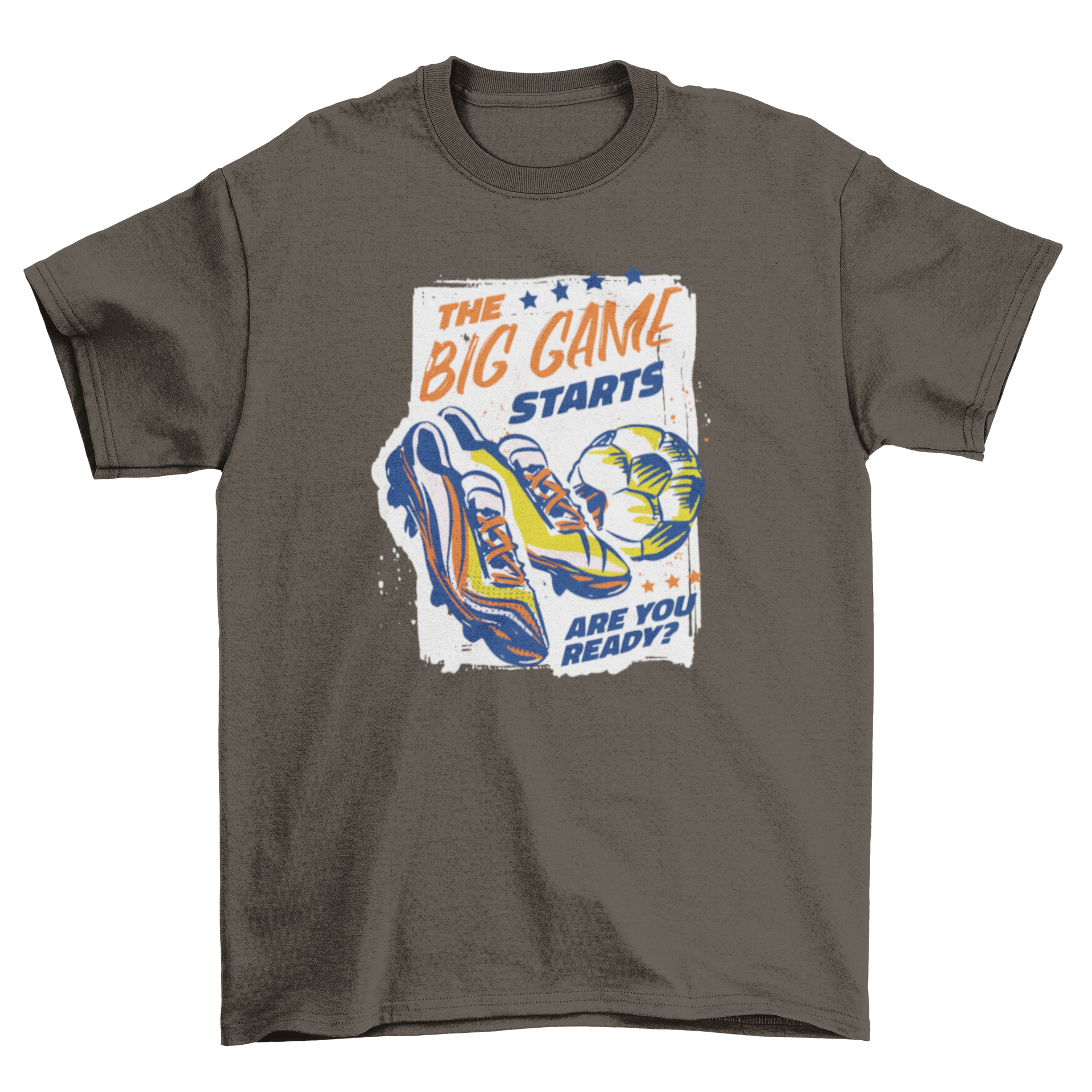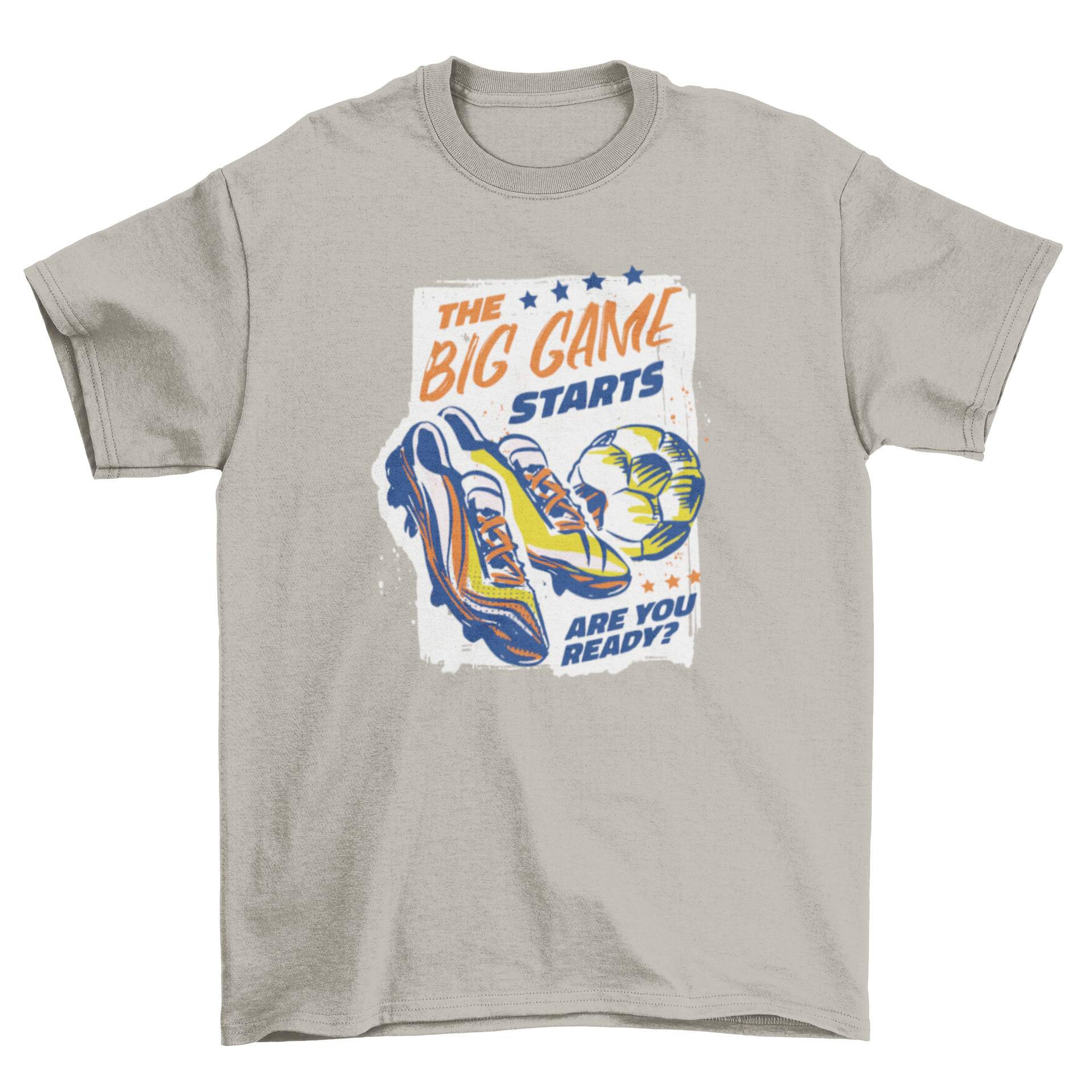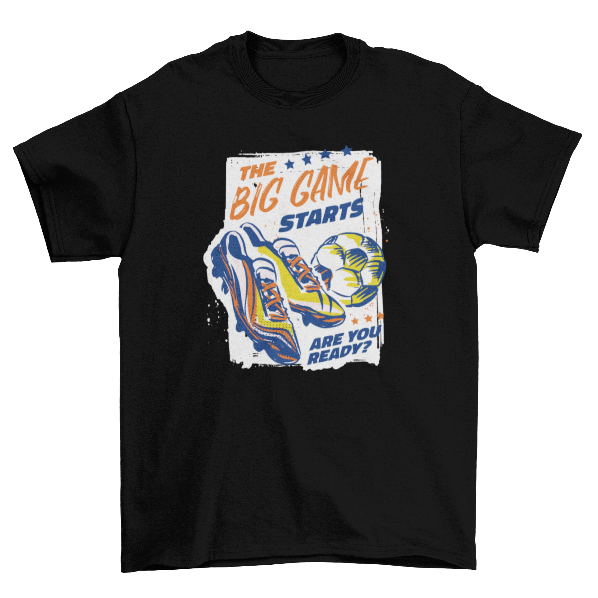 The eye-catching design of this t-shirt is sure to turn heads. Featuring the motivational quote, "The big game starts," it serves as a reminder of the excitement and passion that soccer brings. The bold typography and vibrant colors make it a standout piece in any wardrobe, allowing you to express your love for the game in style.