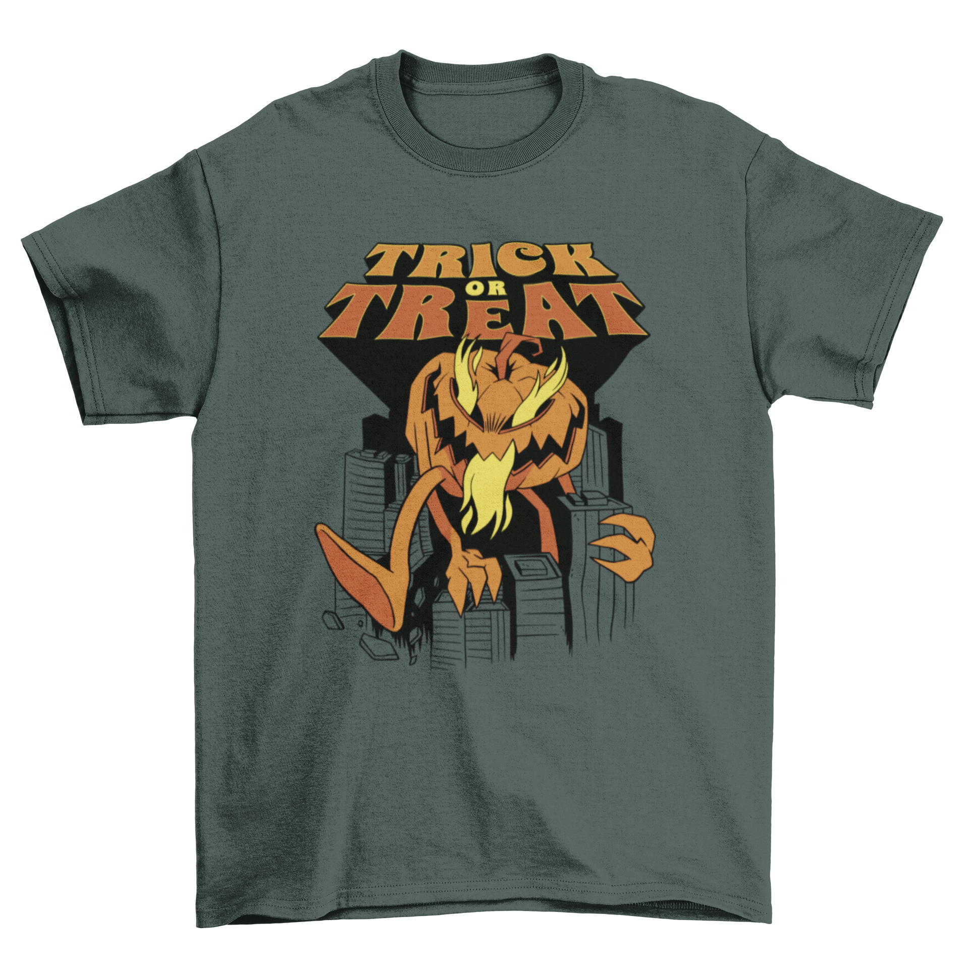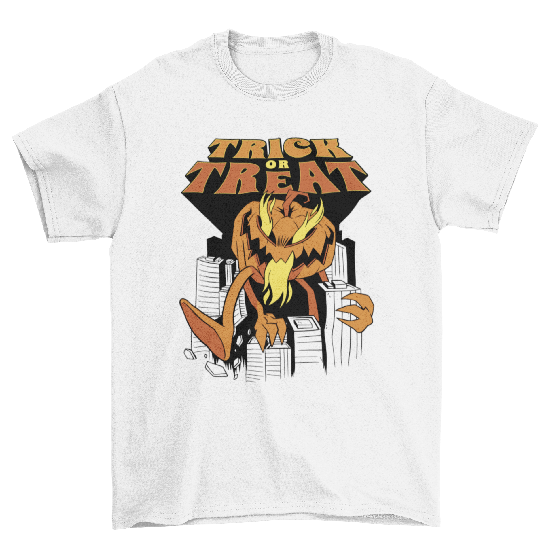 Embrace the Halloween spirit with our exclusive spooky pumpkin monster t-shirt. This unique design showcases a vibrant pumpkin monster wreaking havoc in a city, perfectly capturing the essence of Halloween fun and fright. The accompanying quote, 'Trick or treat', adds a playful touch, making it an ideal choice for Halloween parties, trick-or-treating, or casual wear during the spooky season.
