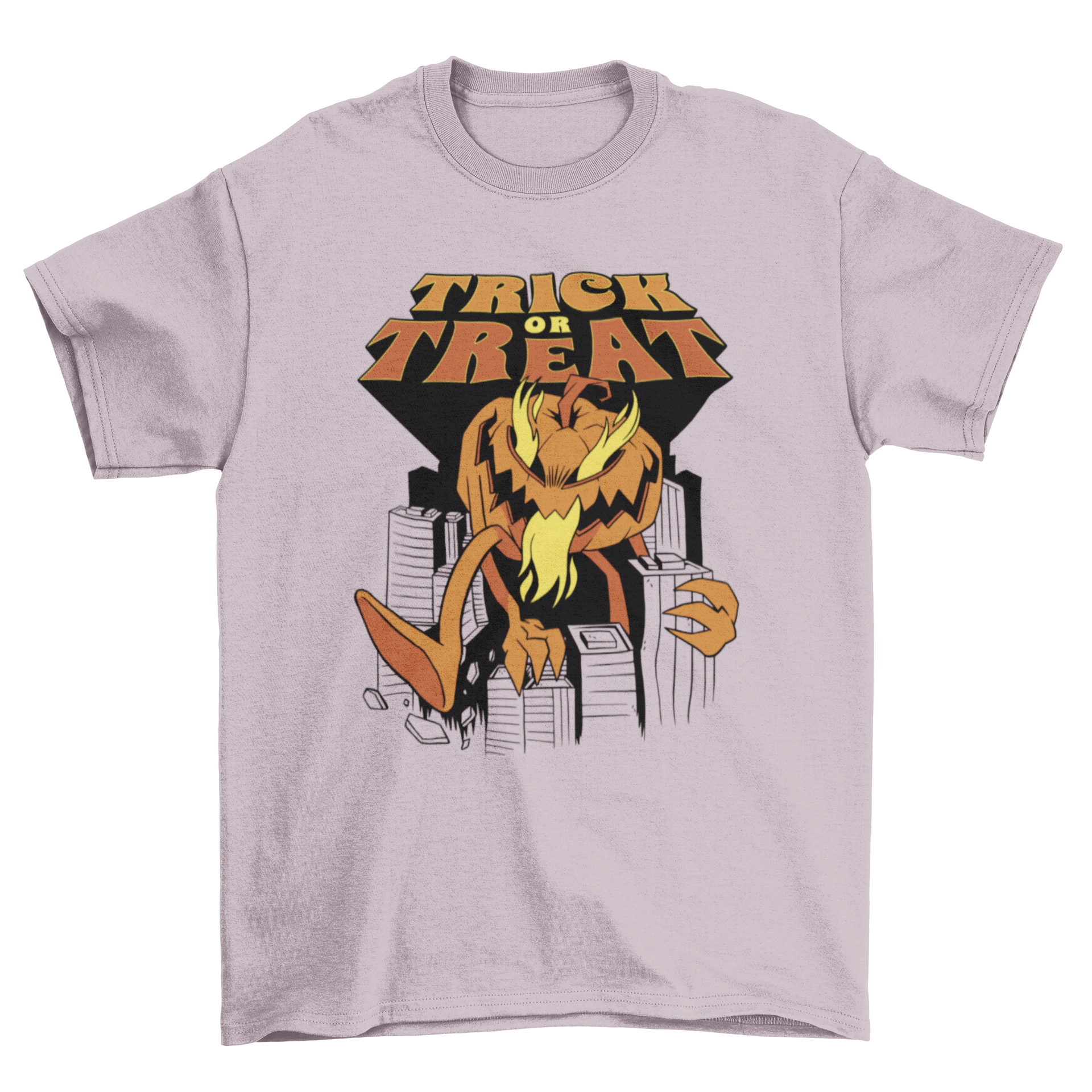 The t-shirt features a striking illustration of a pumpkin monster, designed to stand out and grab attention. The monster is depicted in a dynamic pose, as if it's playfully attacking the city, creating a sense of excitement and adventure. The colors are bold and vivid, ensuring that the design pops against the fabric, making it a great conversation starter.