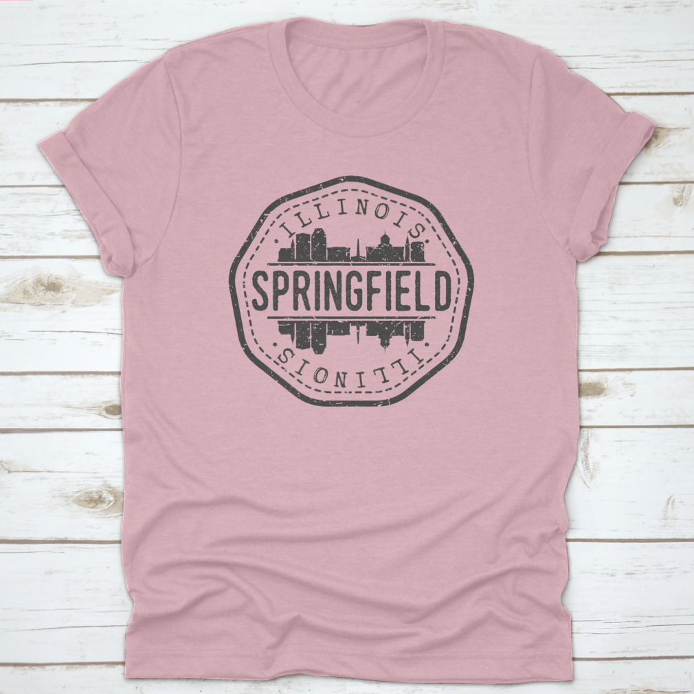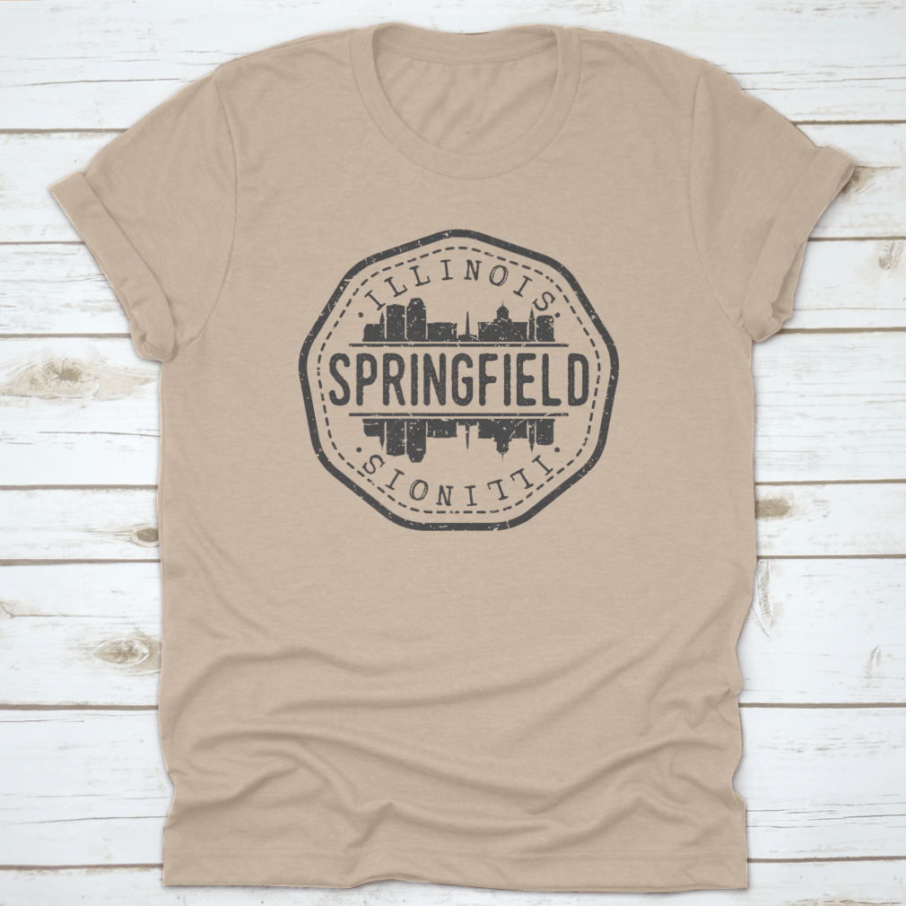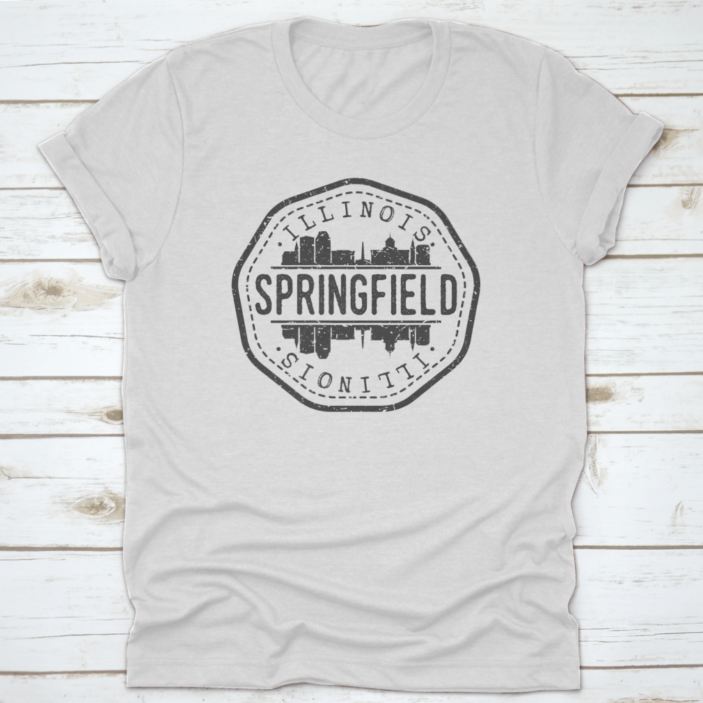 Springfield, IL Skyline Stamp Postmark T-shirt featuring a silhouette design on a soft cotton fabric.