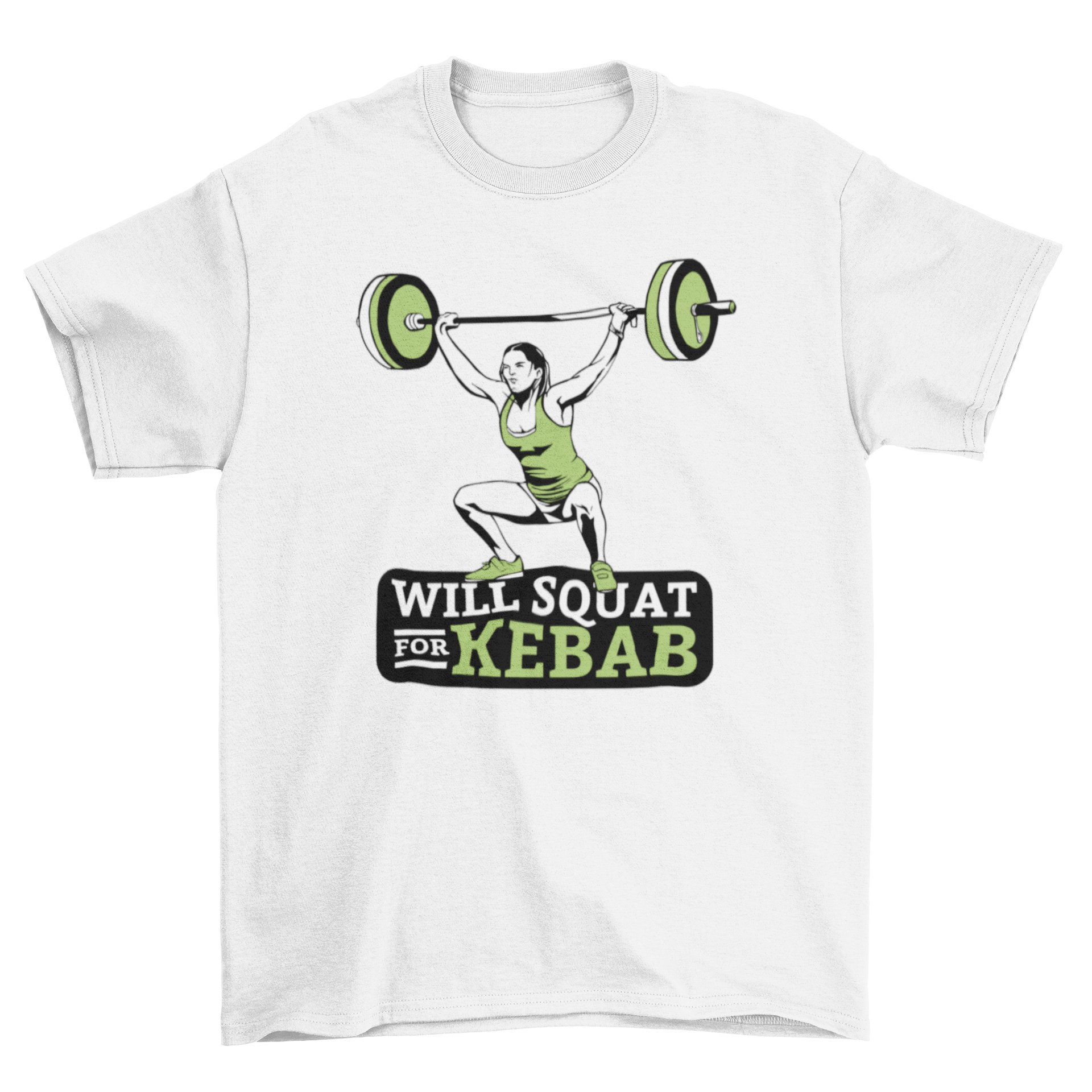 Introducing our exclusive 'Will Squat for Kebab' t-shirt design, a perfect blend of fitness motivation and humor. This unique t-shirt features a vibrant illustration of a woman weightlifting, embodying strength and determination. The playful quote, 'Will Squat for Kebab,' adds a fun twist, making it an ideal choice for those who love to combine their passion for fitness with their love for delicious food.