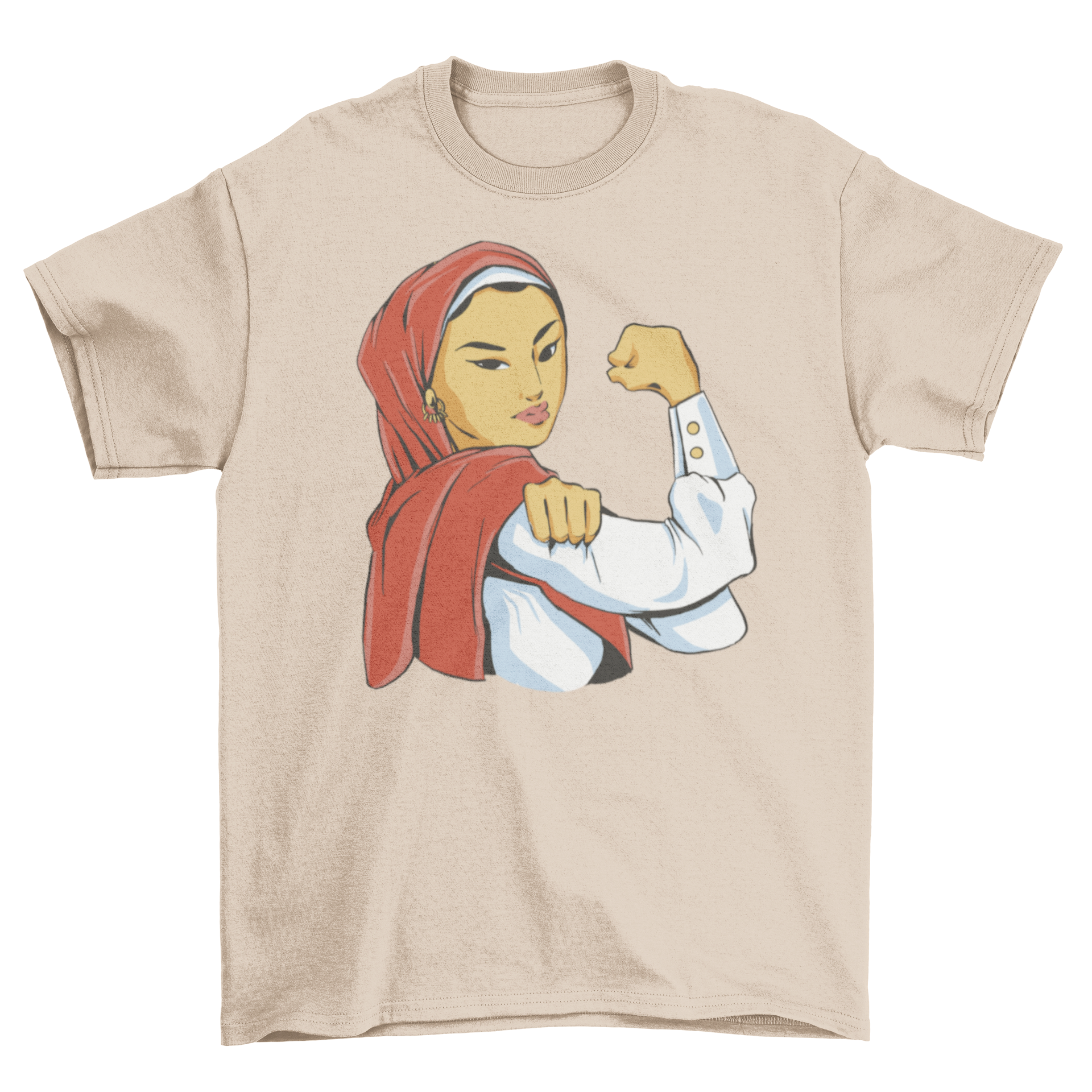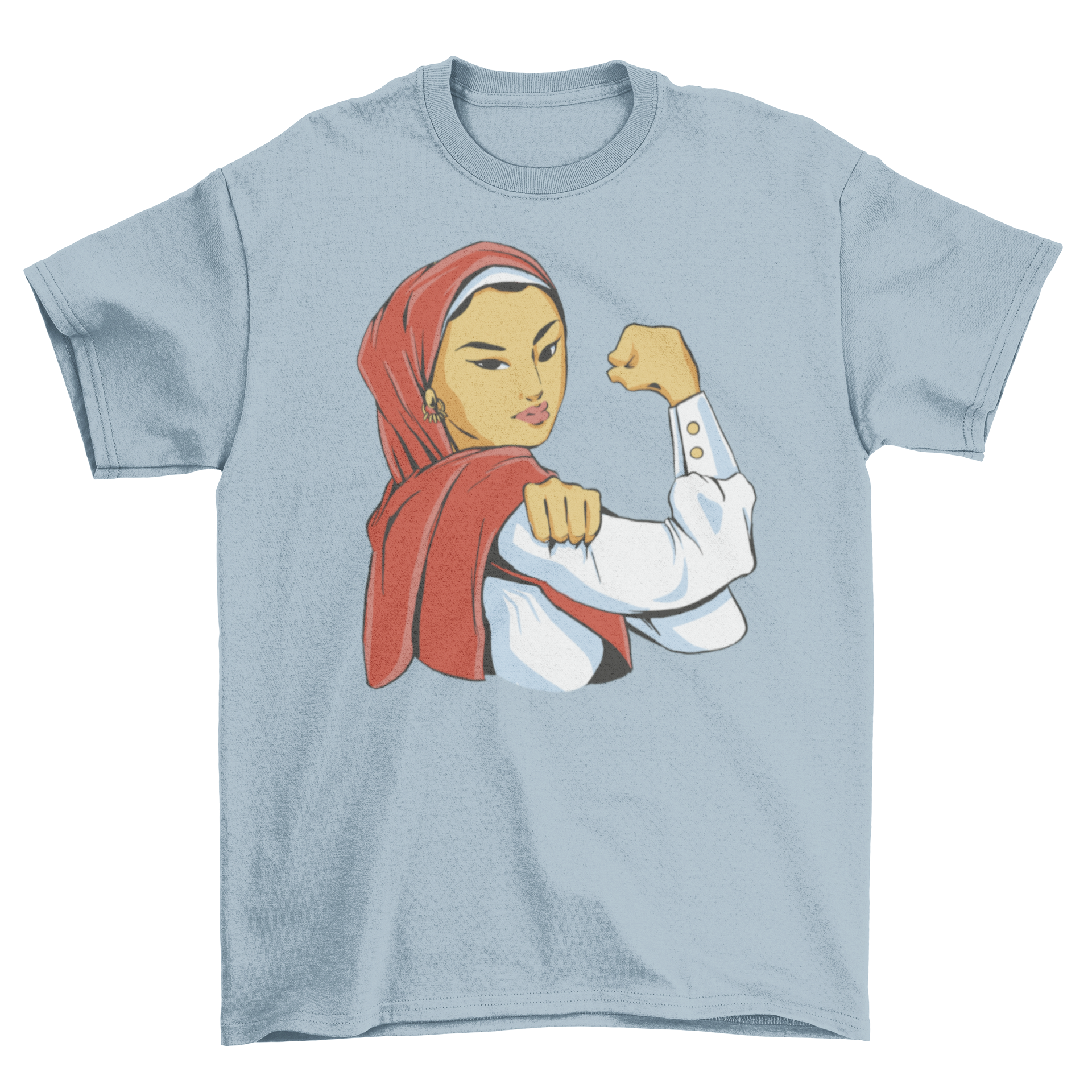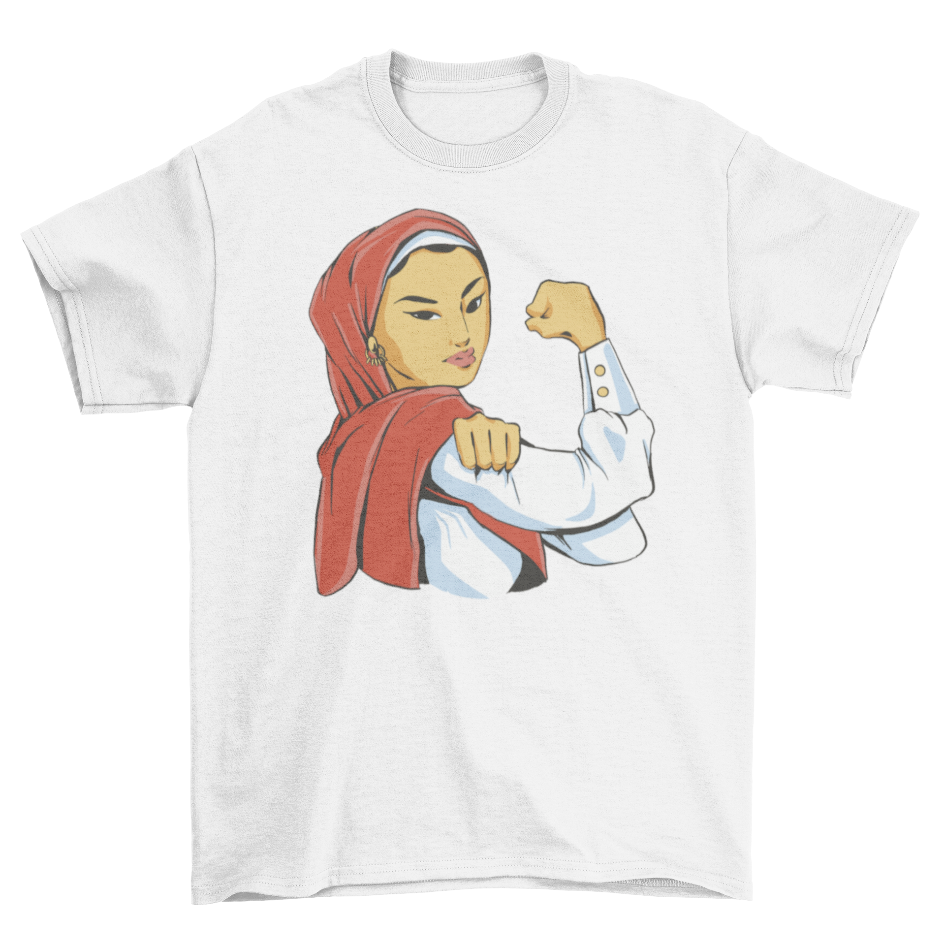 Strong Muslim woman feminist t-shirt featuring a design of a Muslim woman flexing her arm, symbolizing empowerment and strength.