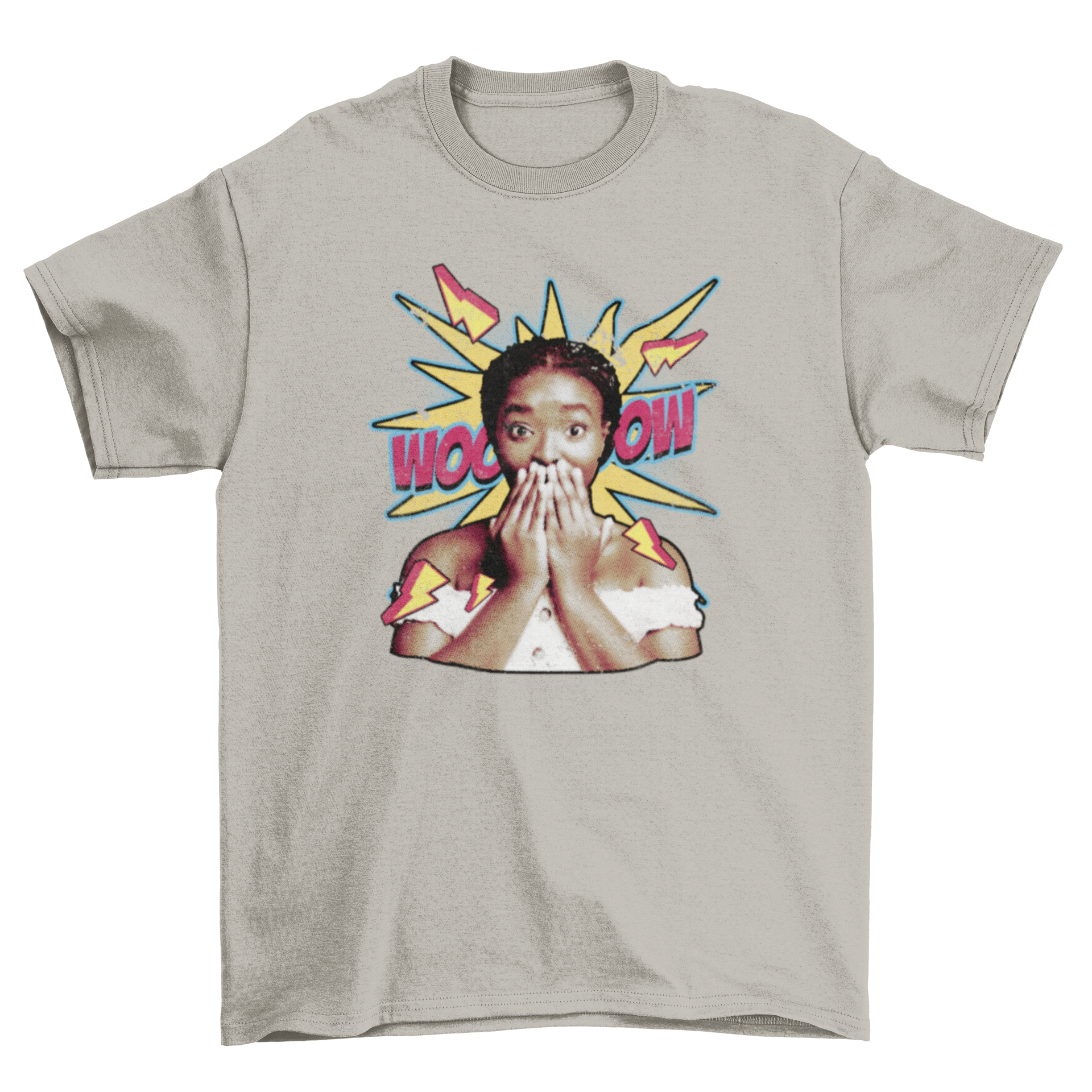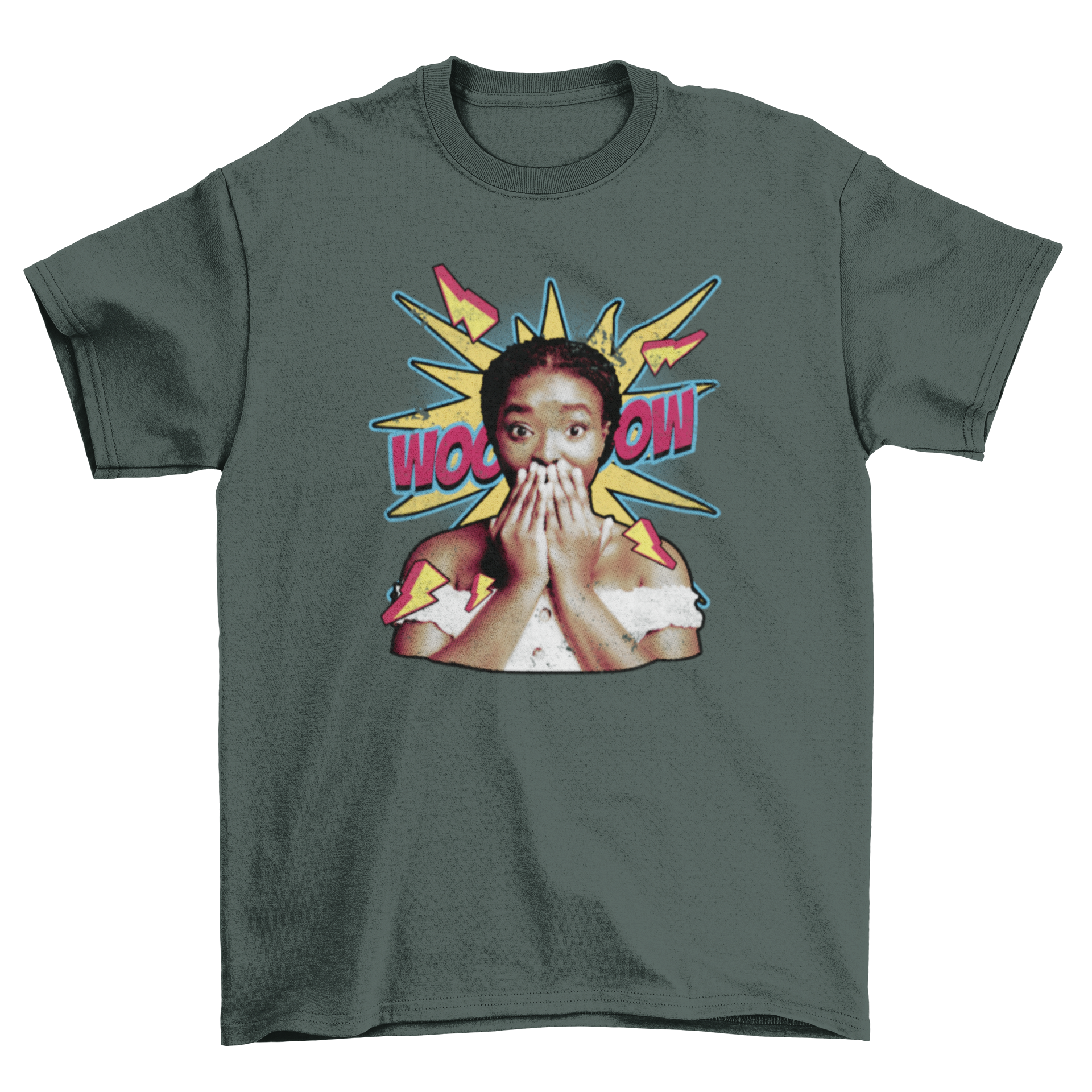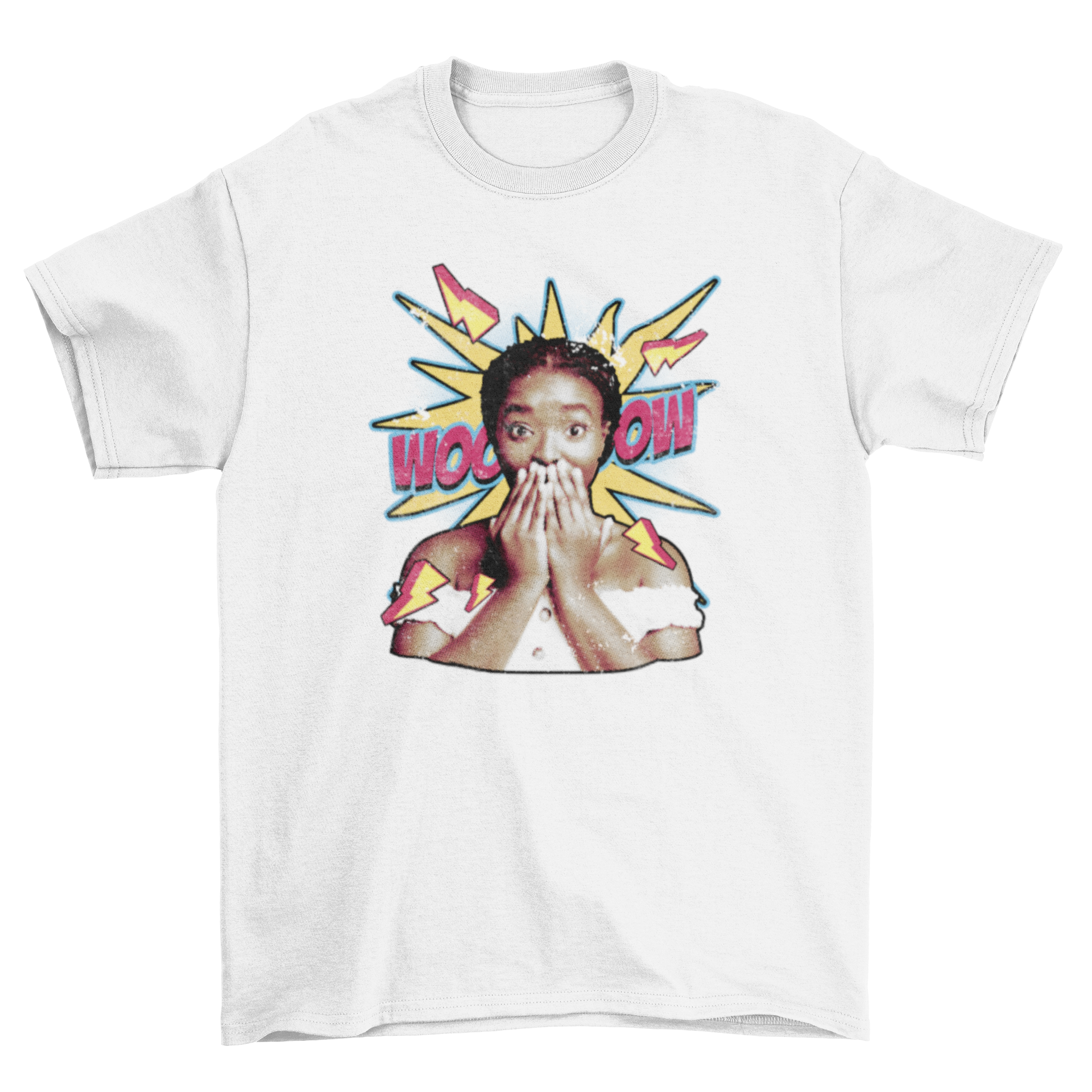 The design of this t-shirt is inspired by comic book art, making it a trendy choice for fans of graphic novels and pop culture. The surprised expression of the woman captures a moment of joy and excitement, resonating with anyone who loves to express their personality through their attire. The bright colors and bold graphics ensure that you stand out in any crowd.