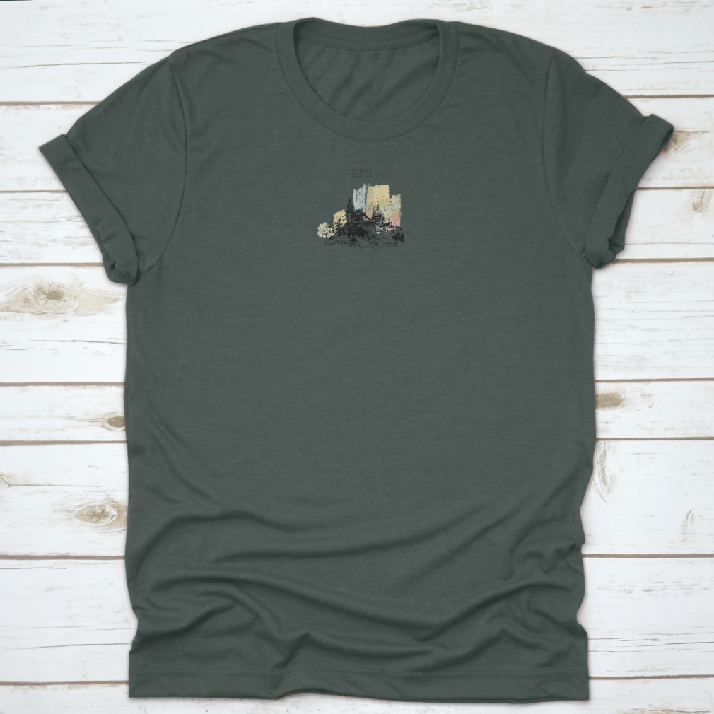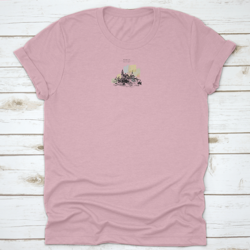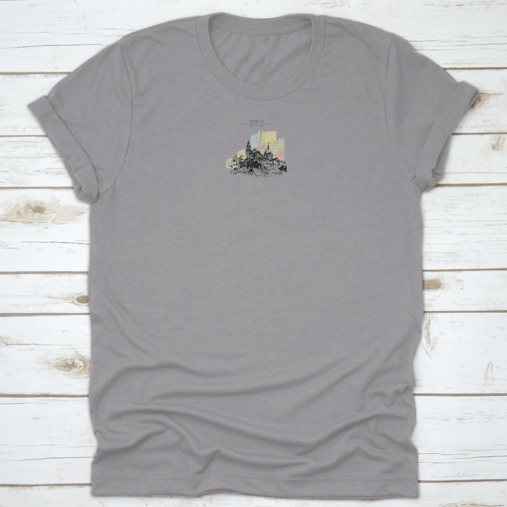 Hand-drawn design of The Manila Cathedral on a comfortable t-shirt, showcasing intricate architectural details.