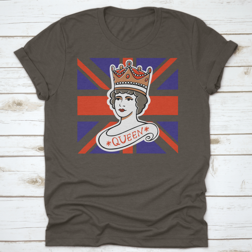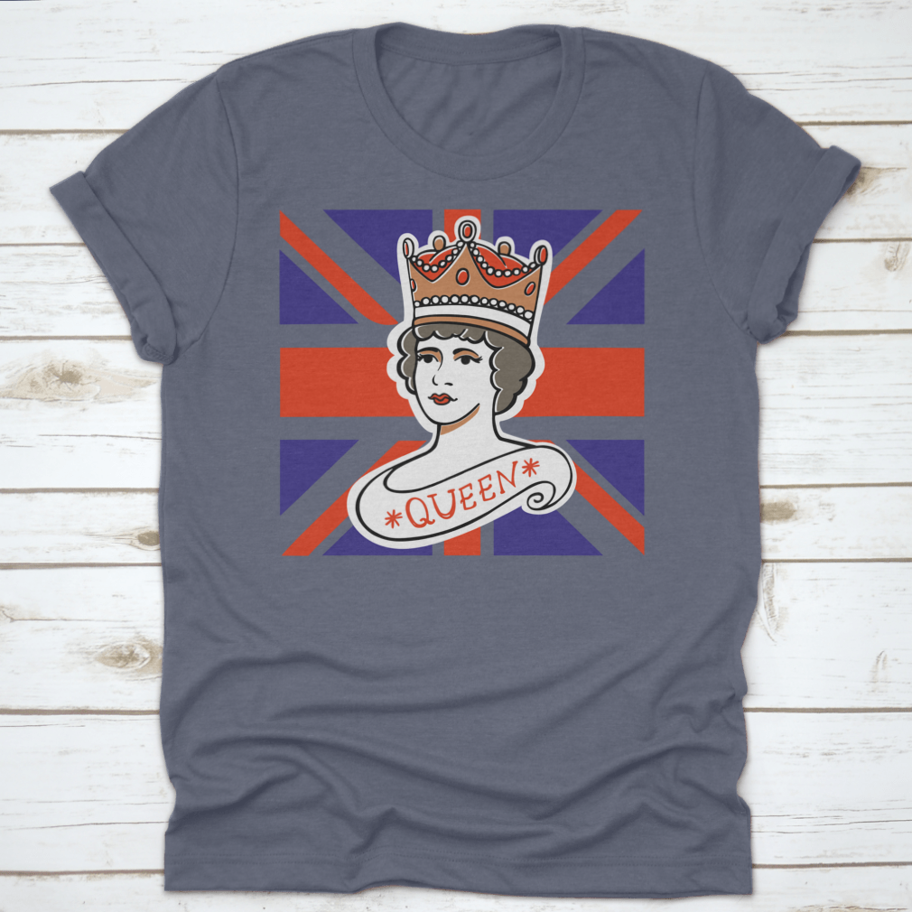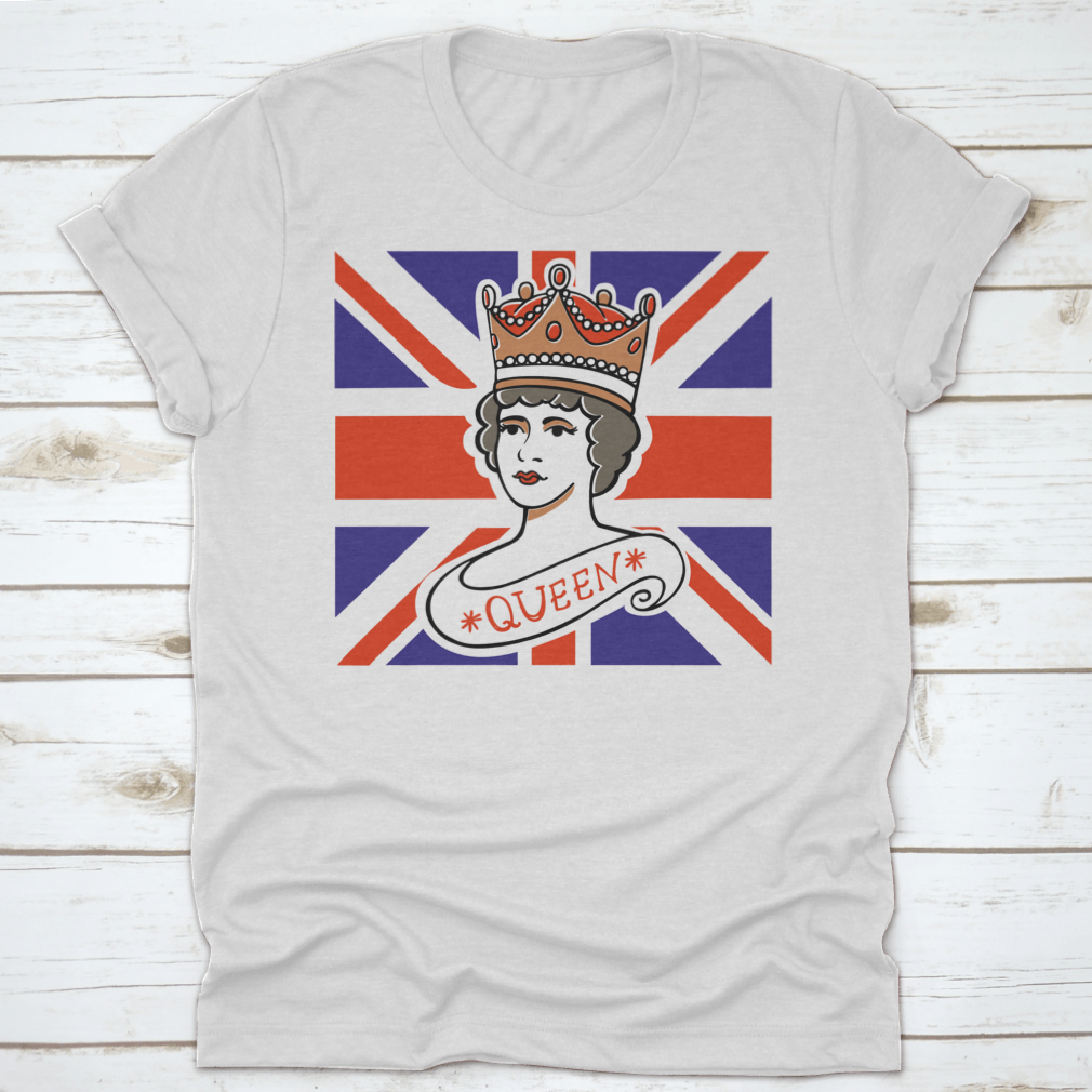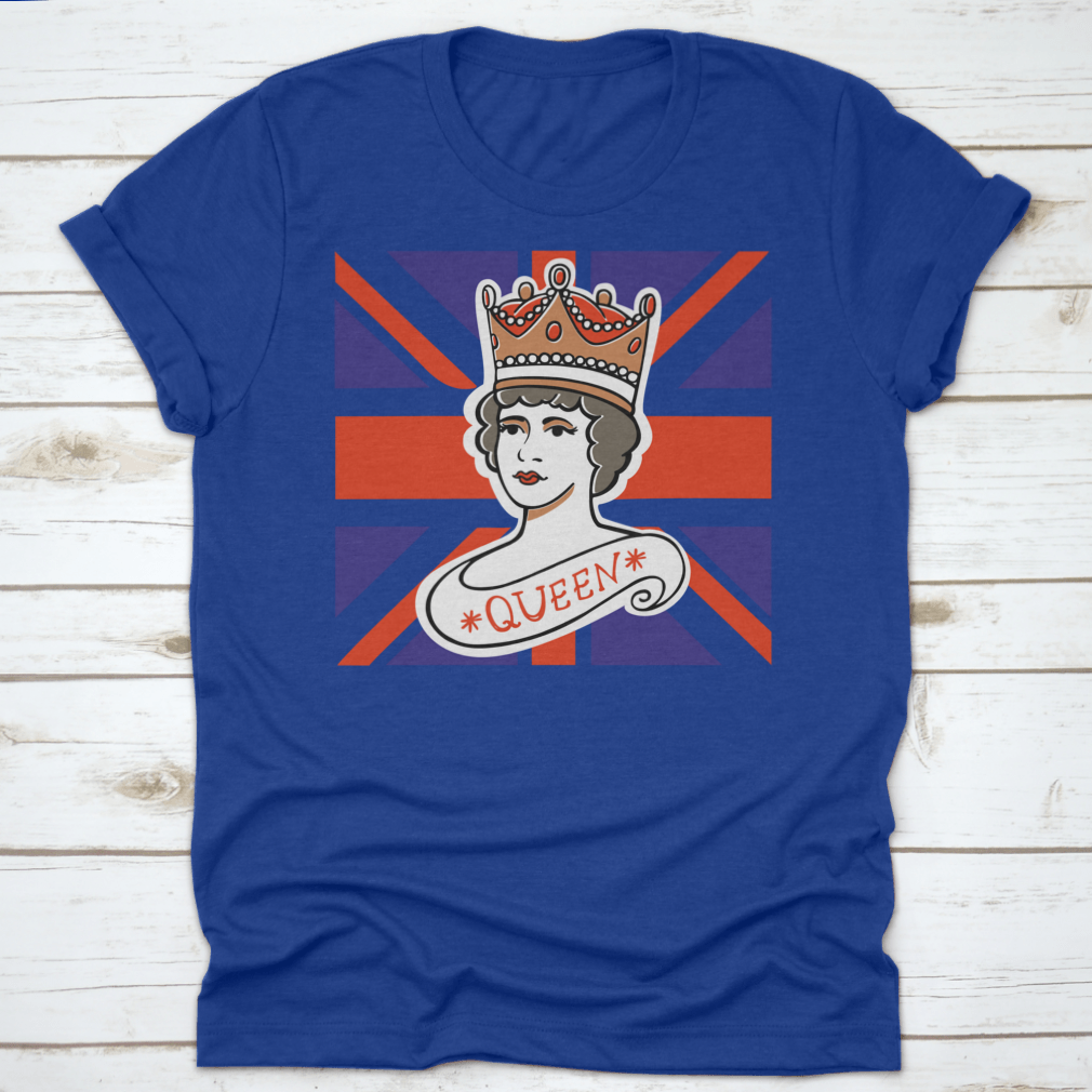 A classic cotton t-shirt featuring a portrait of the Queen, representing the UK, Canada, Australia, and New Zealand, showcasing vibrant colors and quality fabric.