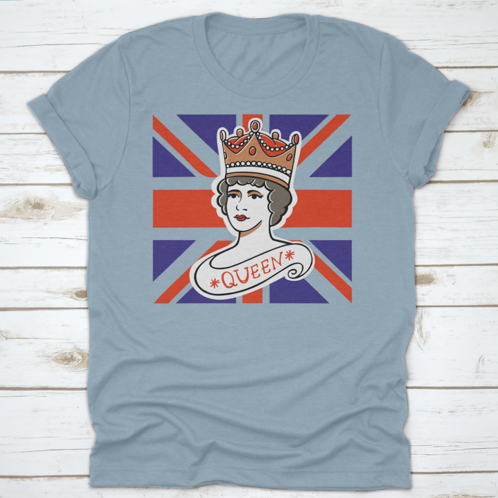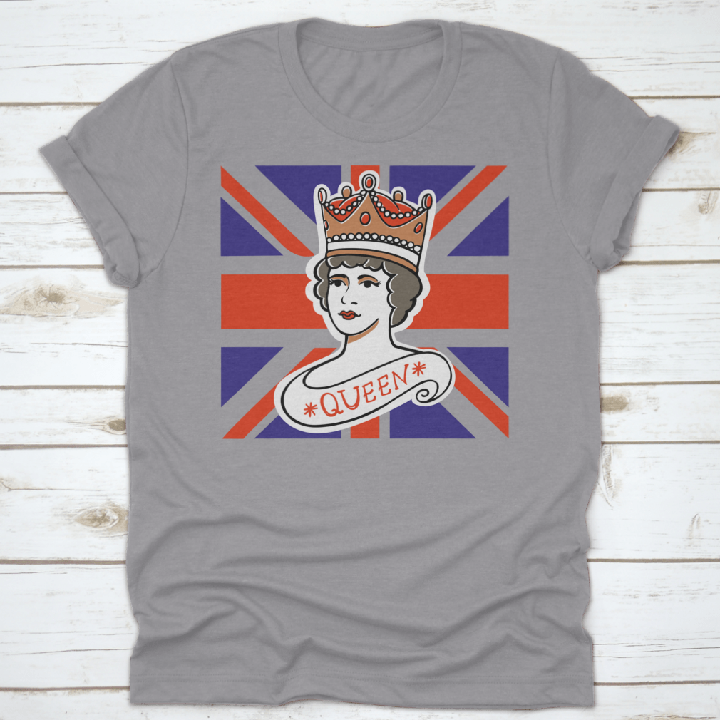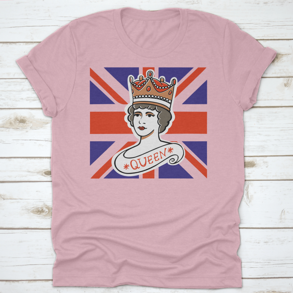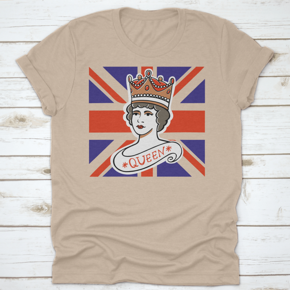 A classic cotton t-shirt featuring a portrait of the Queen, representing the UK, Canada, Australia, and New Zealand, showcasing vibrant colors and quality fabric.