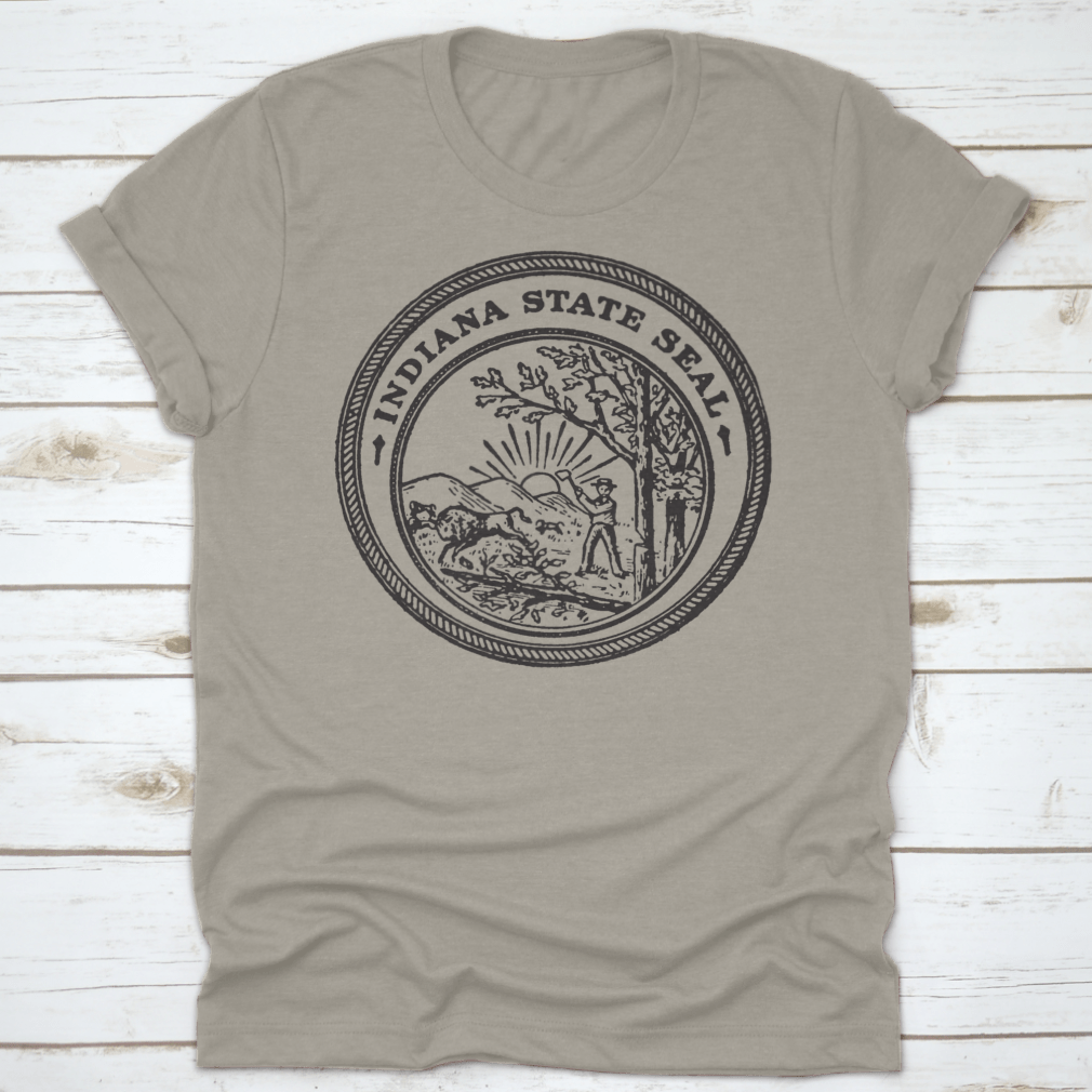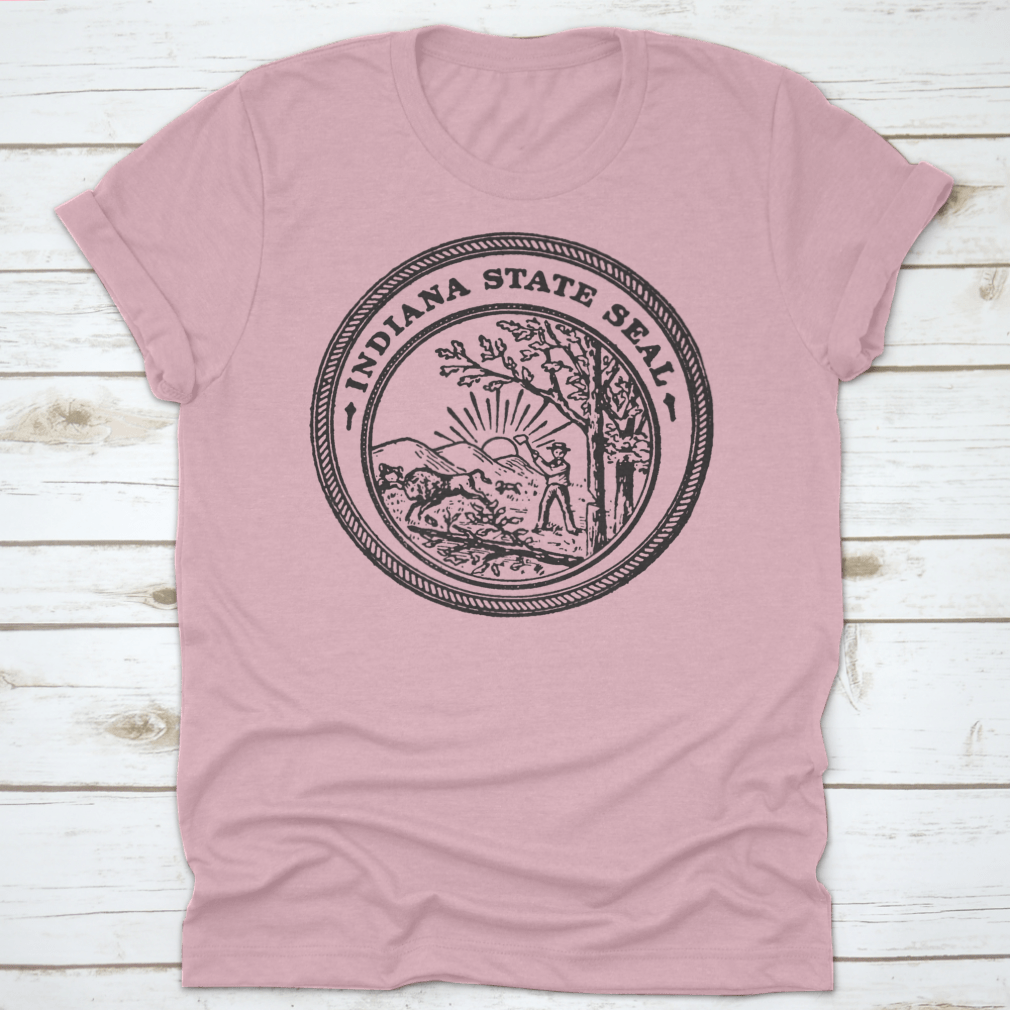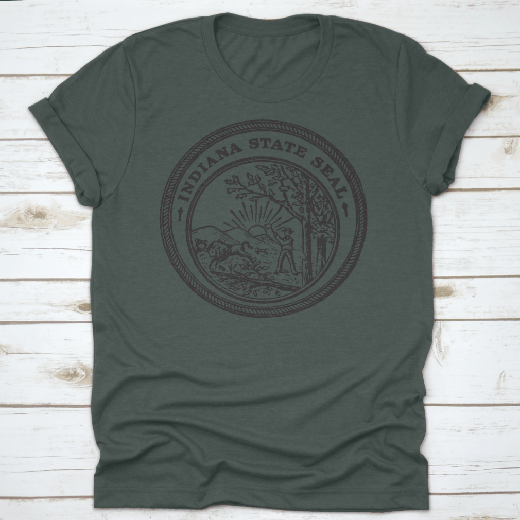 A classic T-shirt featuring the Seal of the State of Indiana with a sunrise design, made from 100% cotton.