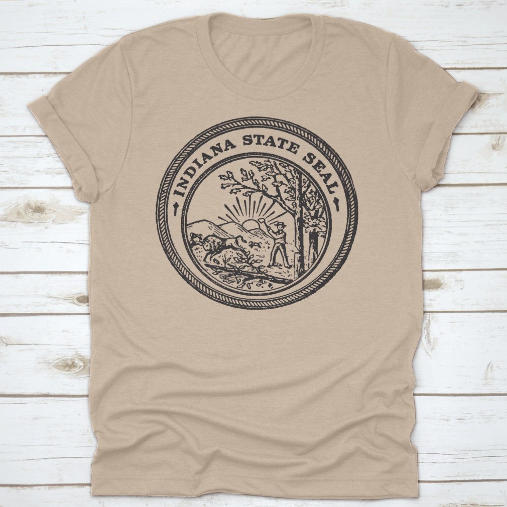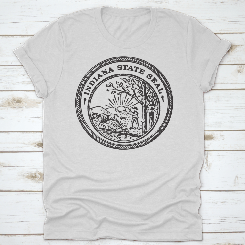 Introducing the Seal of the State of Indiana T-shirt, a perfect blend of style and comfort. This classic tee showcases a beautifully designed circle seal featuring a sunrise, symbolizing the rich heritage and pride of Indiana. Made from high-quality materials, this shirt is not only fashionable but also functional, making it an ideal choice for any occasion.