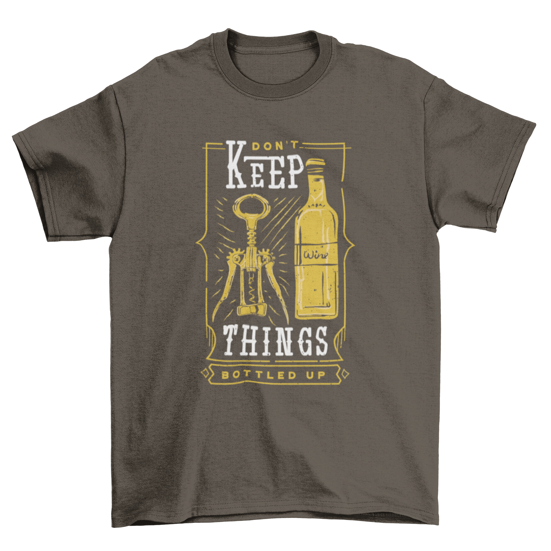 Introducing the Things Bottled Up T-shirt, a unique and stylish addition to your wardrobe that encourages self-expression and openness. This t-shirt features a captivating vintage design that showcases a bottle with an opener, accompanied by the thought-provoking quote, "Don't keep things bottled up." This design not only makes a fashion statement but also serves as a reminder to share your feelings and thoughts with the world.