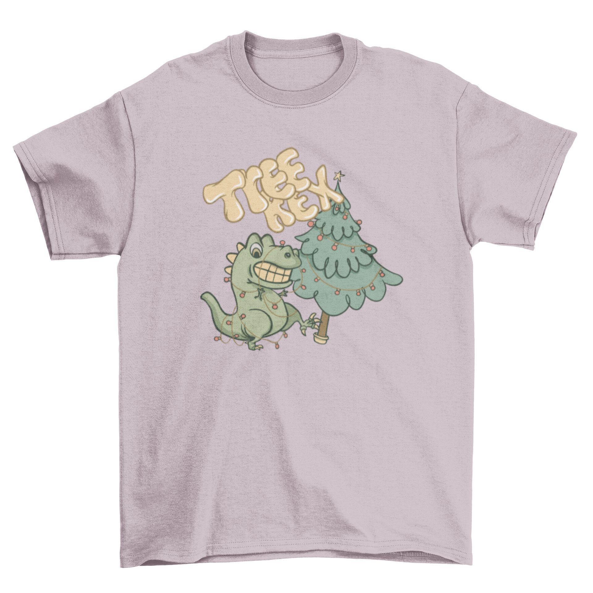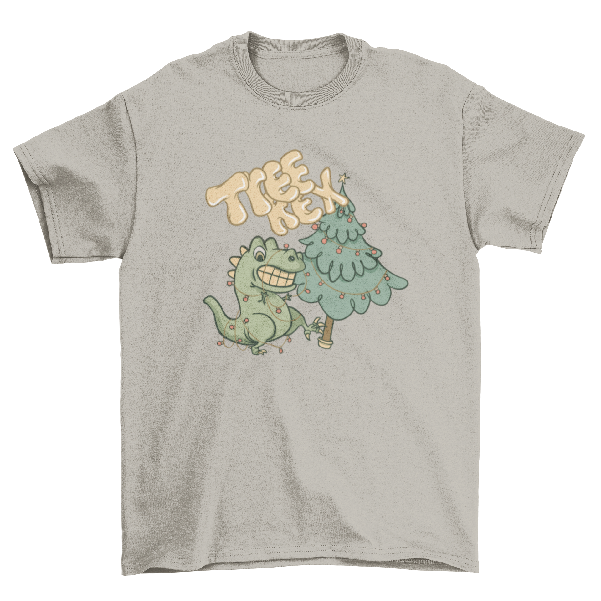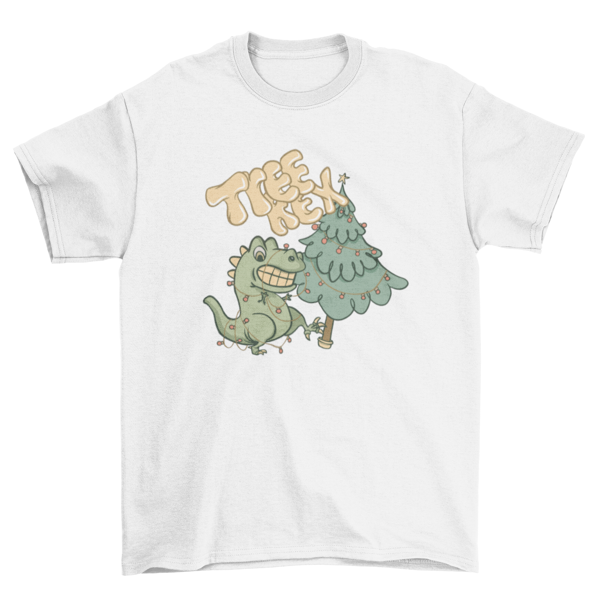 A humorous Tree Rex T-shirt featuring a T-rex and Christmas tree design with the caption 'Tree Rex'.