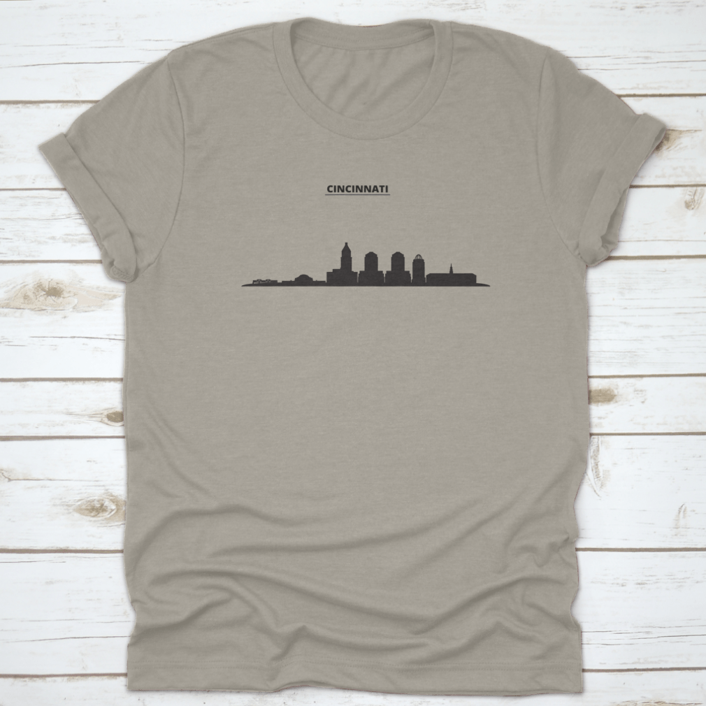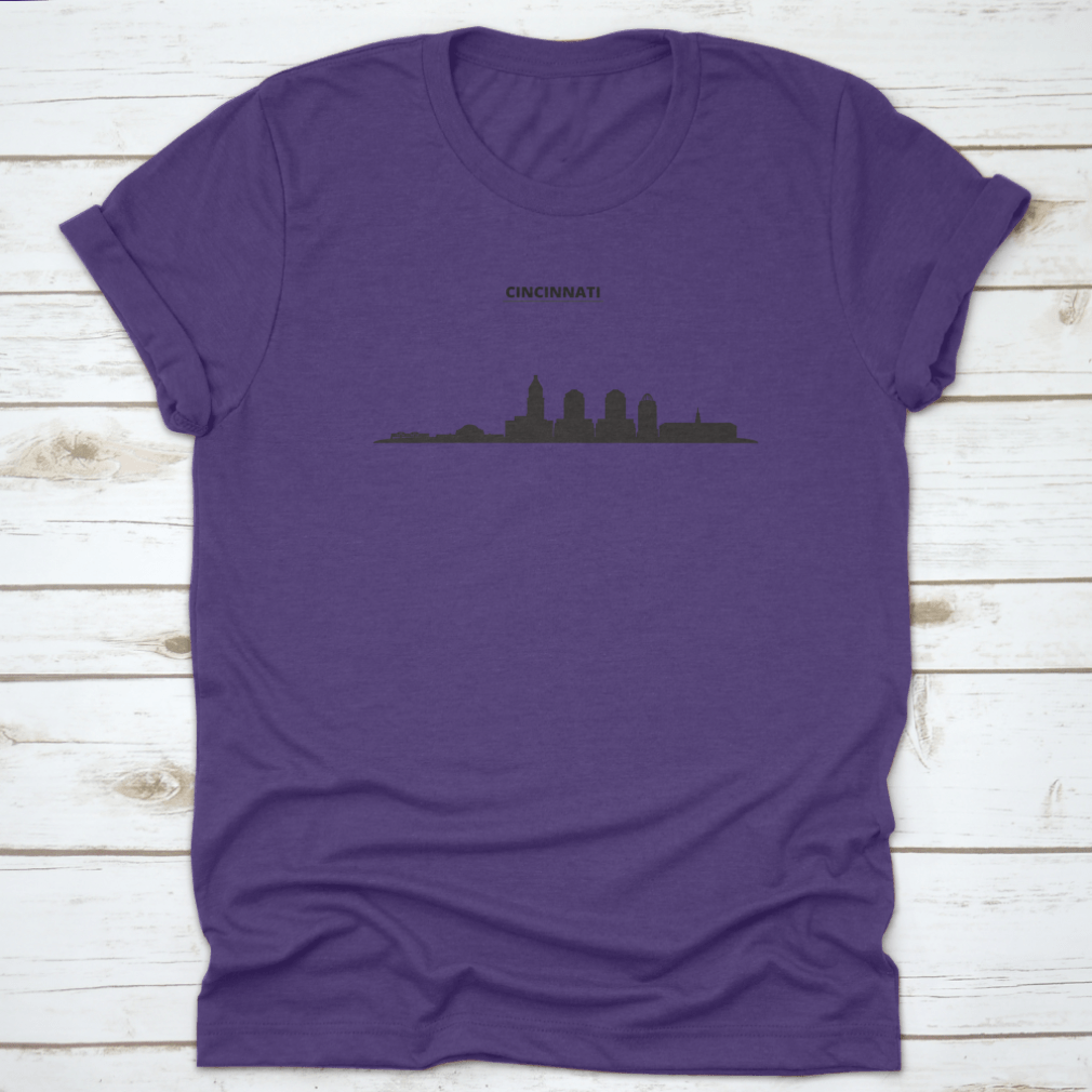 The stunning image featured on this T-shirt is by iconim from the Shutterstock Collection, capturing the essence of Cincinnati's skyline. This artistic representation adds a unique touch to the shirt, making it a standout piece in your wardrobe.
