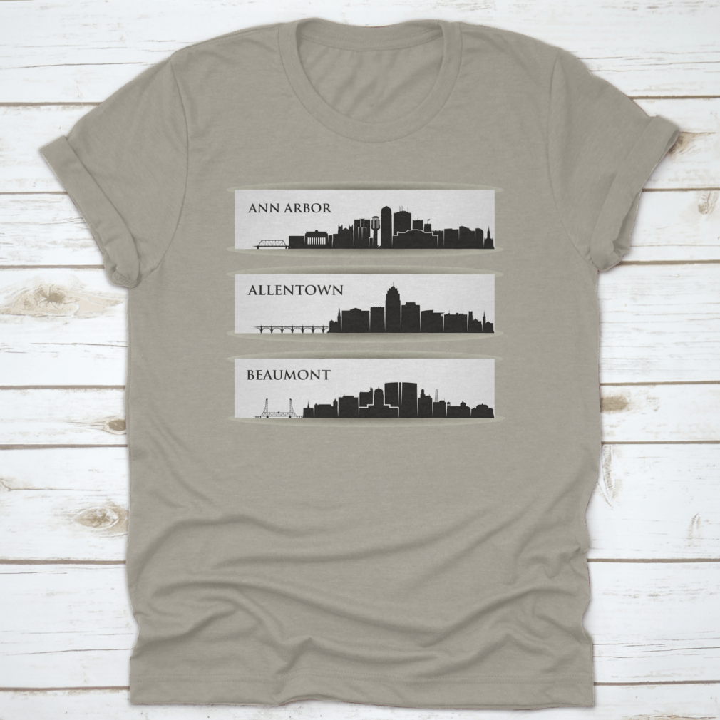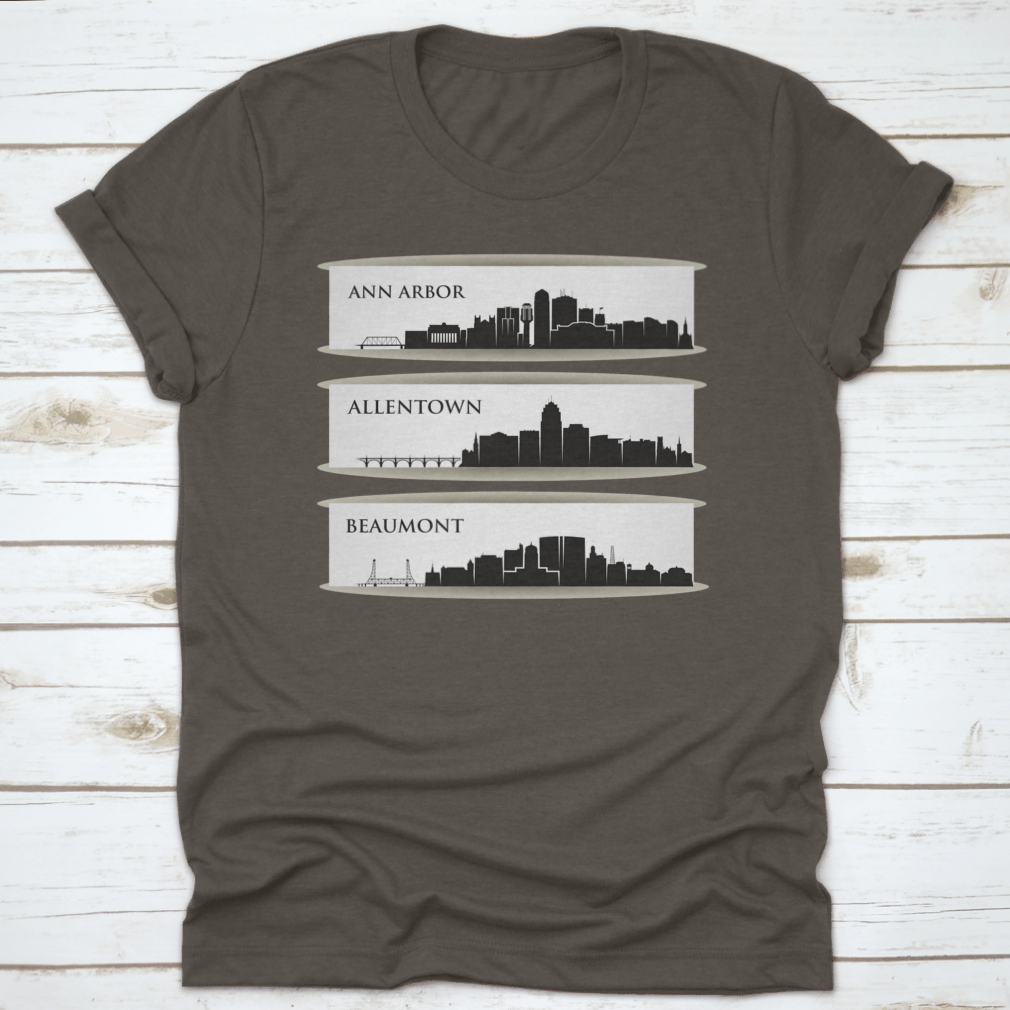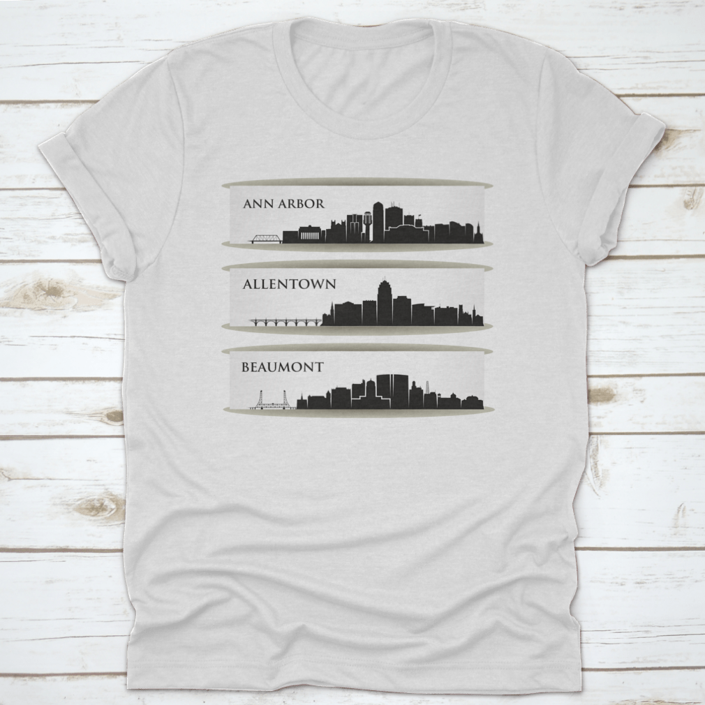 A stylish t-shirt featuring the skyline of Ann Arbor, Michigan, made from 100% cotton with a classic fit.