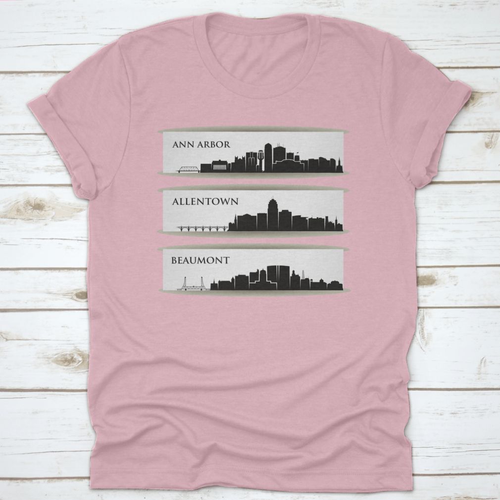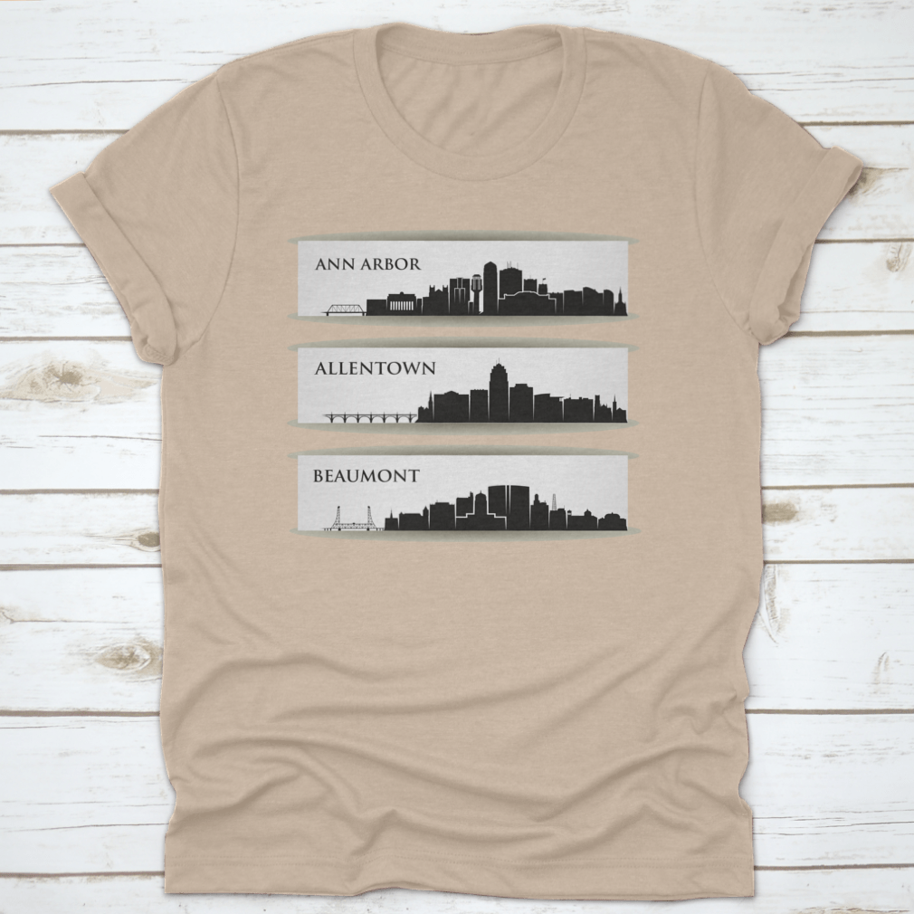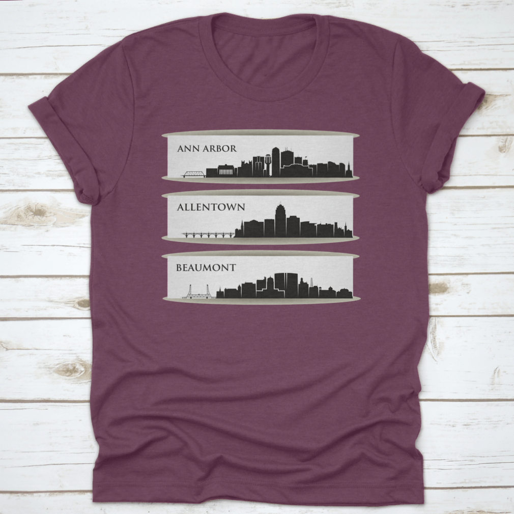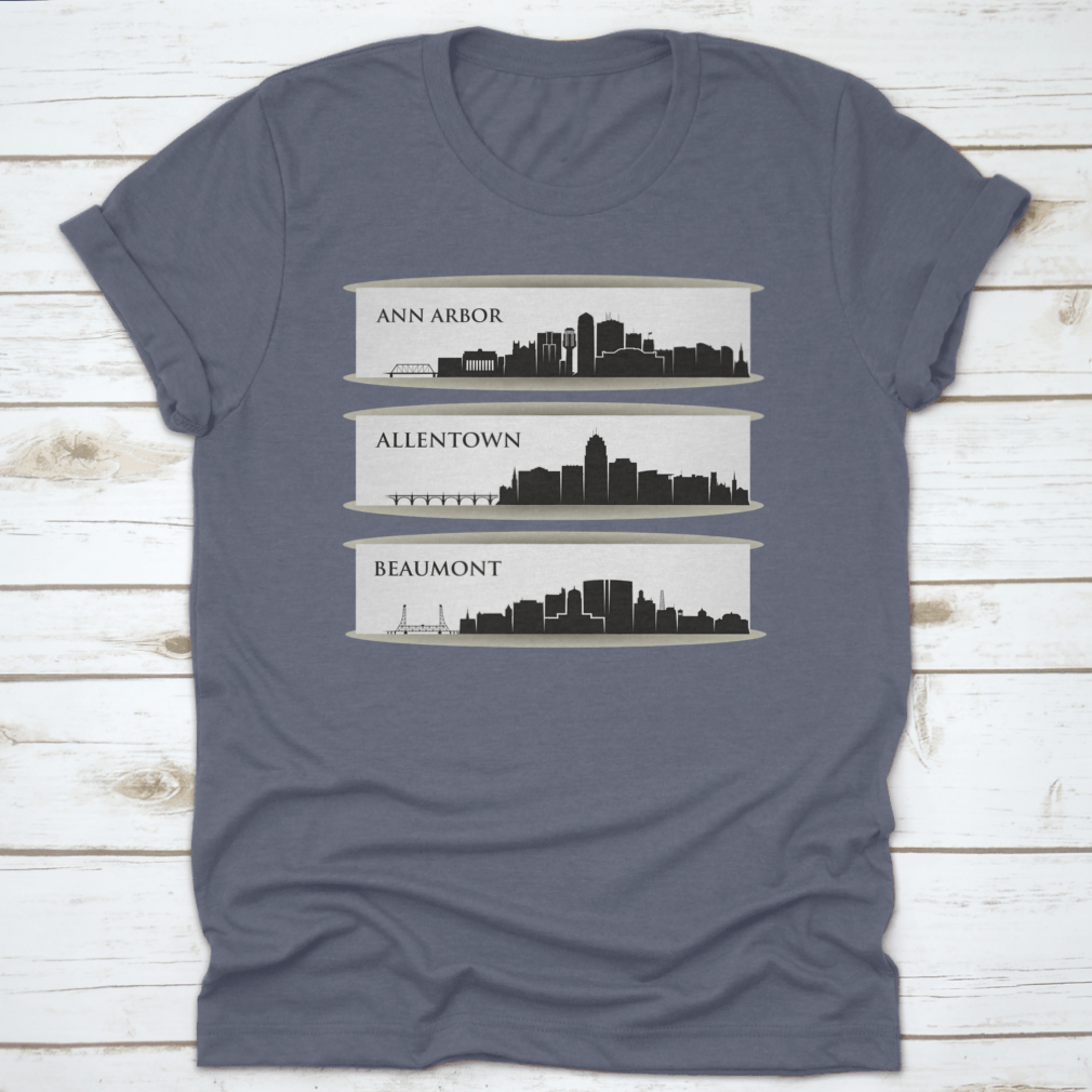 A stylish t-shirt featuring the skyline of Ann Arbor, Michigan, made from 100% cotton with a classic fit.