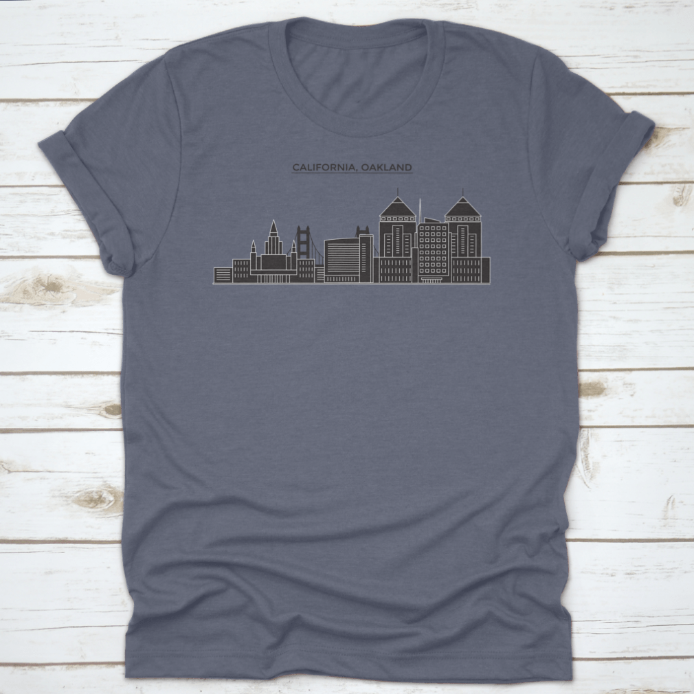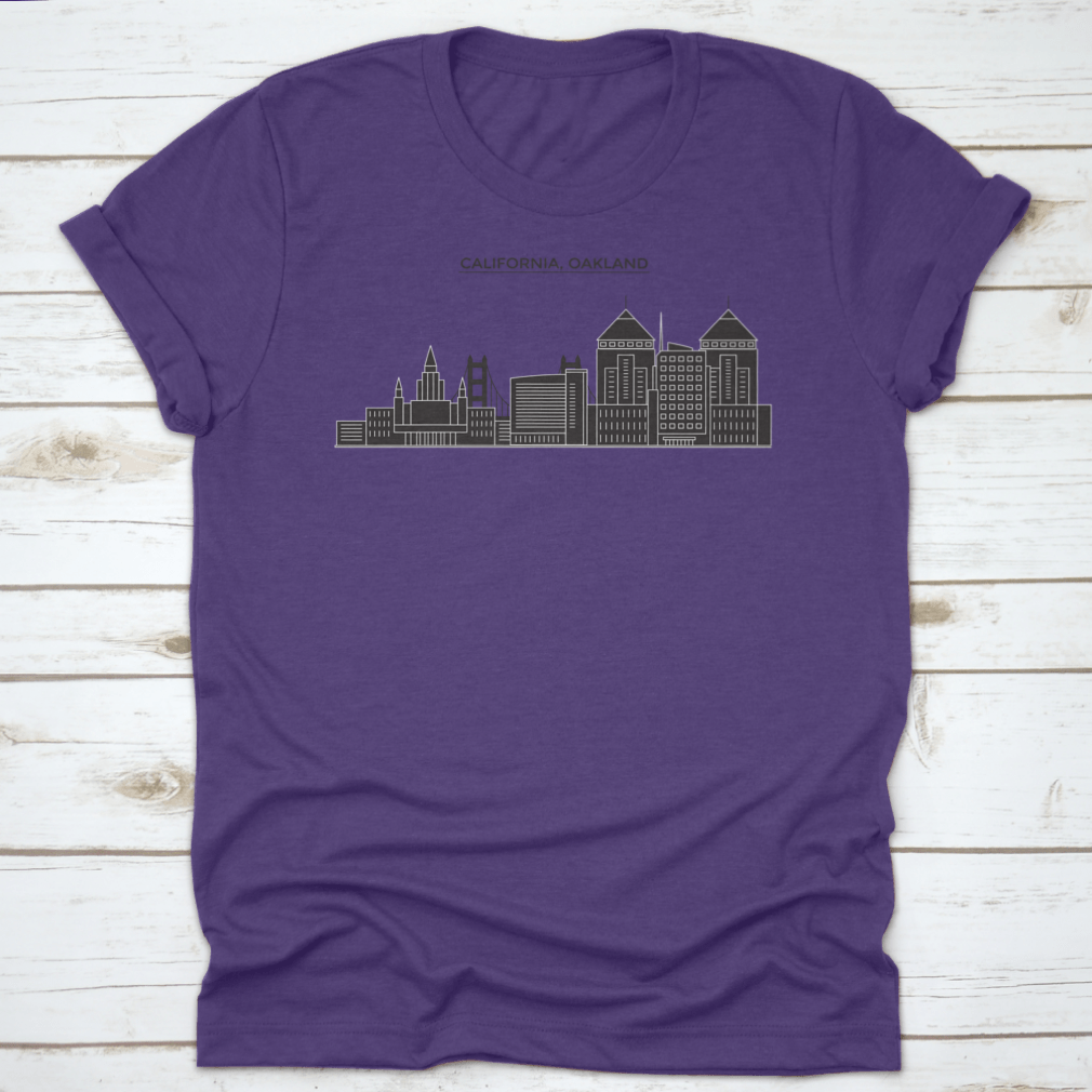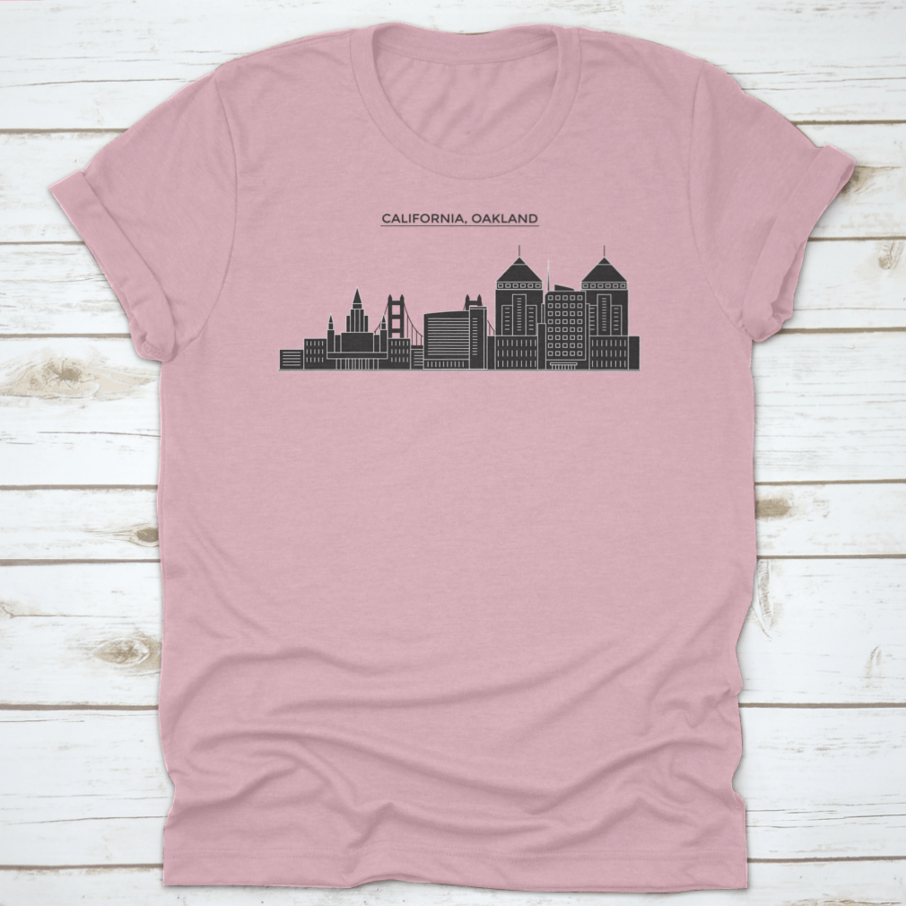 A stylish t-shirt featuring the Oakland city skyline, showcasing iconic architecture in a comfortable fit.