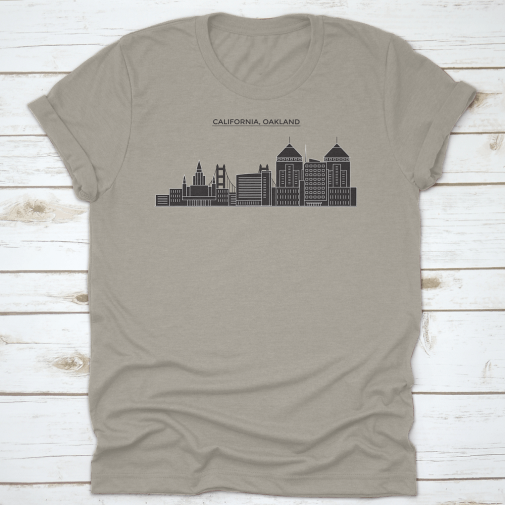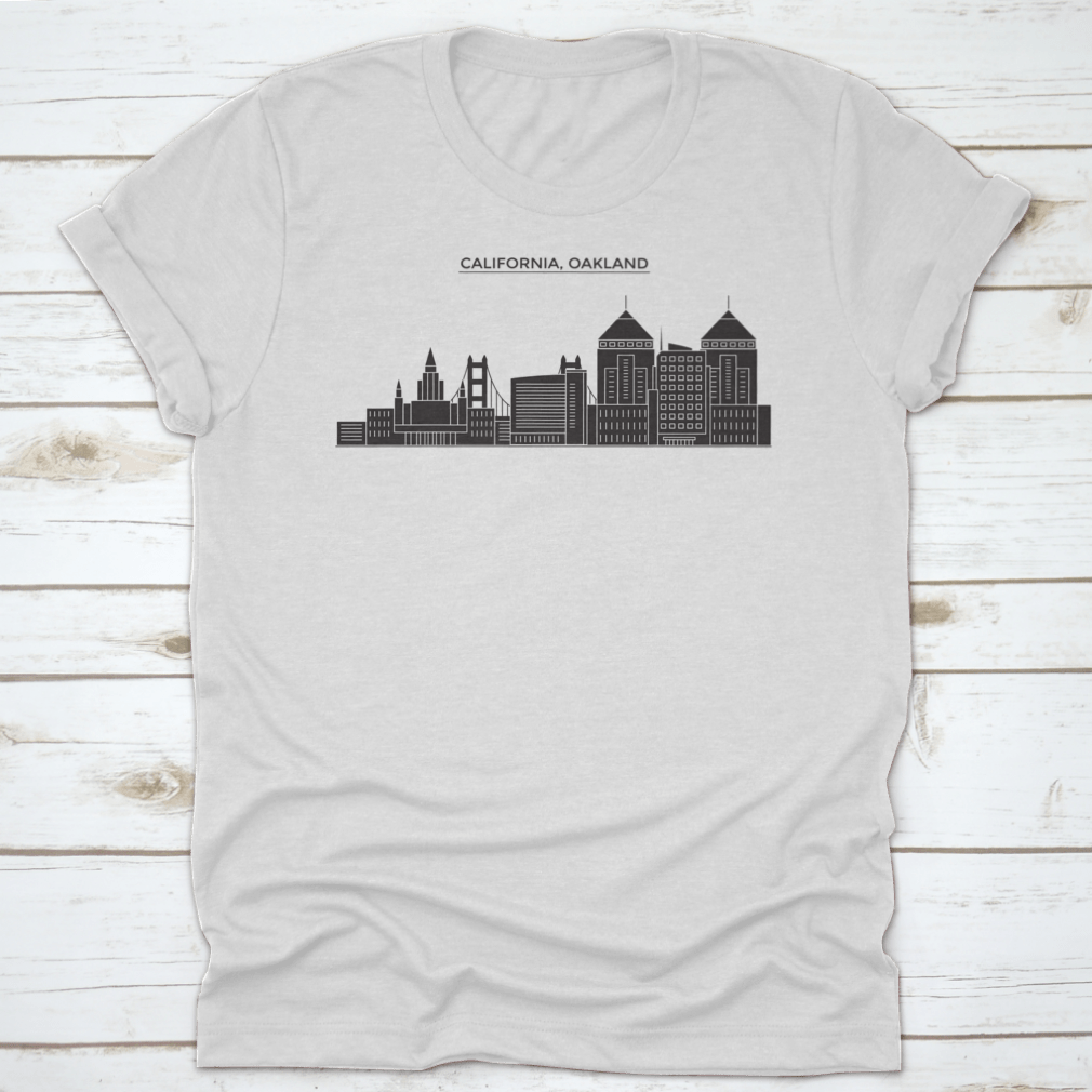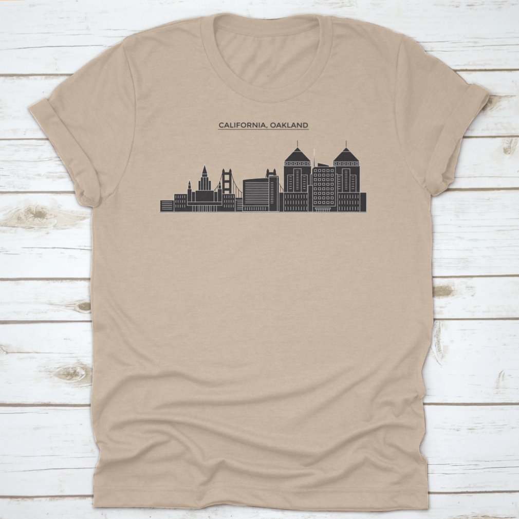 A stylish t-shirt featuring the Oakland city skyline, showcasing iconic architecture in a comfortable fit.