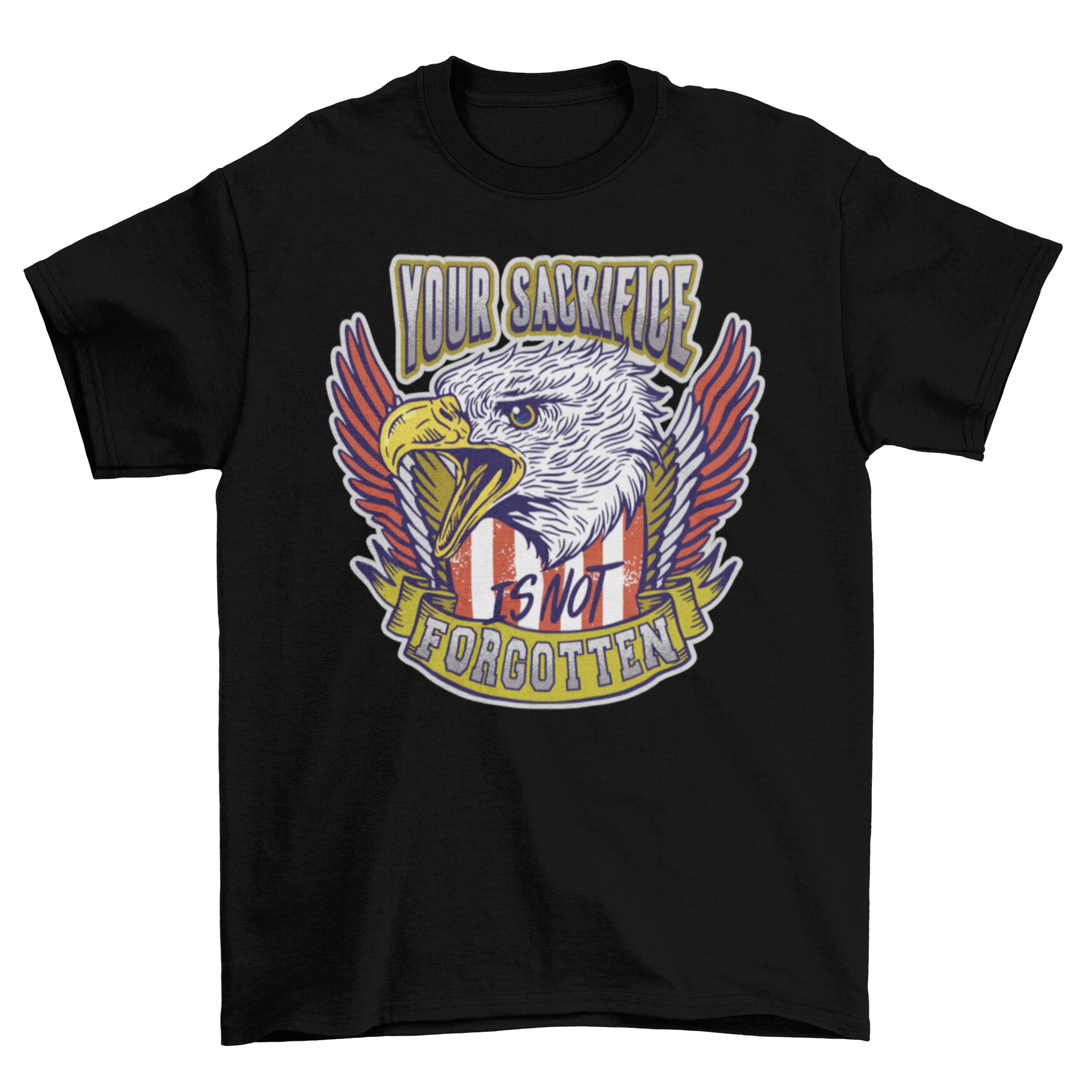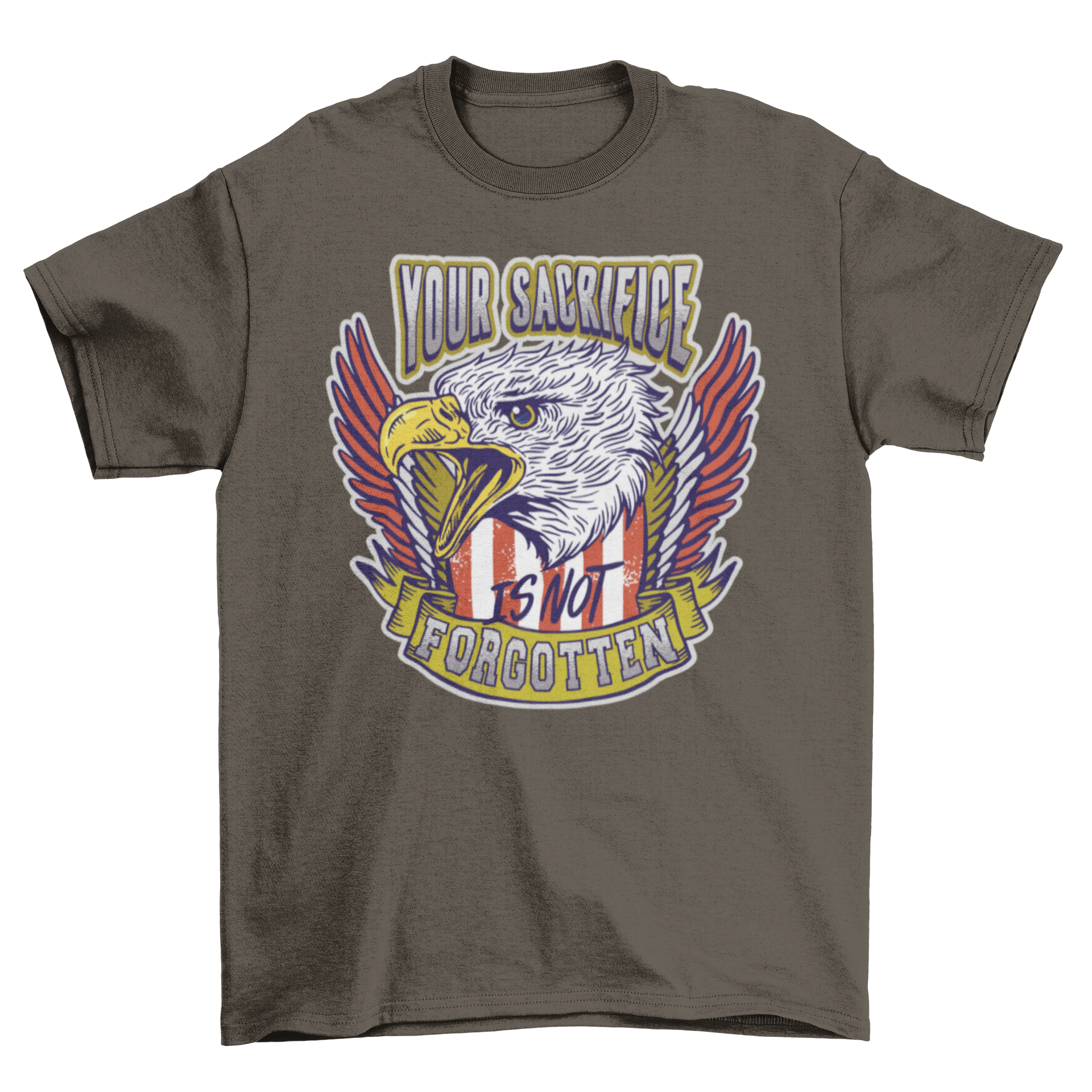 Celebrate the bravery and sacrifice of our veterans with the Veterans Day eagle quote t-shirt. This unique t-shirt features a striking design of an American eagle, symbolizing freedom and strength, paired with the heartfelt quote, "Your sacrifice is not forgotten." This powerful message serves as a reminder of the courage and dedication of those who have served in the armed forces.
