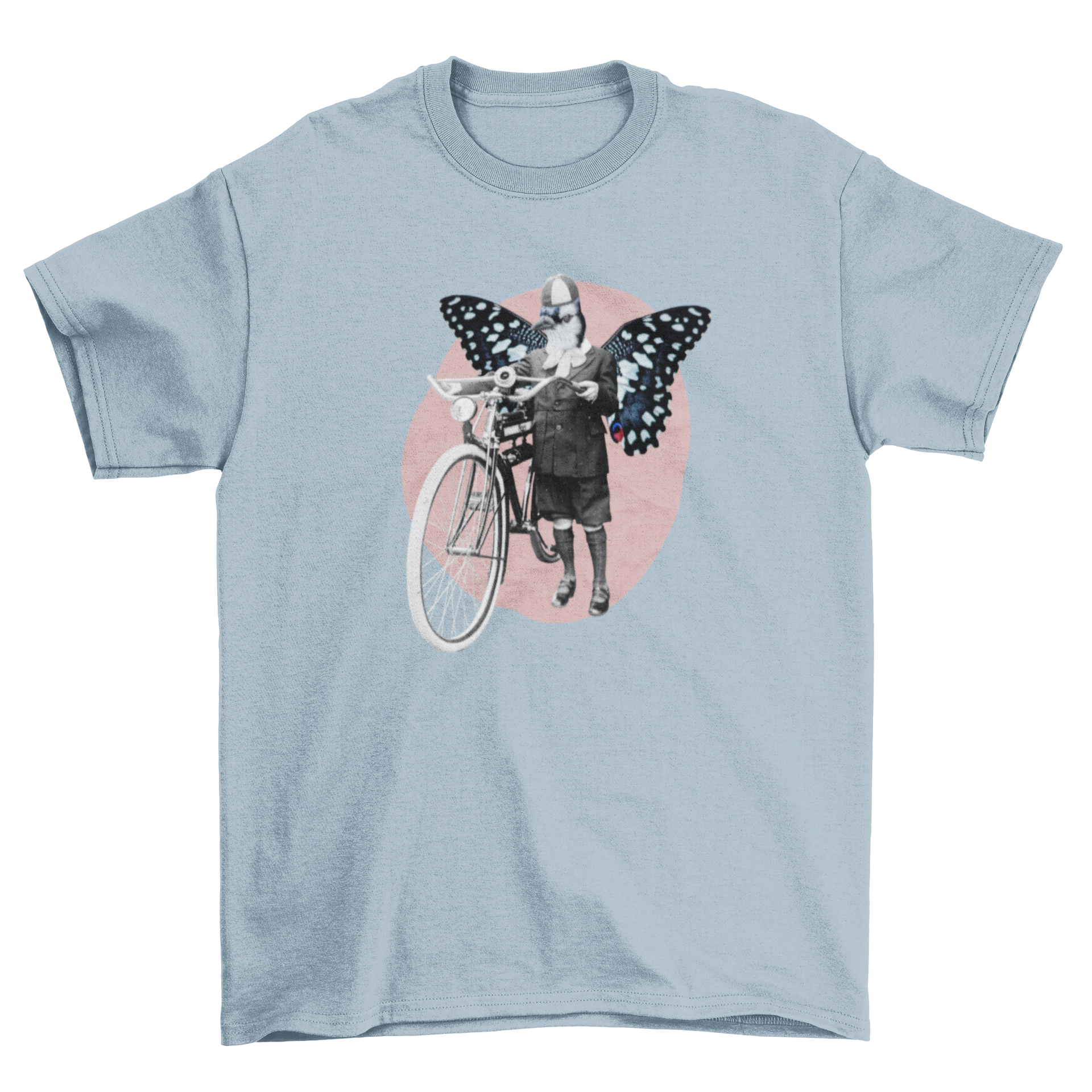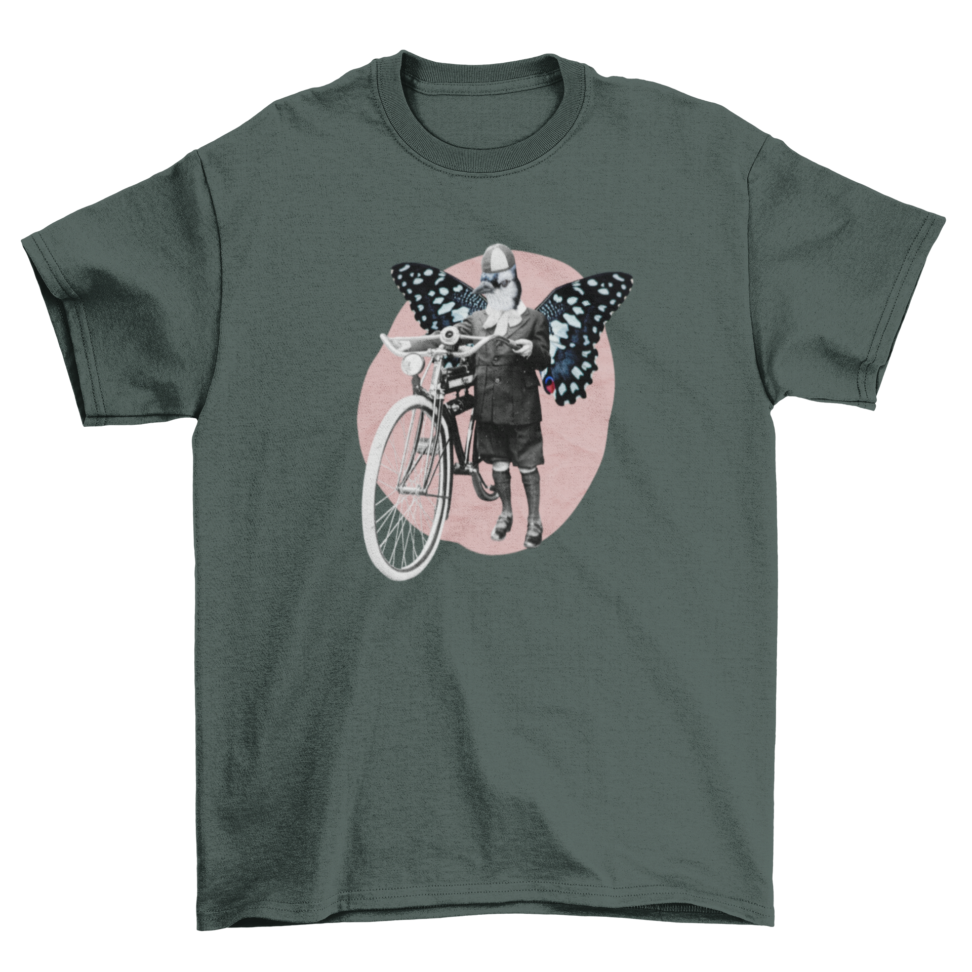 The t-shirt showcases a captivating collage that merges the beauty of nature with the charm of vintage bicycles. The butterfly wings symbolize freedom and transformation, while the bike represents adventure and exploration. This artistic representation is not just a fashion statement; it’s a celebration of individuality and creativity.