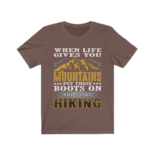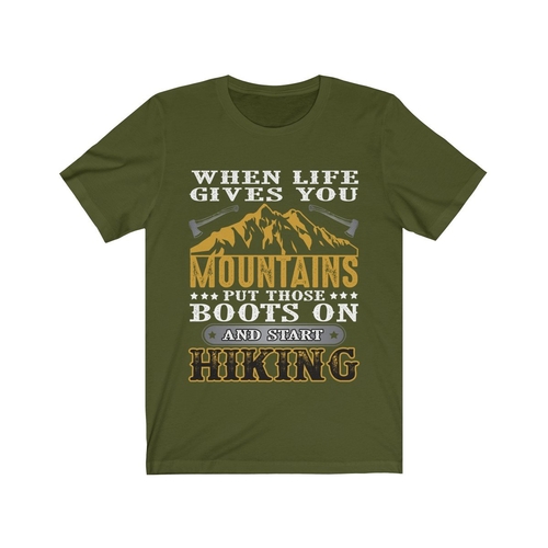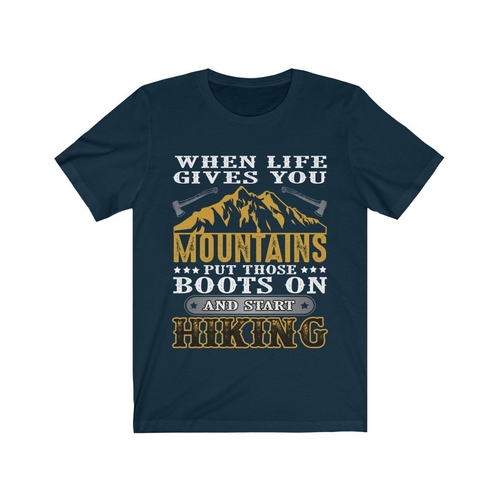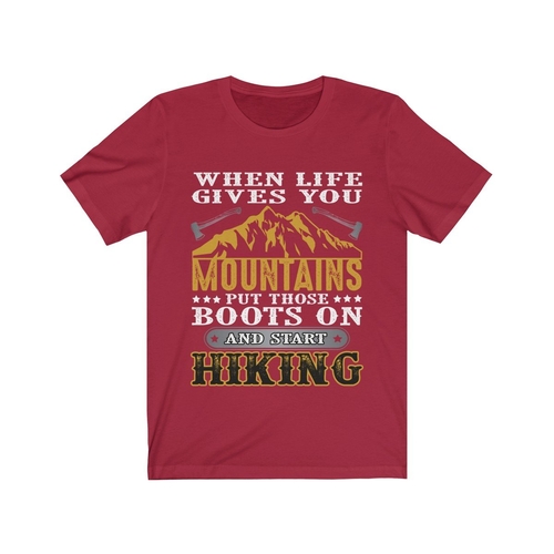 In summary, the 'When Life Gives You Mountains Put those Boots' T-shirt is more than just a piece of clothing; it's a statement of adventure and resilience. With its soft cotton material, unisex design, durable vinyl print, and American craftsmanship, this T-shirt is a must-have for anyone who loves the great outdoors. Don't miss out on the opportunity to add this stylish and meaningful T-shirt to your wardrobe today!