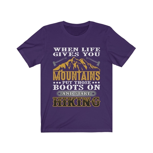 The eye-catching slogan, 'When Life Gives You Mountains Put those Boots,' is printed using high-quality vinyl that is designed to withstand the test of time. This durable print ensures that the design remains vibrant and intact, even after multiple washes. You can wear this T-shirt with pride, knowing that the message will continue to inspire you and those around you.