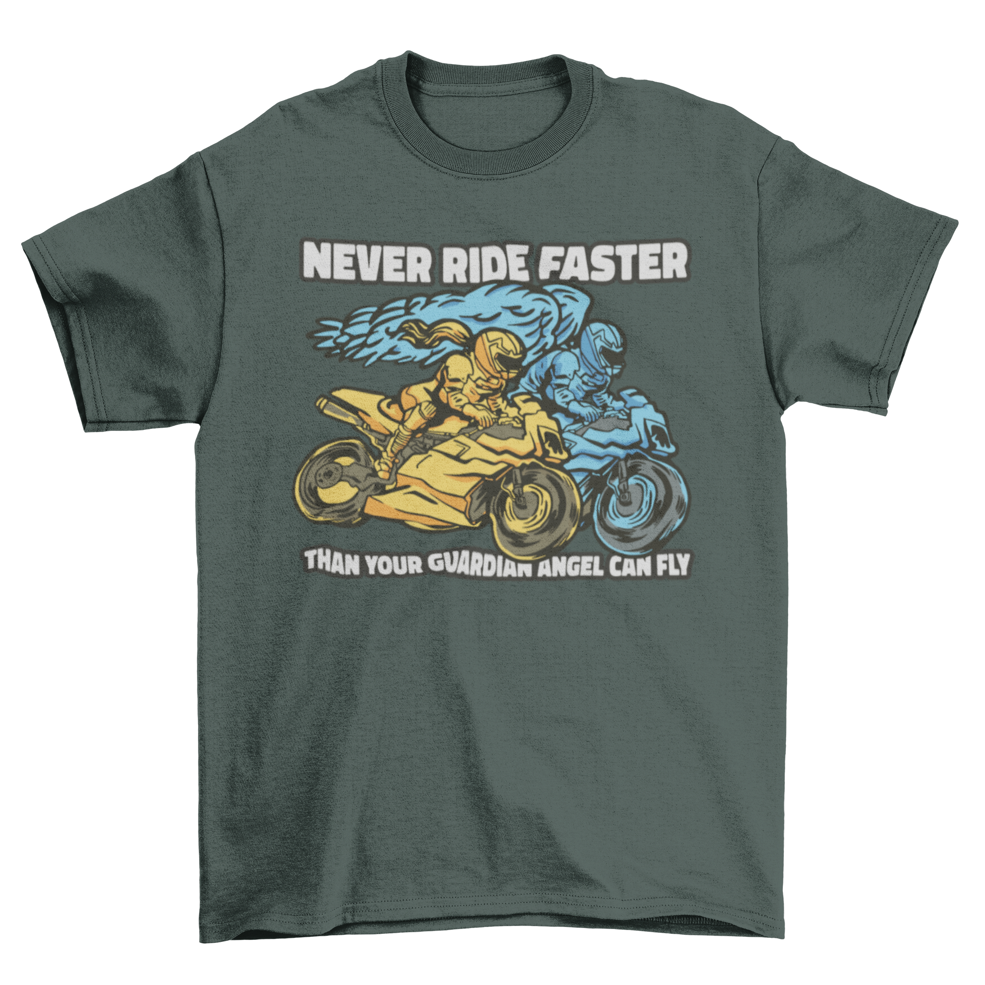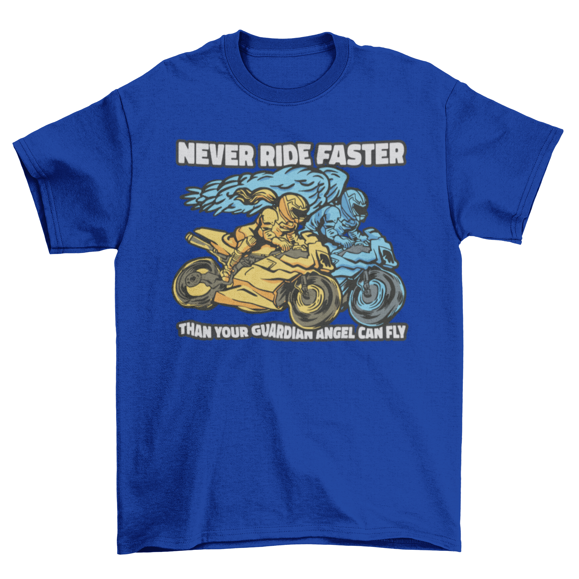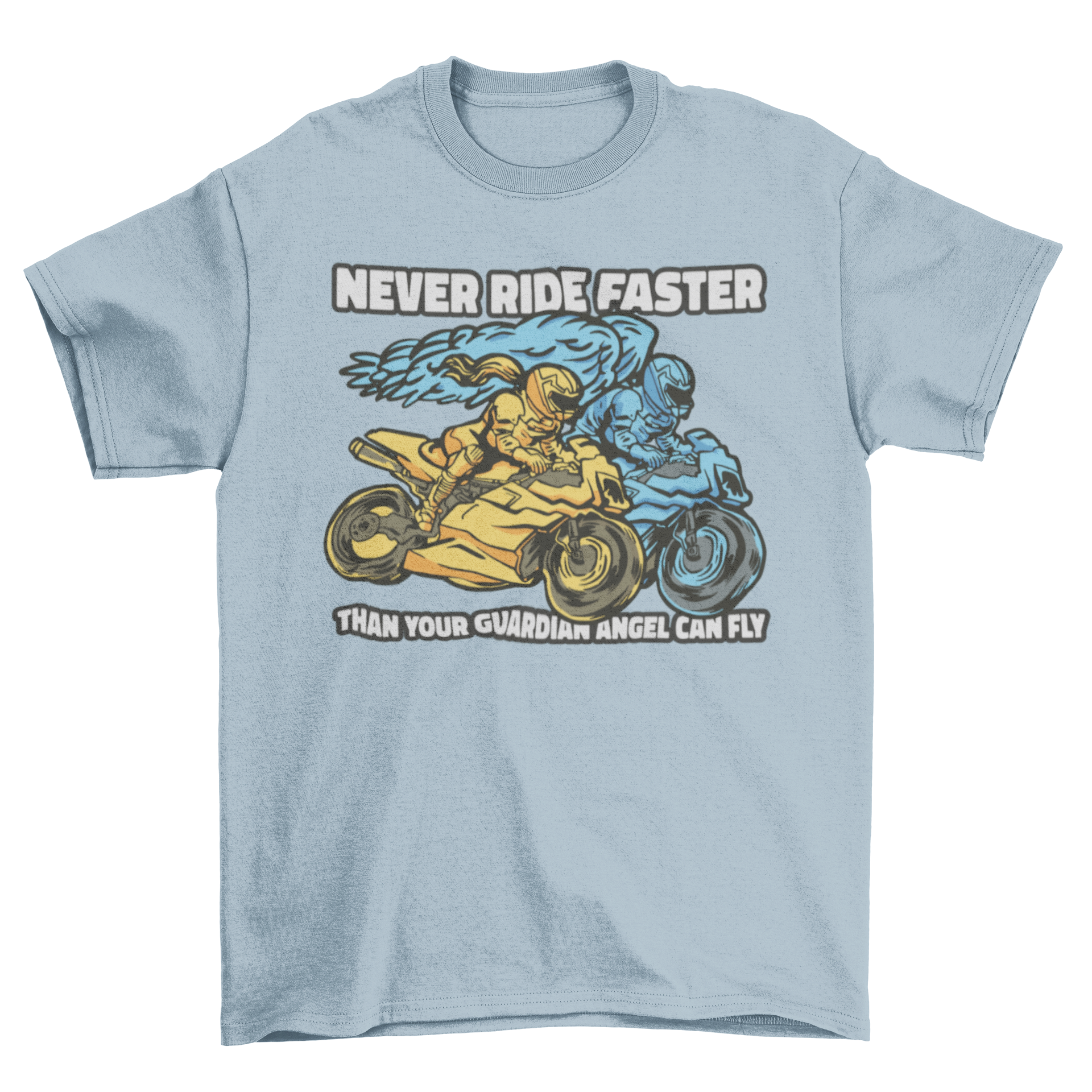 Introducing our stunning t-shirt design that beautifully captures the essence of freedom and adventure. This unique artwork features a woman and an angel riding a motorbike, symbolizing the thrill of the ride and the protective presence of a guardian angel. The accompanying quote, "Never ride faster than your guardian angel can fly," adds a touch of wisdom and humor, making it a perfect choice for motorcycle enthusiasts and those who appreciate a good ride.